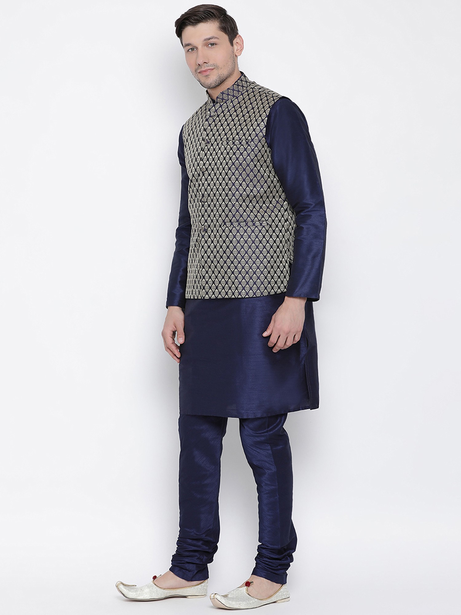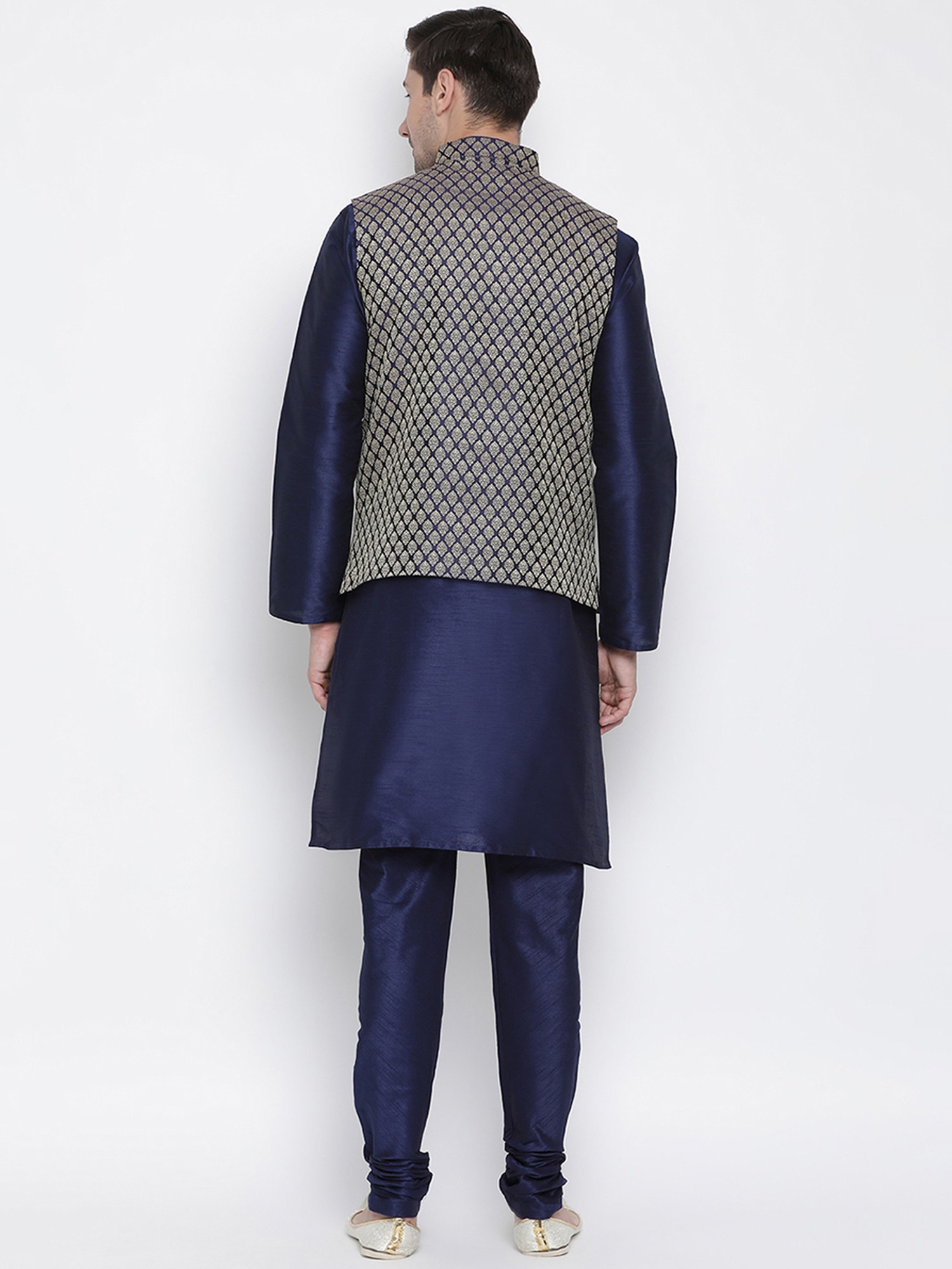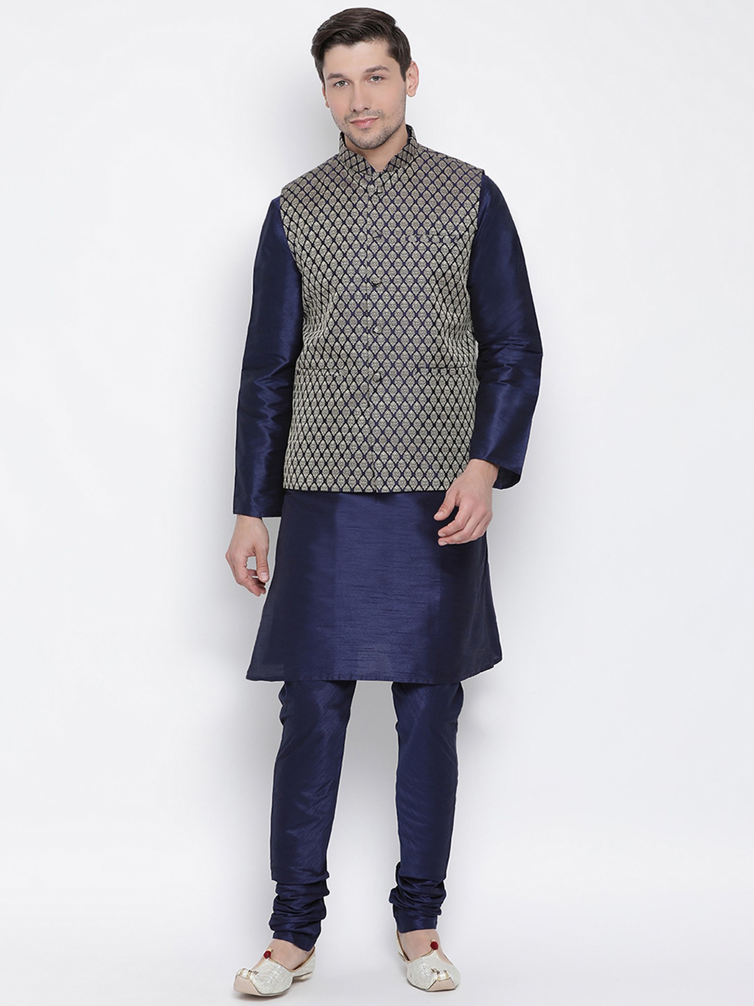 Crafted with finesse, this ensemble combines traditional elegance with a modern twist. The “Silk Blend Kurta Pajama” exudes comfort and sophistication, ensuring a relaxed fit and a touch of luxury. The accompanying “Modi Jacket” boasts intricate Jacquard weaving, adding a regal flair to your look. This outfit is perfect for special occasions, weddings, or cultural celebrations, effortlessly blending tradition and contemporary fashion. Make a lasting impression with this ensemble that beautifully merges comfort, craftsmanship, and timeless charm.