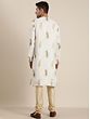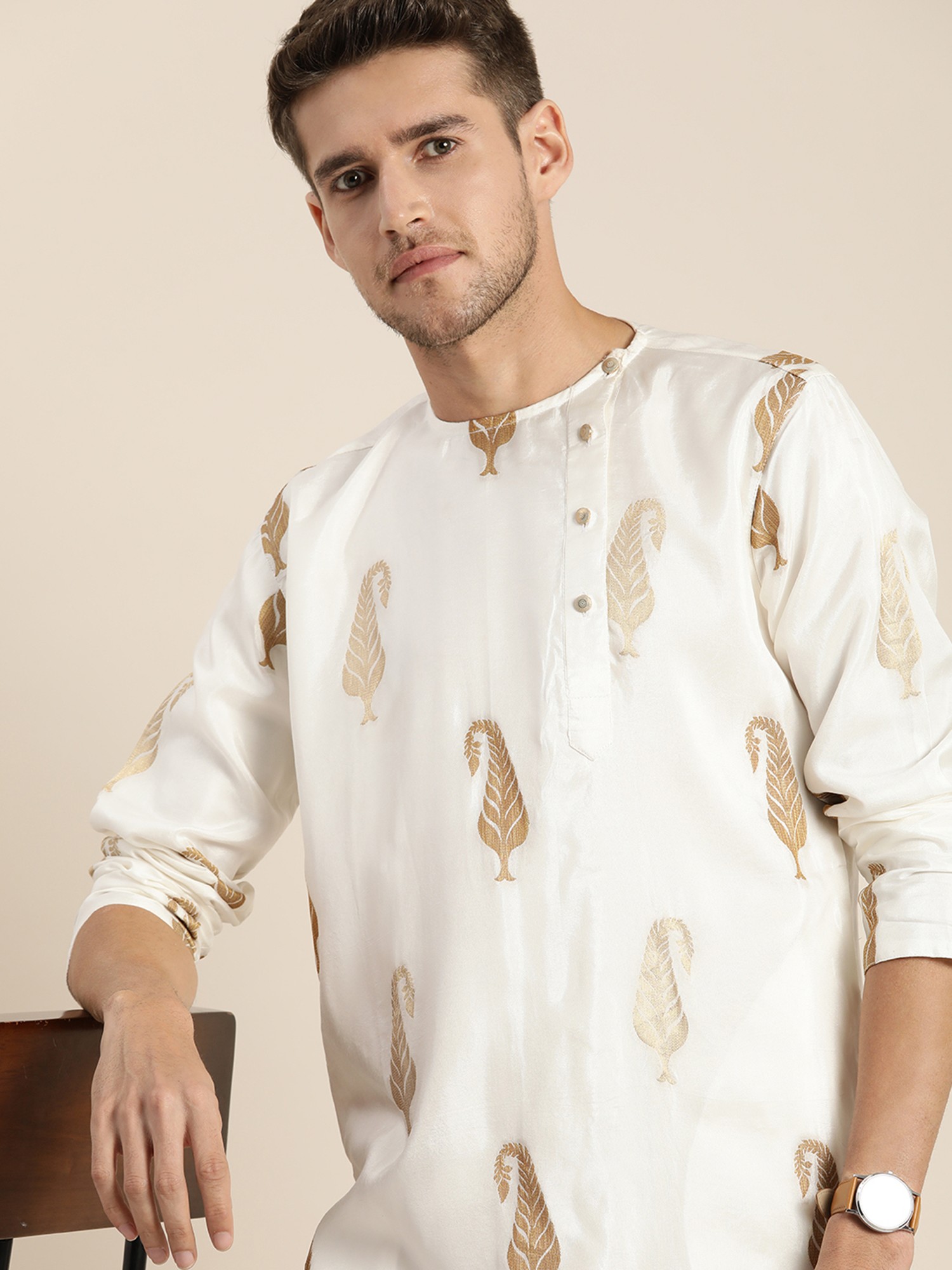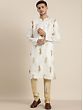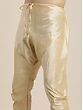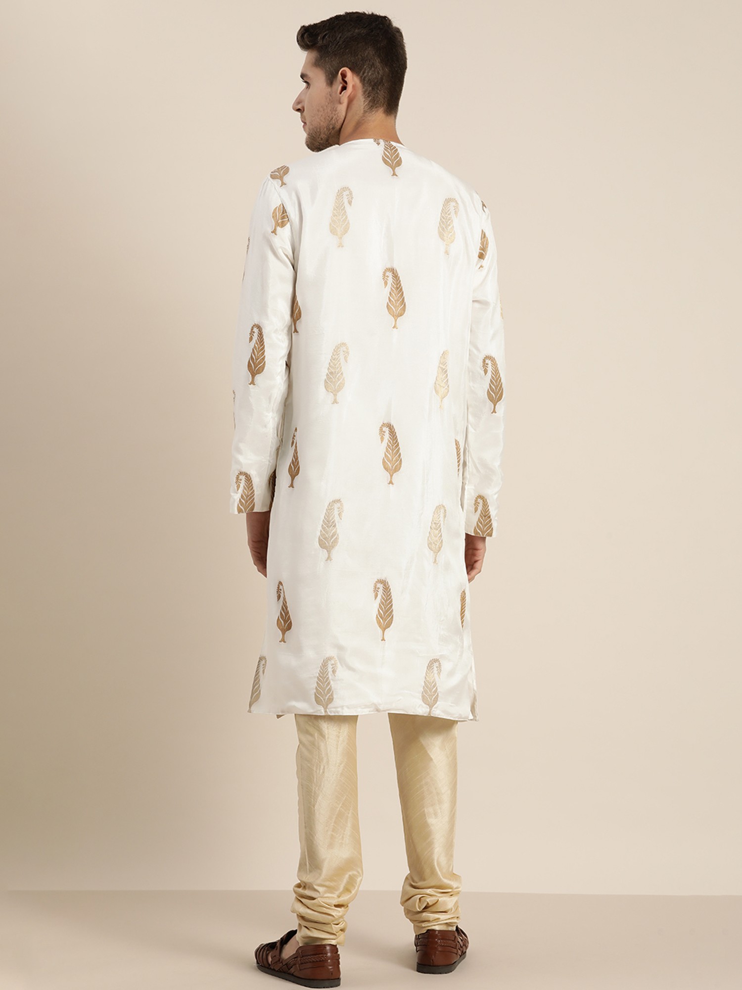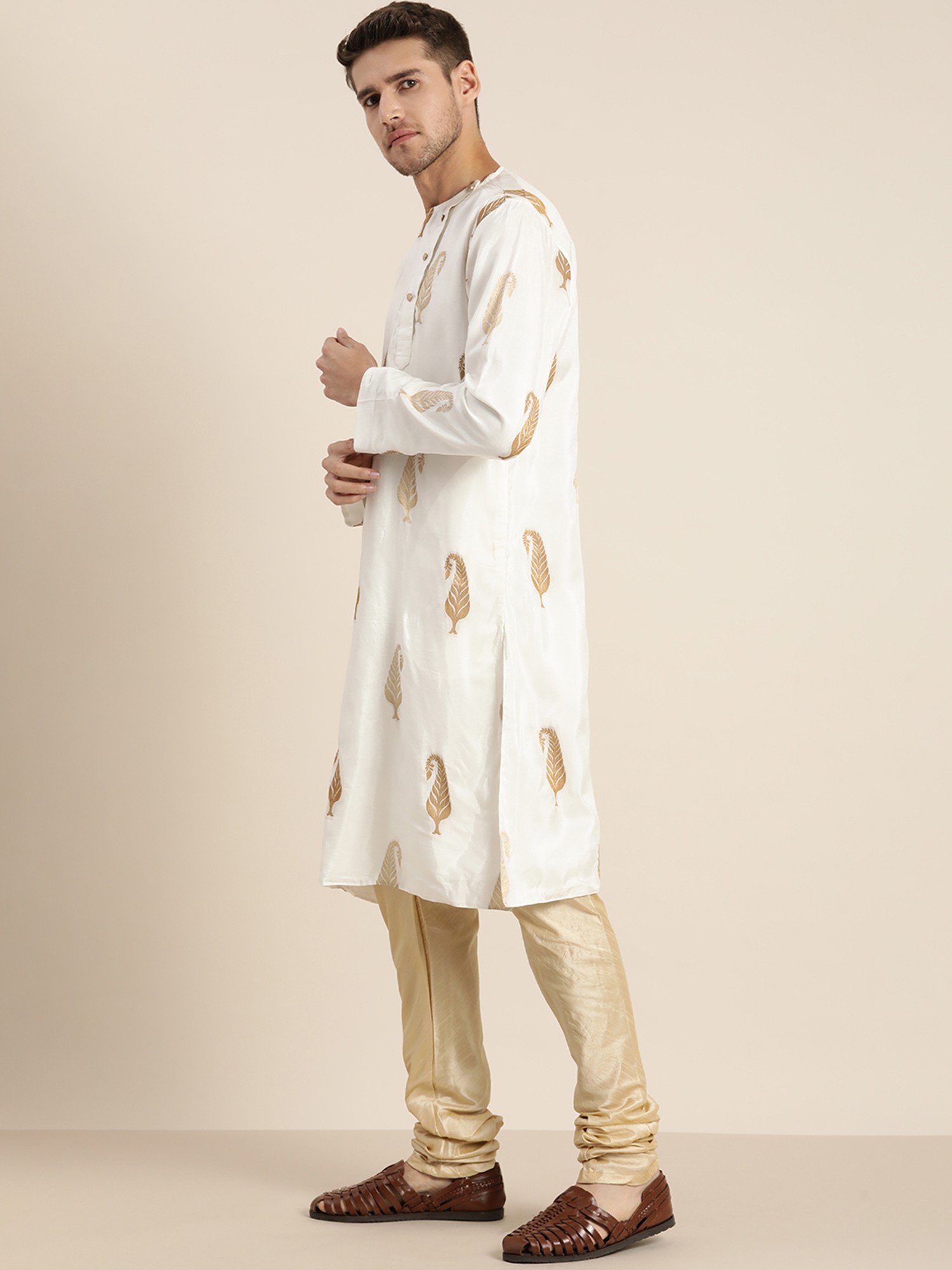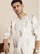 This regal ensemble weaves a tale of opulence and elegance, where the pristine White-Kurta is adorned with delicate “mango motifs”, reminiscent of an artist’s dreams. The silk blend fabric caresses the skin, offering a sensation of pure luxury. As the Kurta cascades, the golden “Churidar-Pajama” dances in perfect harmony, a gleaming partner in this visual symphony. This fusion of hues and textures is a tribute to the enchanting style, where tradition meets modernity in a mesmerising, spellbinding embrace.
