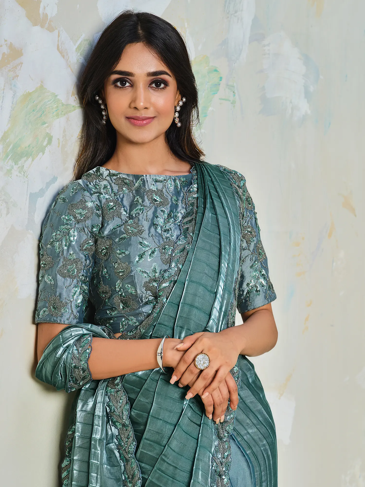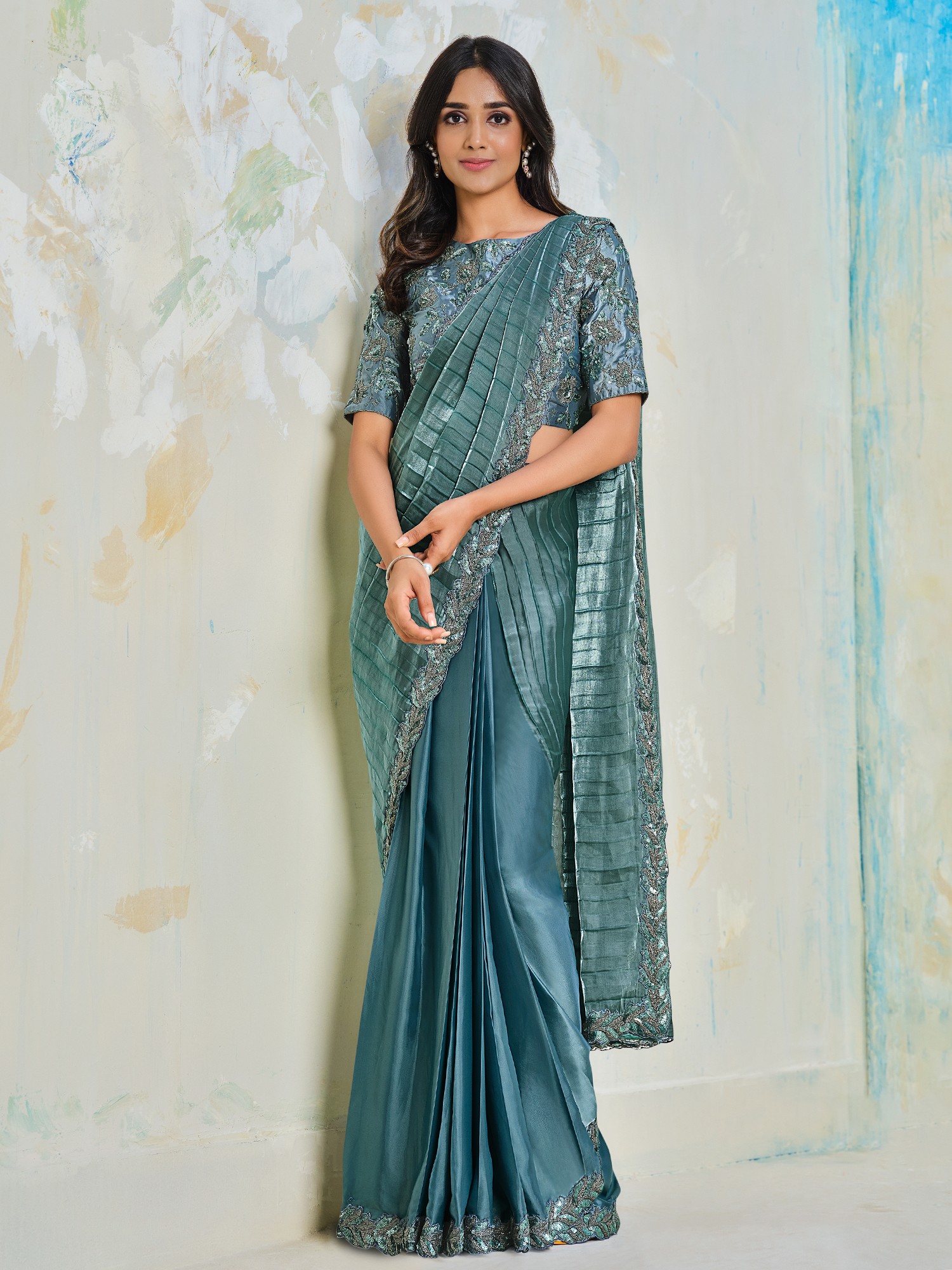 The true magic of this saree lies in its intricate embellishments and thoughtful design details. The border of the saree is adorned with meticulously placed sequins that catch the light with every movement, creating a subtle yet impactful sparkle. Complementing the shimmer of the sequins, delicate embroidery further elevates the design, adding a layer of artisanal craftsmanship. The pallu, draped with a pleated effect, showcases the exquisite detailing in a way that is both contemporary and classic, making it a true statement piece.