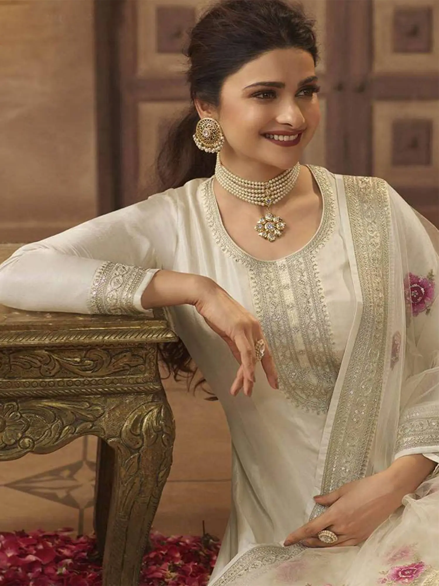 Immerse yourself in the captivating allure of this exquisite Anarkali gown. The gentle, flowing silhouette is designed to enhance your natural grace, while intricate details elevate the design to a realm of sophisticated beauty. This piece is more than just clothing; it's a statement of timeless elegance and cultural richness. Crafted from luxurious silk, the gown drapes beautifully, creating a flattering and comfortable fit. The fabric's subtle sheen adds a touch of understated glamour, making it perfect for both daytime celebrations and evening events. Its fluidity allows for graceful movement, ensuring you feel confident and poised with every step.