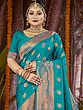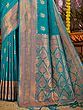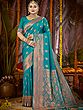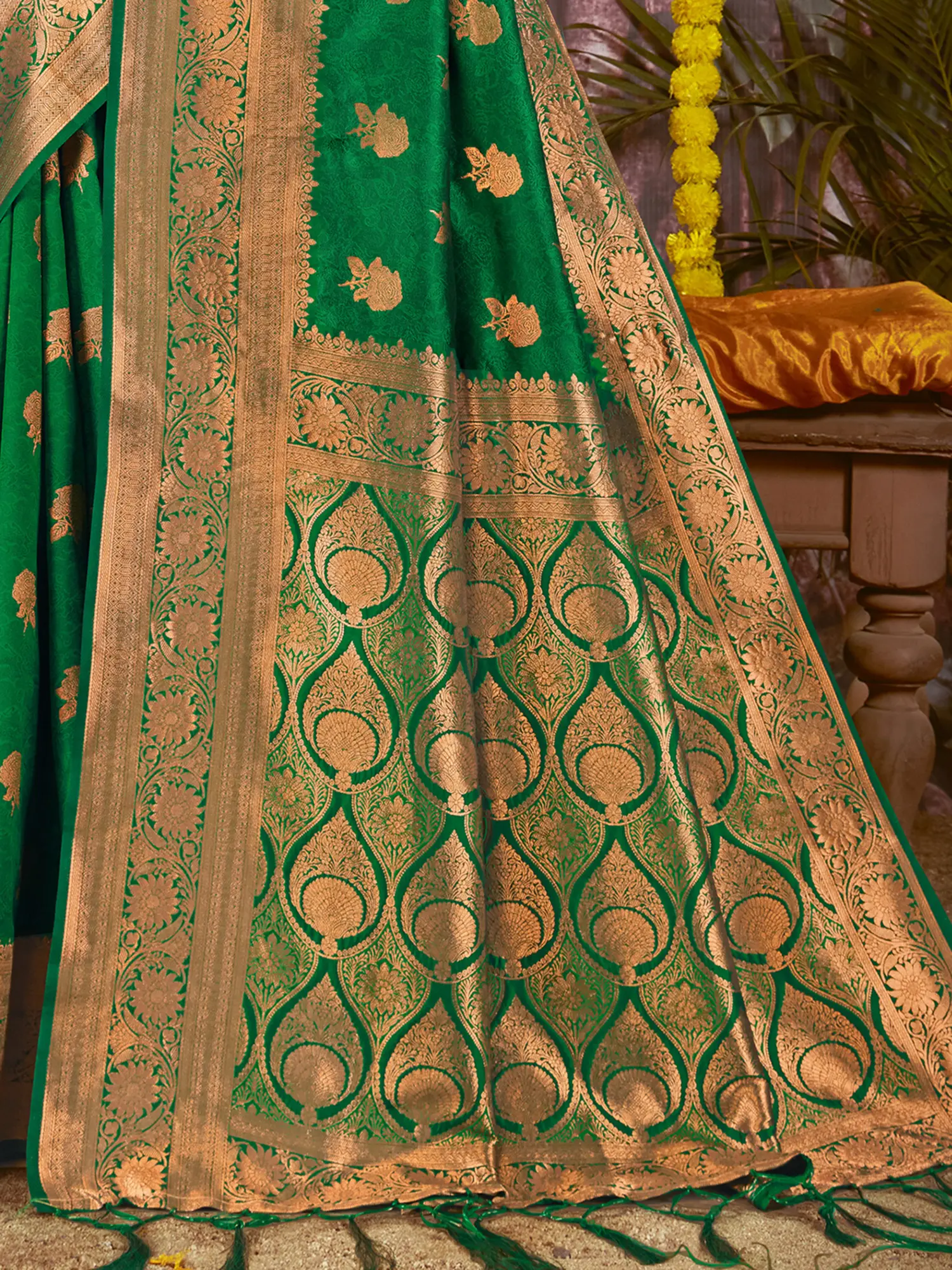 The vibrant hue of the saree immediately captures the eye, creating a refreshing and sophisticated look. The broad border, adorned with intricate detailing, frames the saree beautifully, enhancing its overall appeal. Delicate floral motifs are scattered throughout the body of the saree, adding a touch of nature-inspired charm to the design. The contrasting pallu is a masterpiece in itself, featuring a rich pattern that adds depth and dimension to the ensemble. This interplay of color and pattern makes this saree a true work of art.