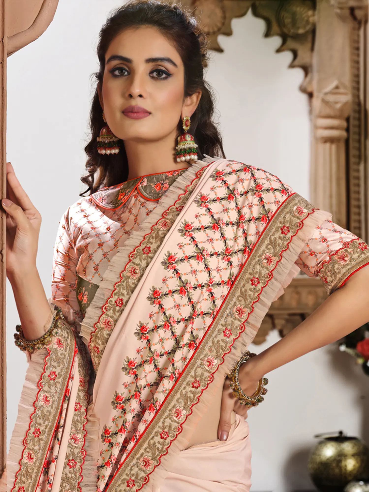 Peach Digital Floral Print Organza Saree with Woven Border