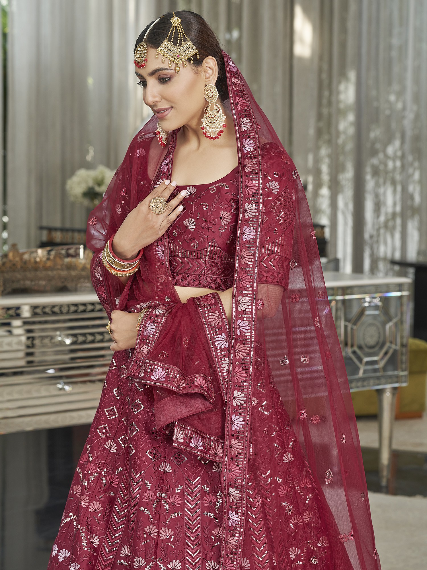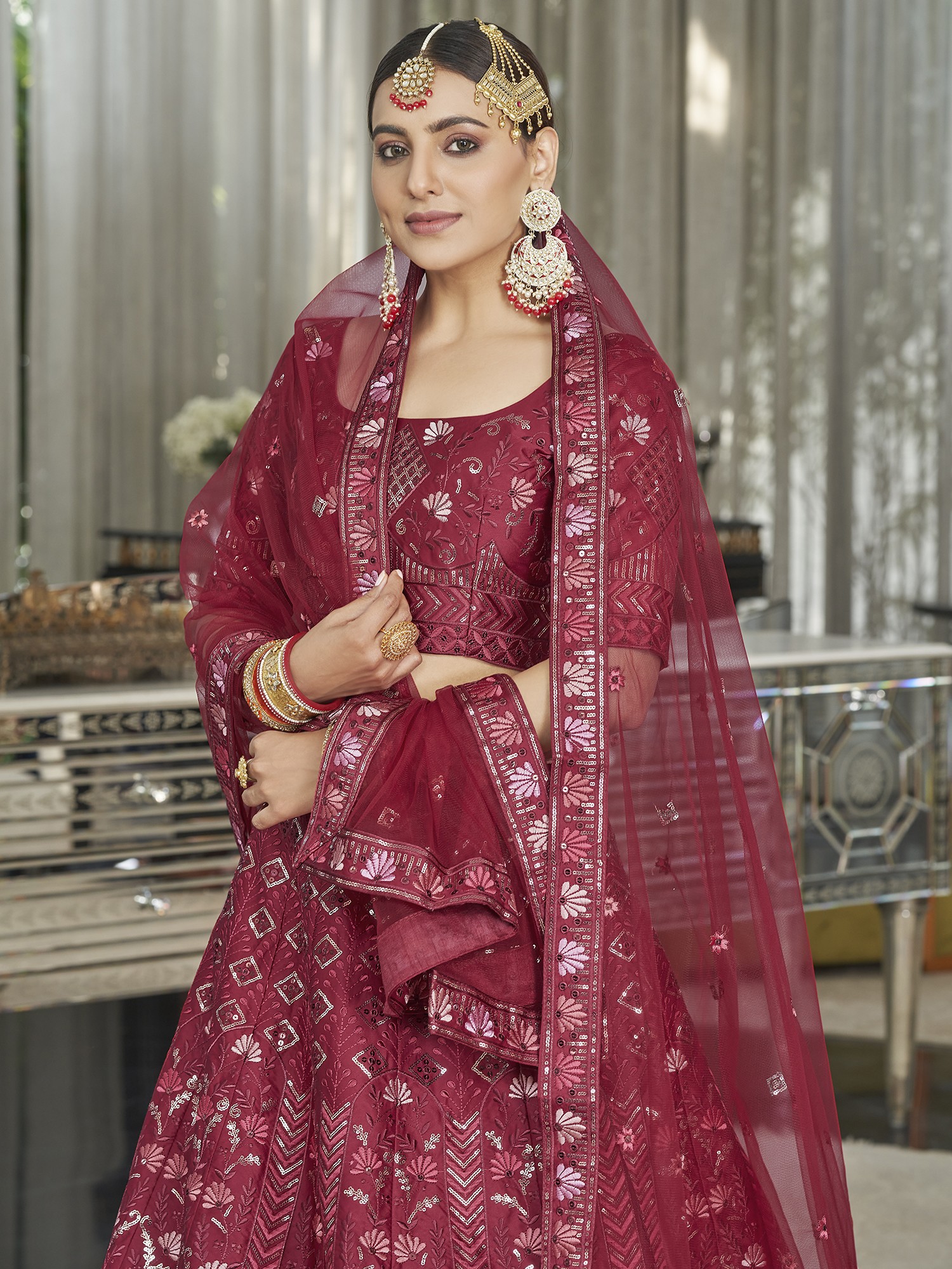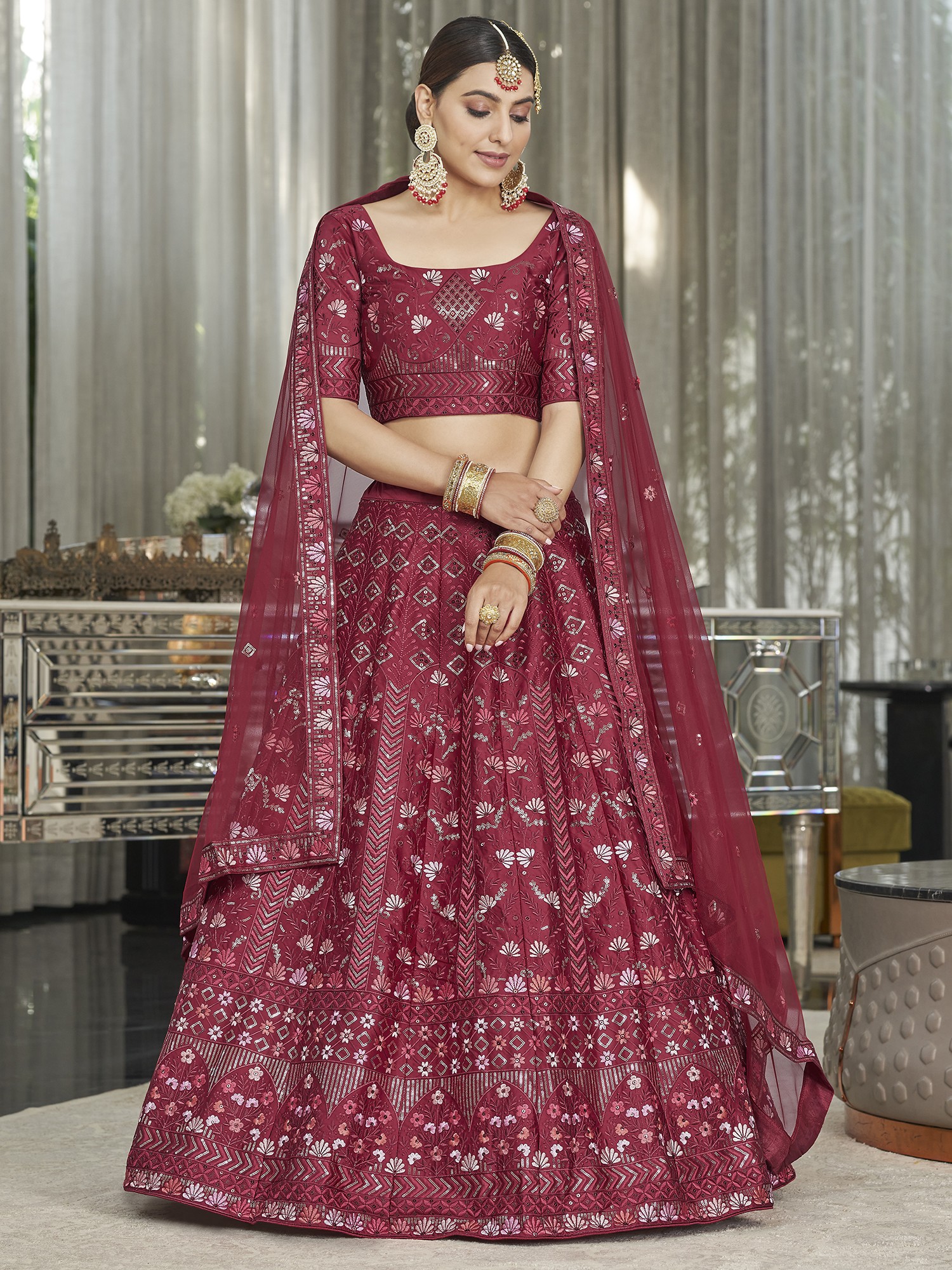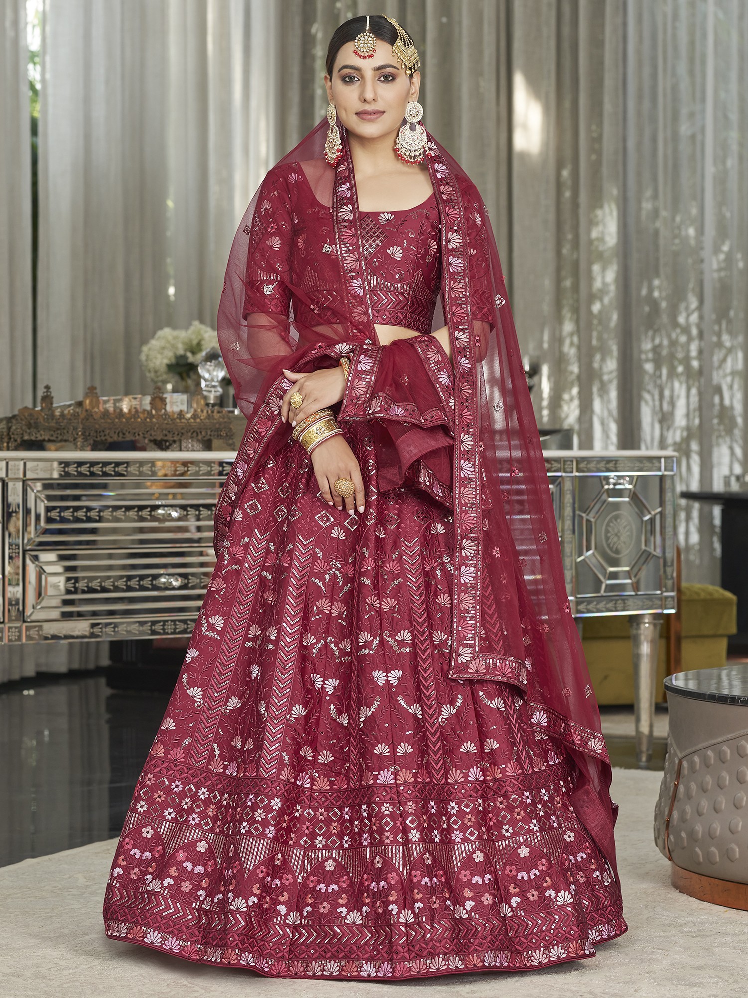Maroon Taffeta Silk All Over Zari Butis Lehenga Choli with Soft Net Dupatta