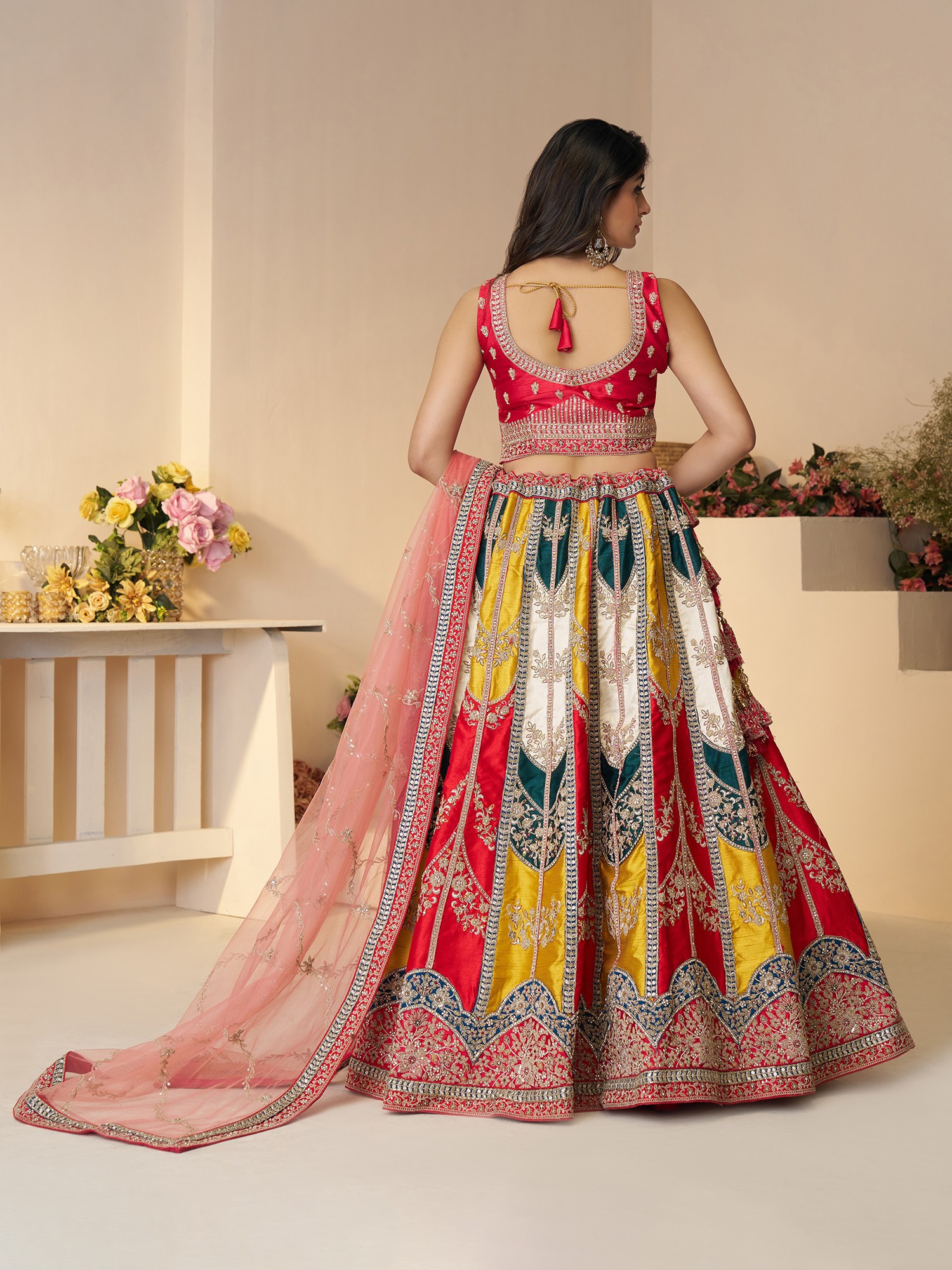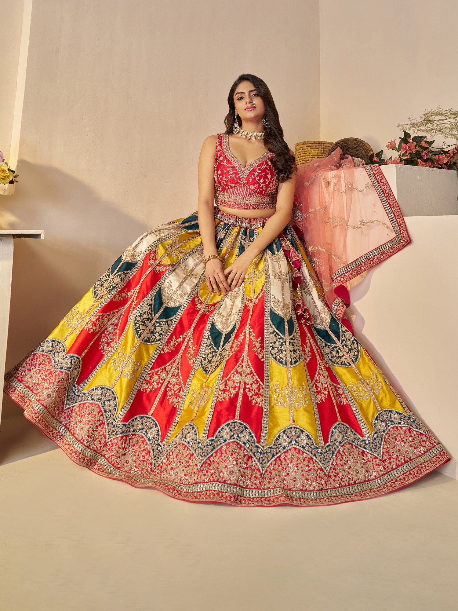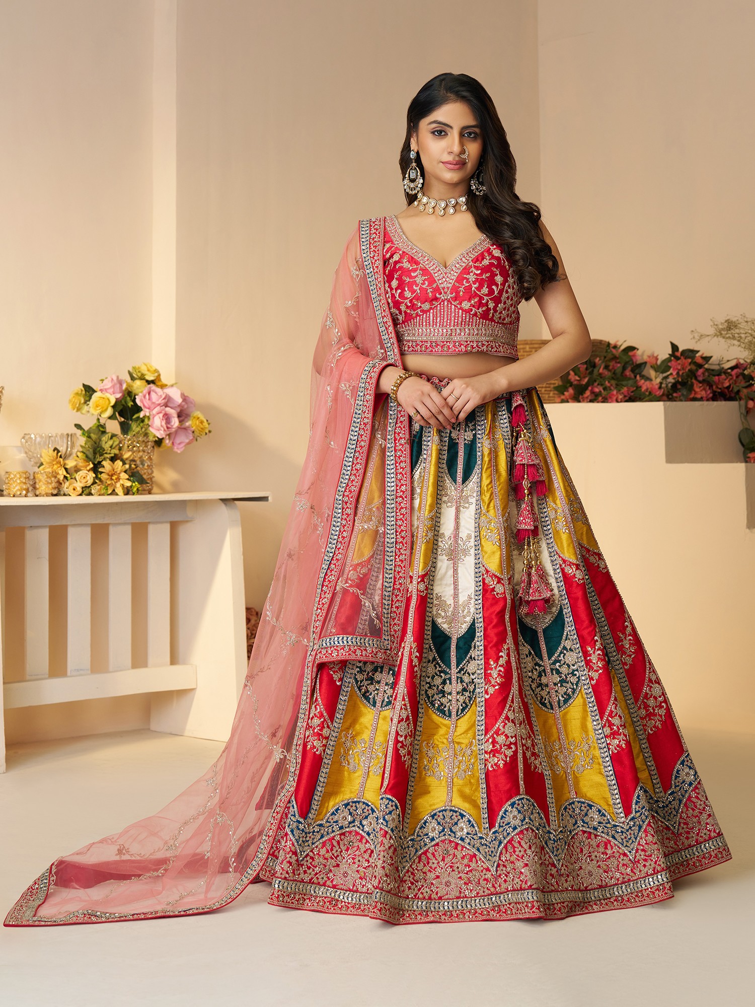 Elegant Multicolor Embroidery And Sequins Work Chinon Silk Lehenga Choli With Net Dupatta
