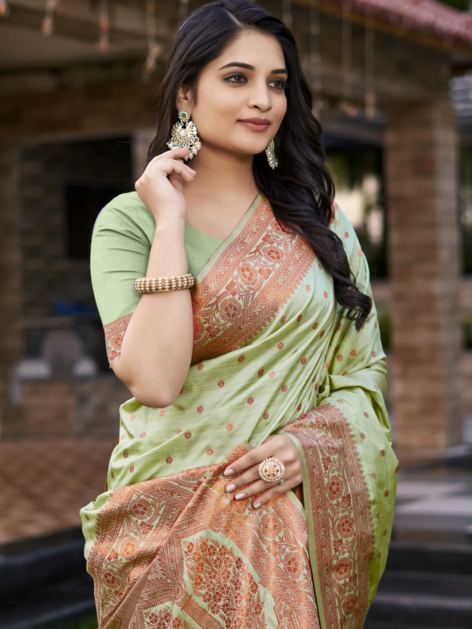 This light green silk saree is an ideal choice for wedding guest attire and festive celebrations.