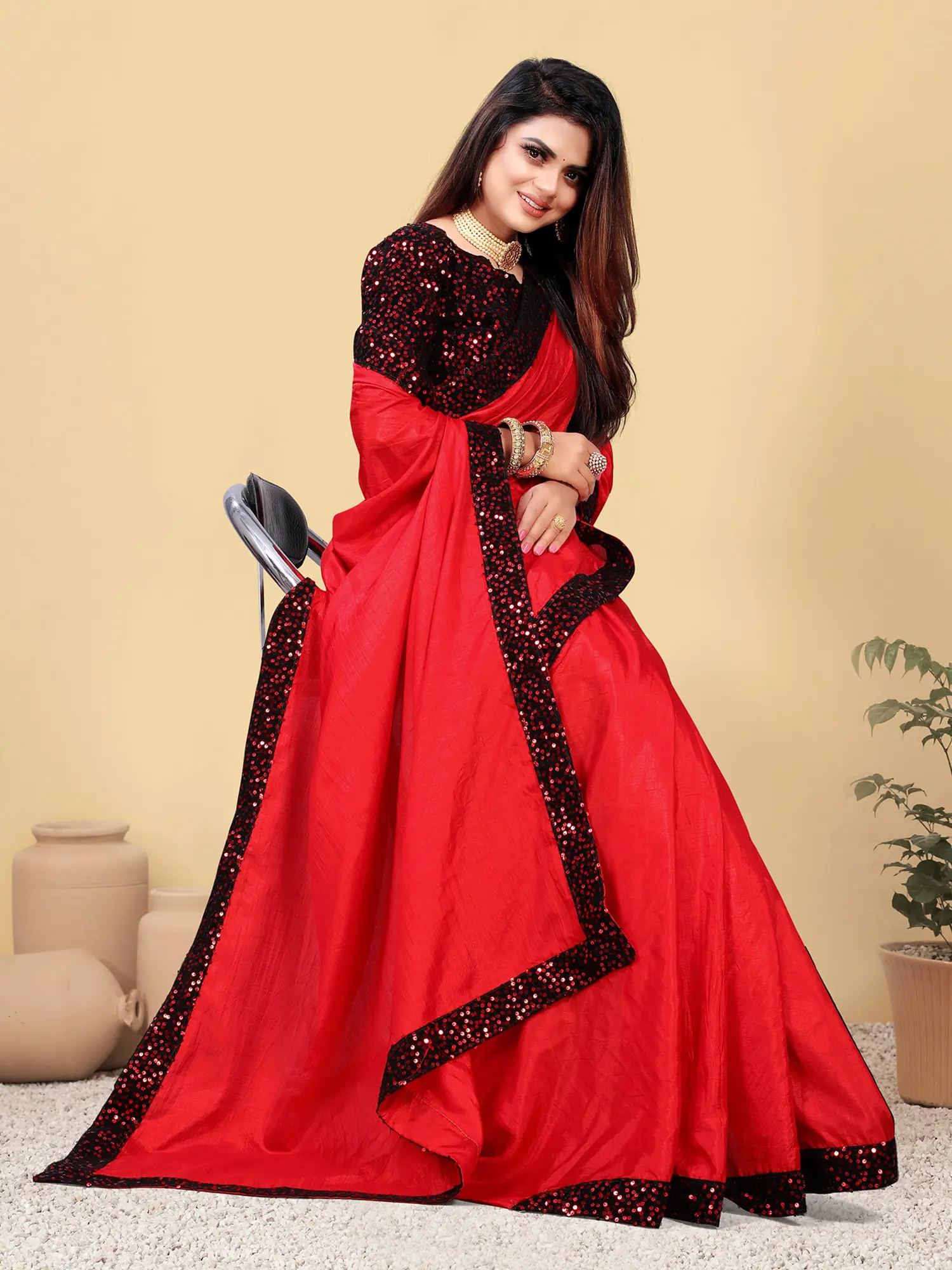 Rythmic-Red Sequins and Kantha Embroidered Crepe Saree with Printed Flowers