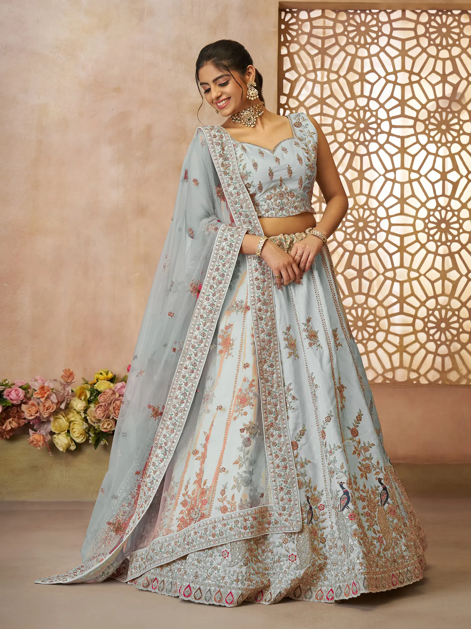 Teal Taffeta Silk Beautiful Floral Zari Embroidery Lehenga Choli with Beige Sheer Dupatta
