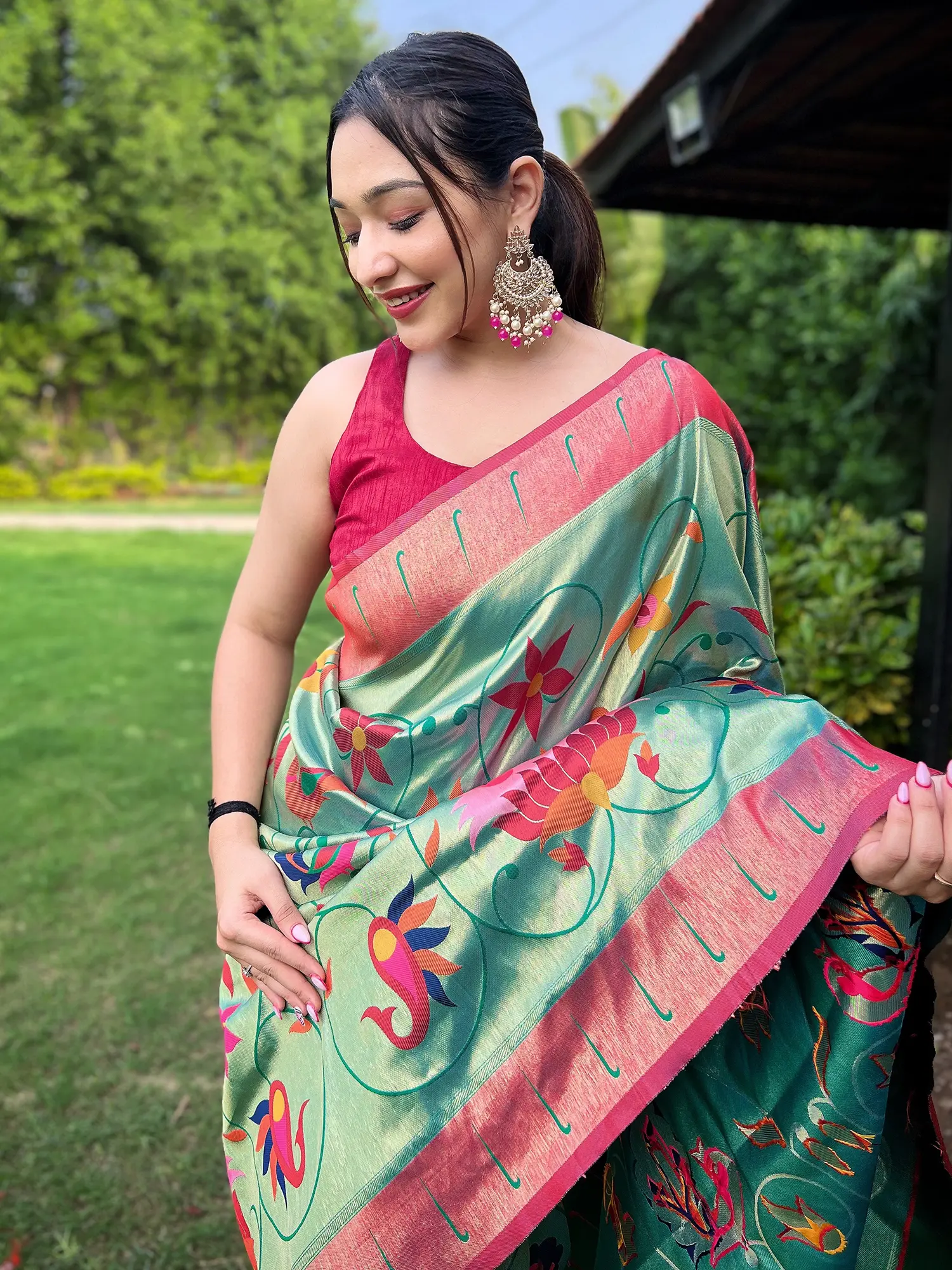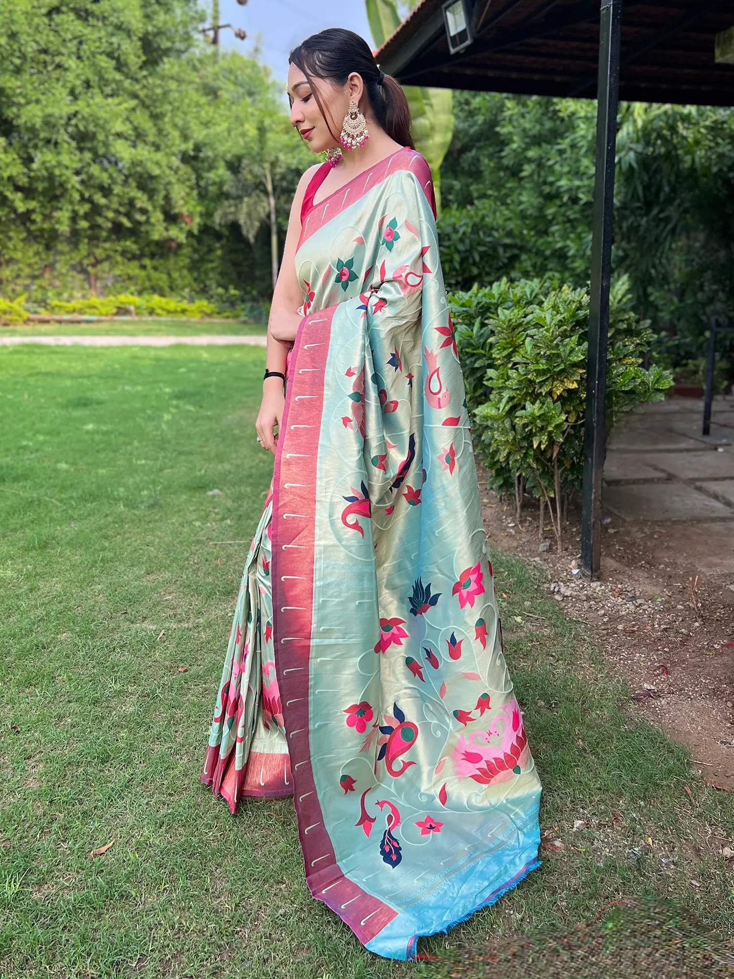 Designed with the modern woman in mind, this saree is ideal for various celebratory events, from weddings and receptions to festive gatherings and formal parties. Its unique blend of traditional weaving techniques and contemporary design ensures you'll stand out with effortless grace. The vibrant floral pattern makes it a cheerful yet sophisticated choice for daytime events, while its inherent luxury suits evening celebrations perfectly. Complement it with statement jewelry and classic footwear to complete your regal look. This saree is more than just an outfit; it's an experience, a connection to rich cultural traditions, and a symbol of refined taste.