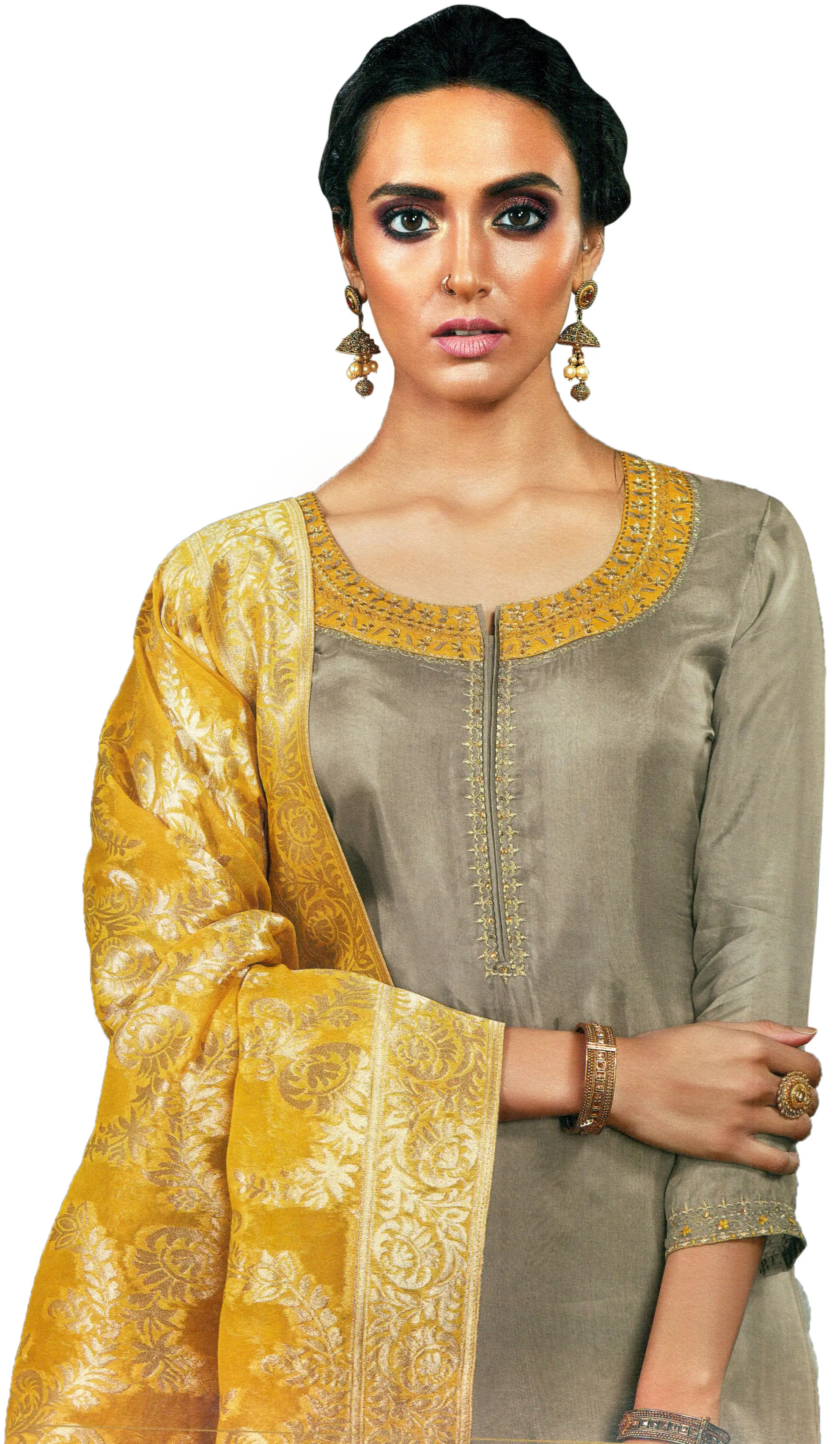 Complementing the serene elegance of the taupe kameez is a breathtakingly vibrant dupatta. Woven with shimmering zari threads, this yellow masterpiece is a celebration of opulence and tradition. The rich, golden hue evokes a sense of joy and festivity, making it the perfect accessory to elevate any outfit. The entire expanse of the dupatta is intricately patterned with traditional motifs, creating a mesmerizing visual texture that is both striking and sophisticated. The borders are finished with a beautifully detailed zari weave, framing the radiant fabric with an ornate flair. This dupatta is more than just an accessory; it's a statement of celebratory style and cultural richness, designed to make heads turn. This Simply-Taupe Palazzo Salwar Kameez set is a testament to timeless style and exquisite craftsmanship. The harmonious blend of the sophisticated taupe with the radiant yellow dupatta creates a look that is both elegant and eye-catching. Perfect for weddings, festivals, parties, or any occasion where you want to feel beautifully dressed, this ensemble offers a perfect balance of comfort, style, and traditional Indian artistry. Step out with confidence and grace, enveloped in the luxurious embrace of silk and the dazzling allure of zari.