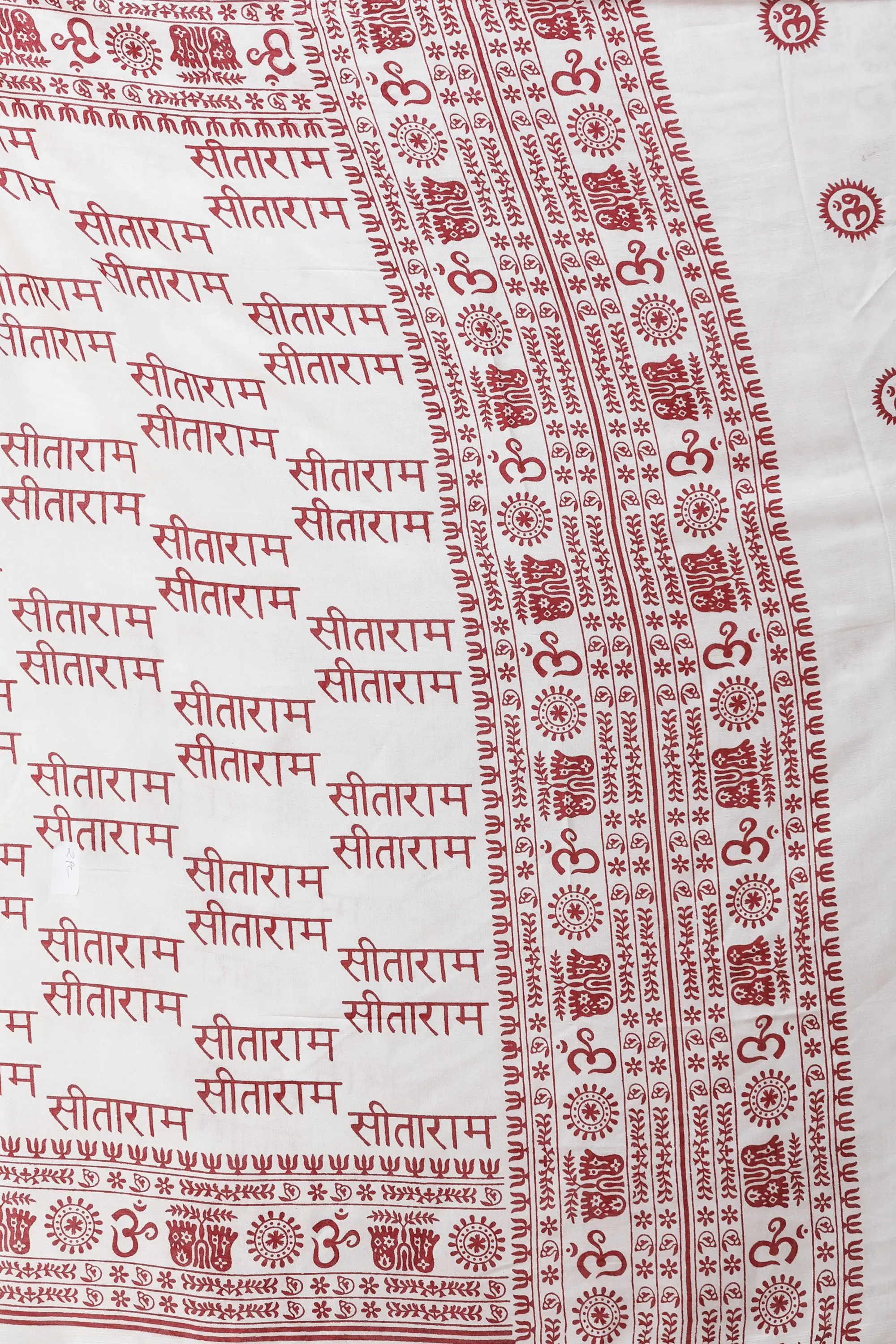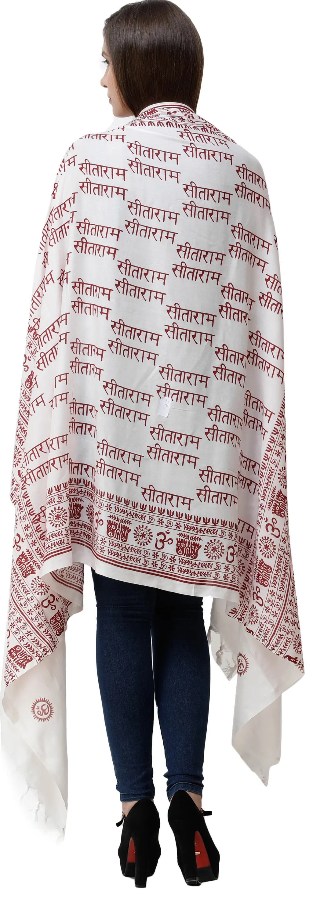 The fabric of this shawl is adorned with a harmonious arrangement of powerful religious motifs. The omnipresent "Om" symbol, representing the primordial sound of the universe, is elegantly woven throughout, inviting peace and mindfulness. Alongside it, the revered names of Sita and Ram are inscribed in elegant script, invoking the divine couple's grace, devotion, and unwavering commitment. These sacred texts and symbols are not merely decorative; they are imbued with spiritual energy, designed to enhance your meditative practice and bring a sense of sacredness to your surroundings. The rich, contrasting colors create a visually striking piece that is as aesthetically pleasing as it is spiritually significant.