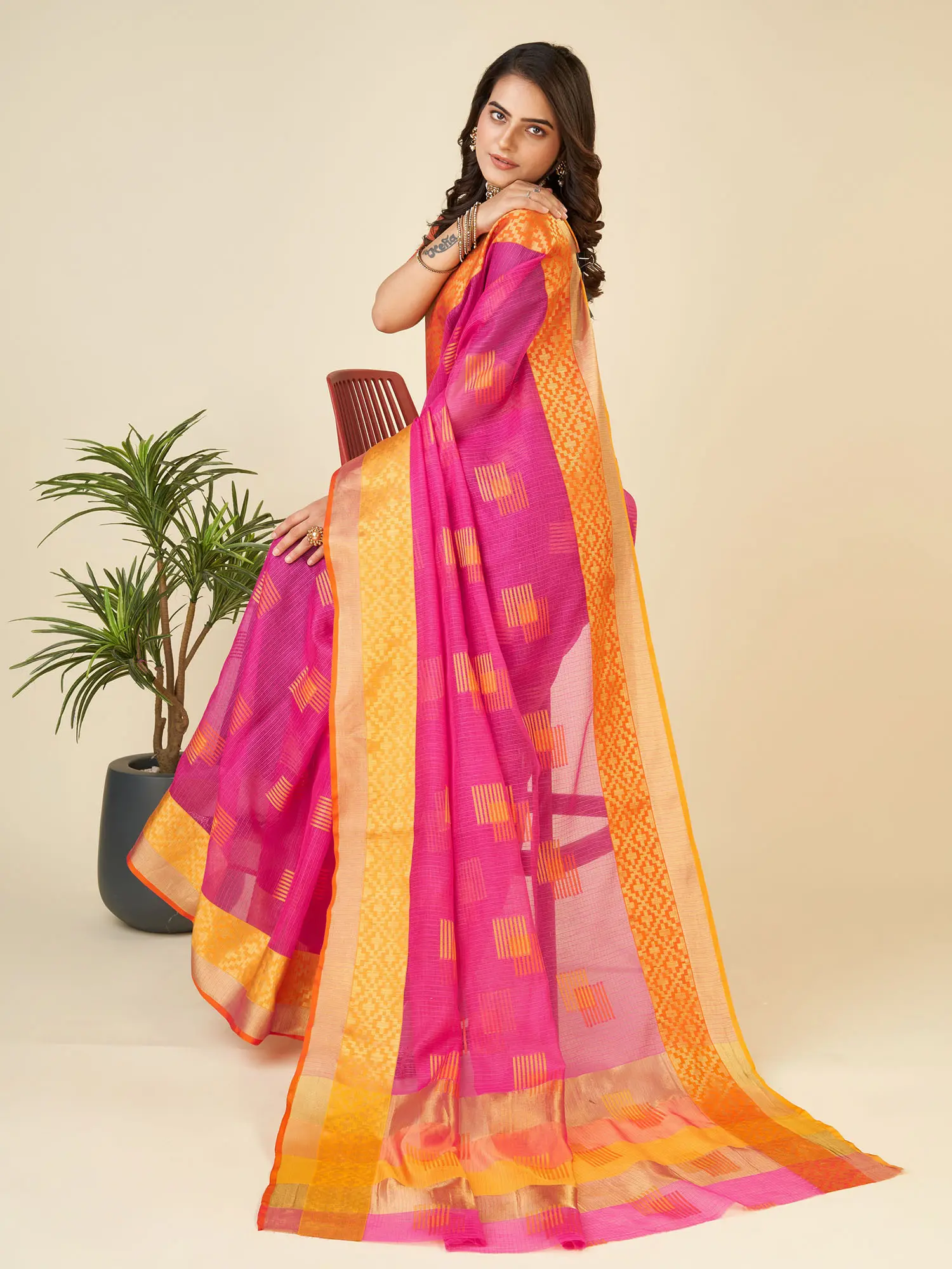 Silk Saree with Zari-Woven Border and Geometric Motifs All-Over