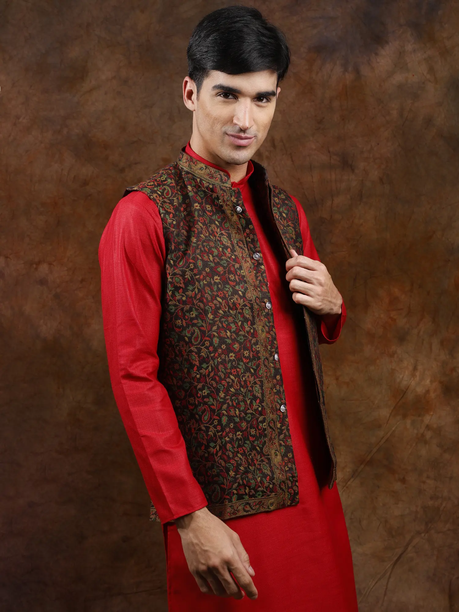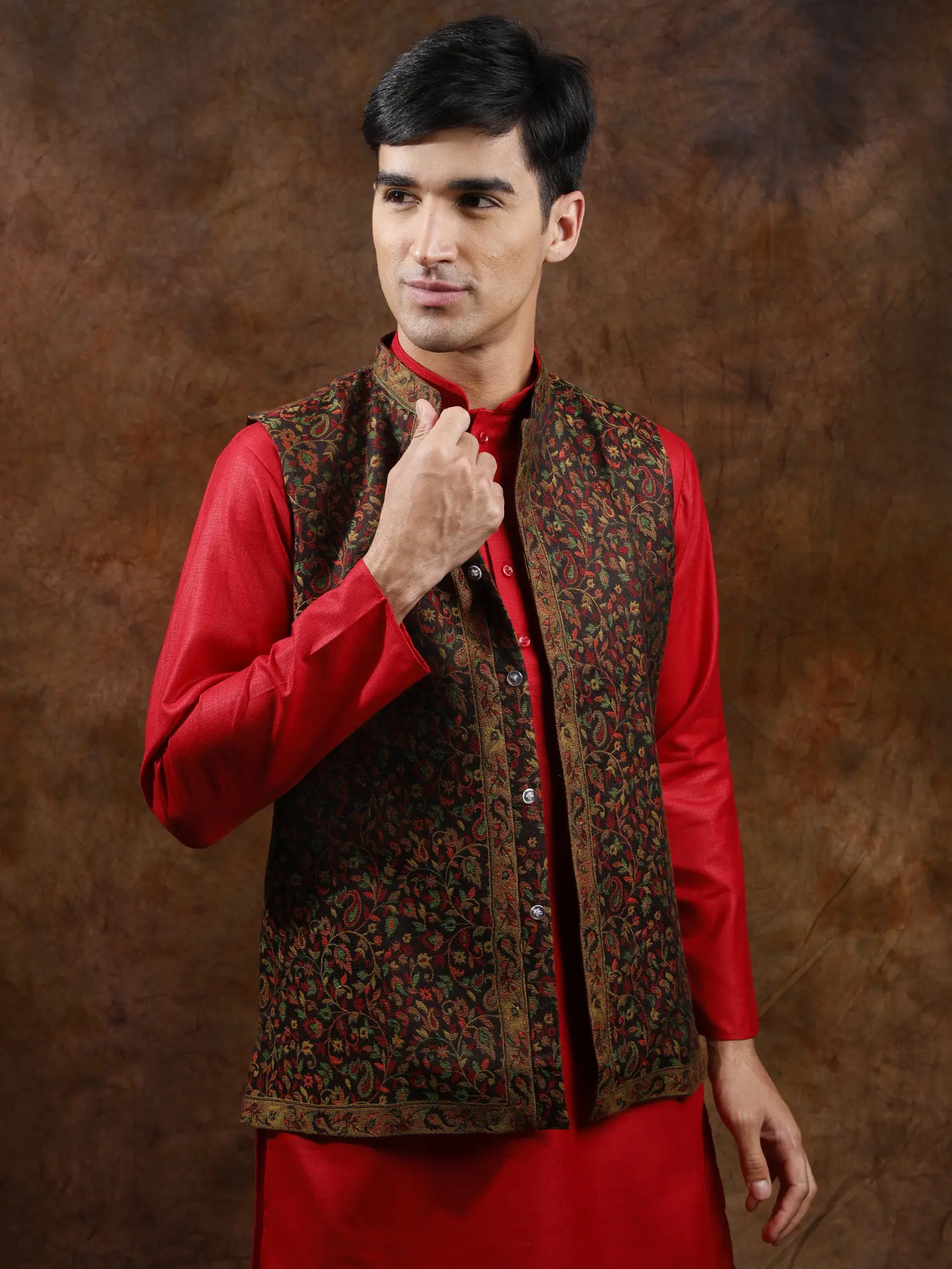Elevate your ethnic wardrobe with this exquisite Nehru jacket, a masterpiece of traditional Indian craftsmanship. Crafted from fine wool, this piece is designed to offer both comfort and a distinguished aesthetic, perfect for those who appreciate the finer details in their attire. The deep slate-black hue serves as a sophisticated canvas for the intricate Kani Jamawar weaving that adorns its entirety.