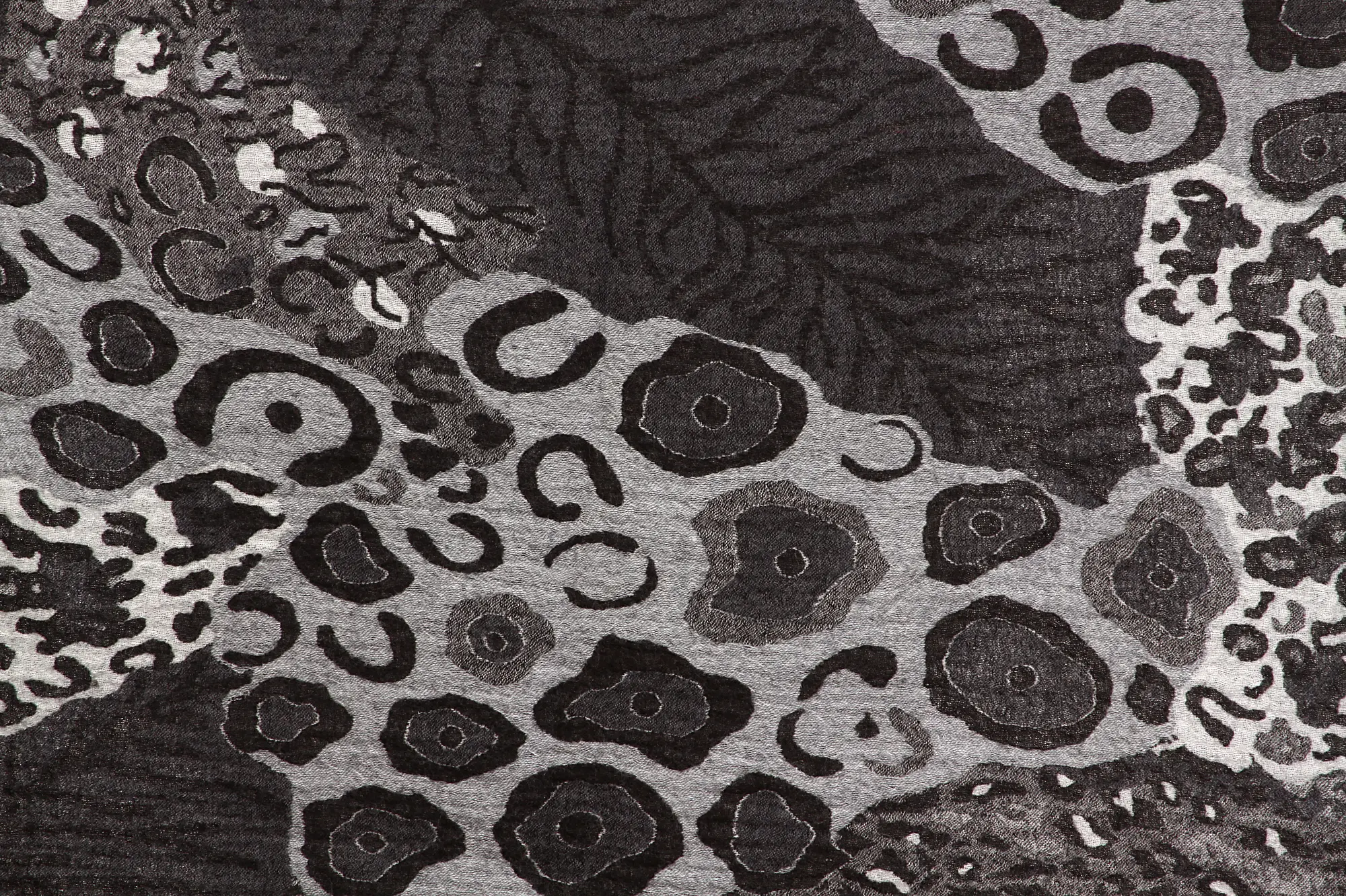 The beauty of this stole lies in its rich texture and dynamic design. The soft, boiled wool provides a comforting embrace against the skin, making it perfect for cooler days and evenings. The leopard print, rendered in sophisticated shades of gray, black, and white, is both bold and refined. Different scales and interpretations of the iconic animal print are artfully arranged, creating a visual tapestry that is both exciting and harmonious. The jacquard weaving technique ensures that the pattern is deeply integrated into the fabric, offering a tactile depth that is as pleasing to the touch as it is to the eye. Subtle variations in the weave add further dimension, catching the light and enhancing the overall richness of the piece. ––––––––––––––––––––