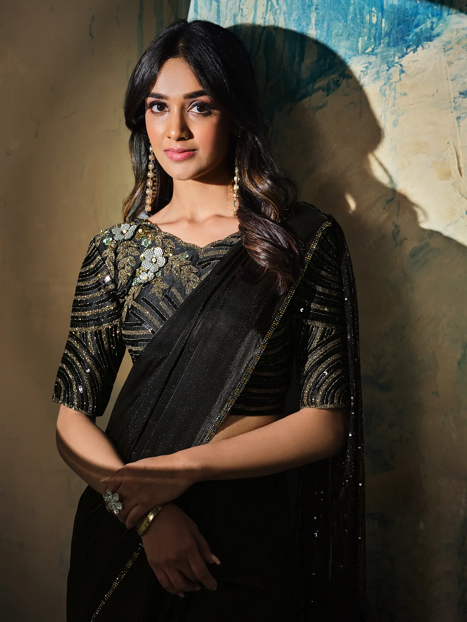 Abstract Print Sequins Work Designer Party Wear Jimmy Choo Saree With Full Sleeve Blouse