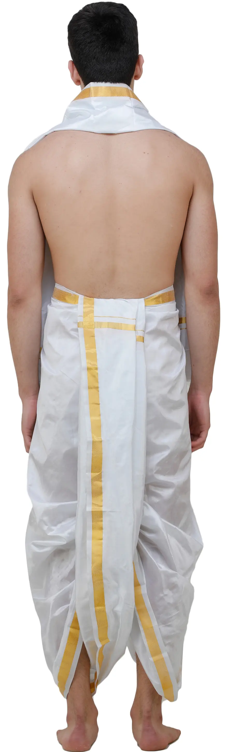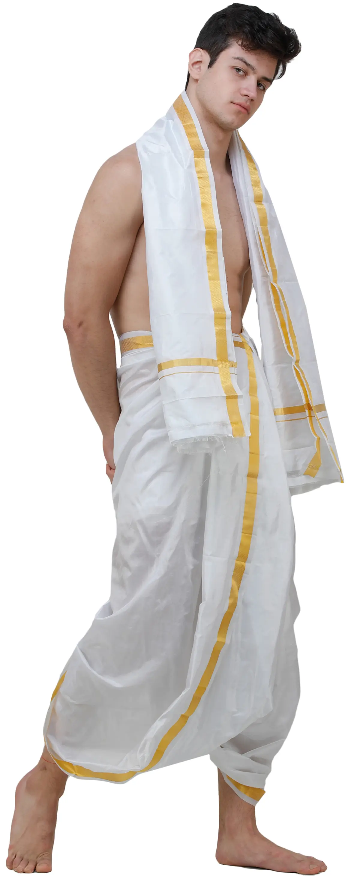Ready to Wear Dhoti and Angavastram Set with Meenakari Woven Golden Border