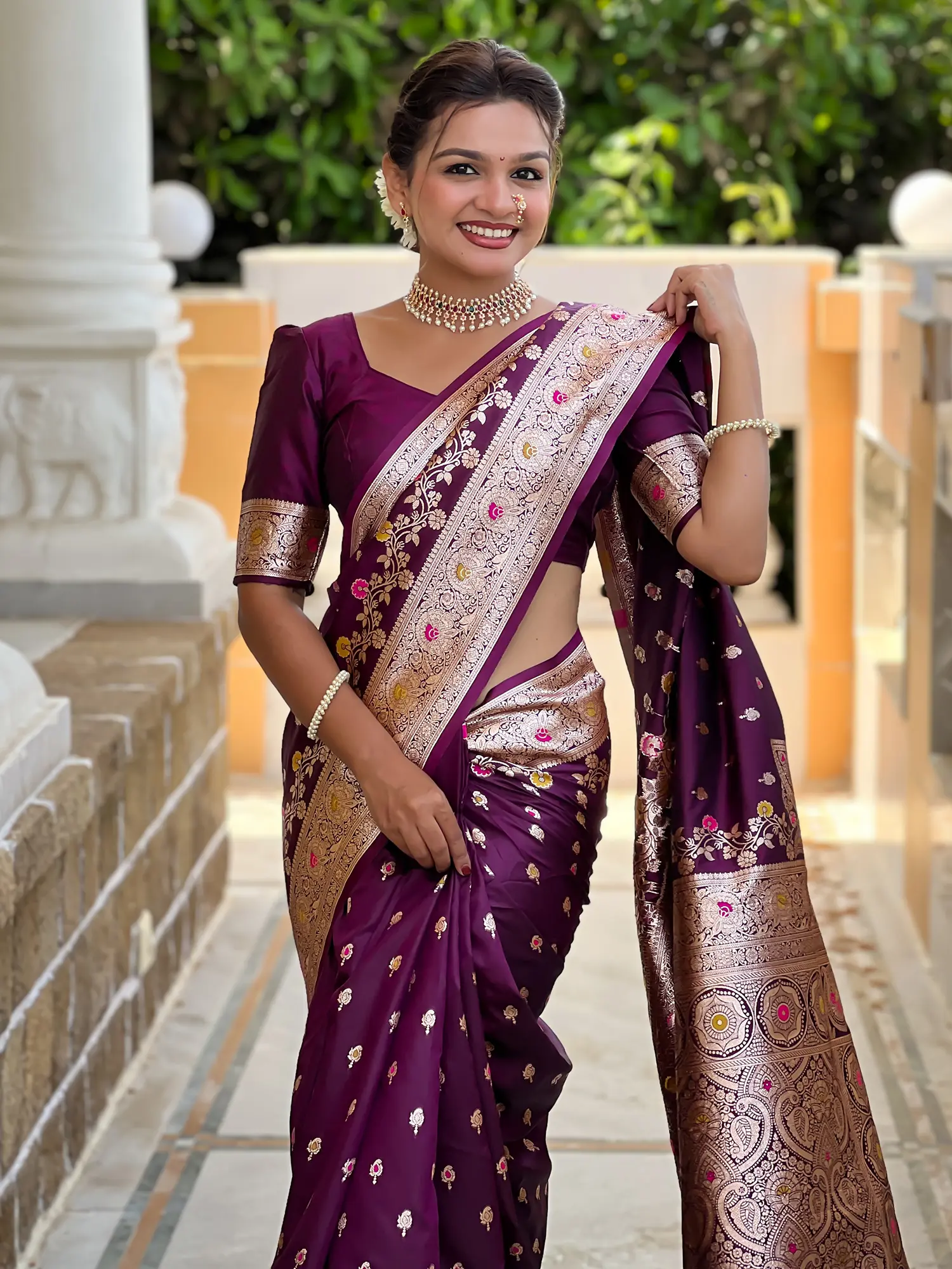 Adorn yourself in the deep, captivating hue, accented by a generously wide border that speaks of regal splendor. The rich pallu is a canvas of intricate artistry, featuring detailed motifs that draw the eye and inspire awe. Delicate floral embellishments are scattered across the body, creating a harmonious balance between grand design and subtle charm, ensuring you exude an aura of sophisticated elegance.