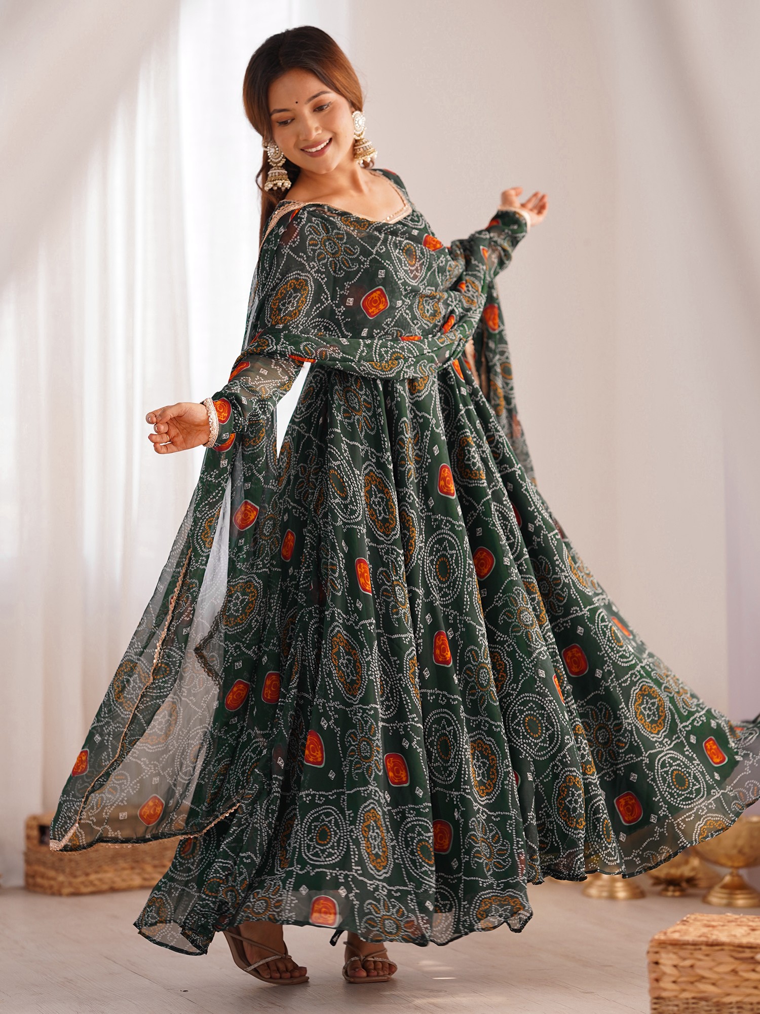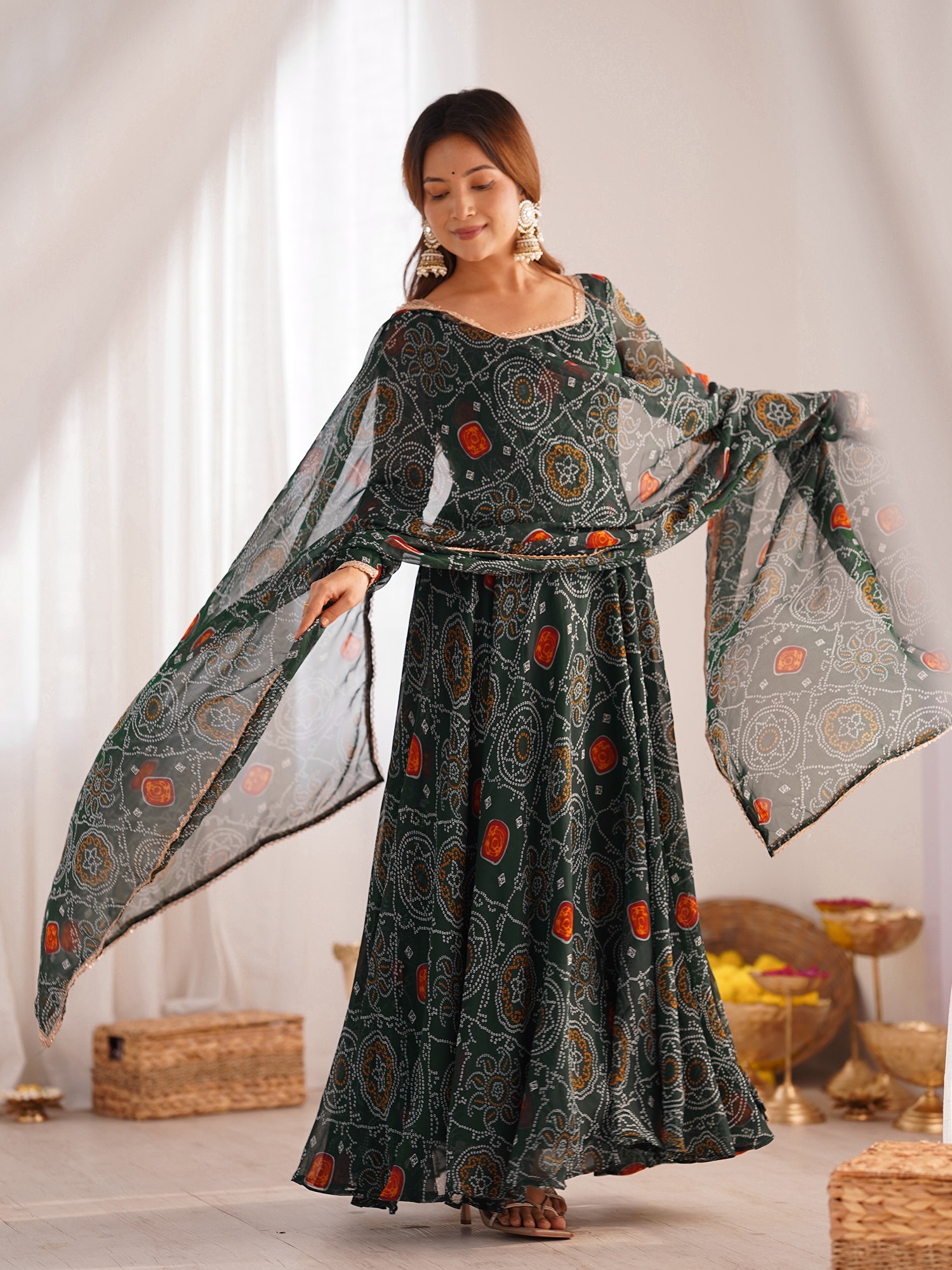 Floral Print Elegant Fully Flared Soft Organza Anarkali Suit With Lace Work Dupatta