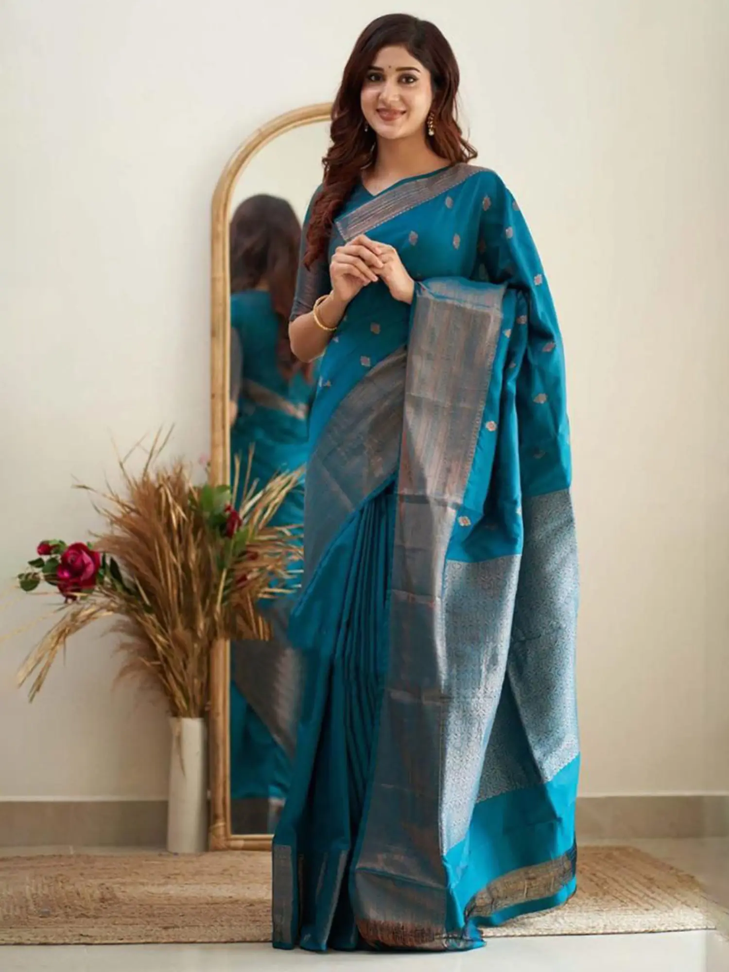 Immerse yourself in the luxurious embrace of this exquisite silk saree, a masterpiece designed to elevate your festive and wedding wardrobe. Crafted from the finest lichi silk, it offers a soft, fluid drape that moves with grace and sophistication. The rich, deep indigo hue serves as a stunning canvas for the intricate details that make this saree truly special.
