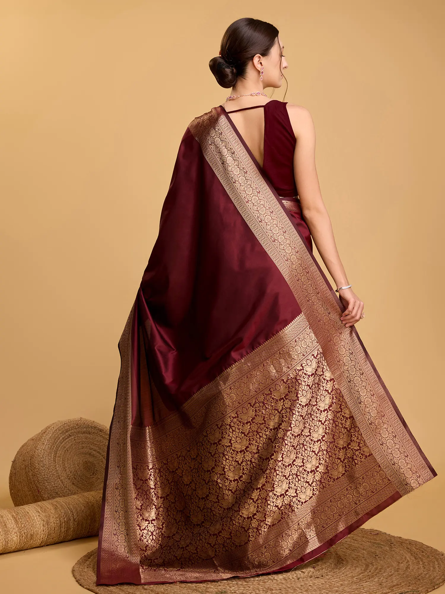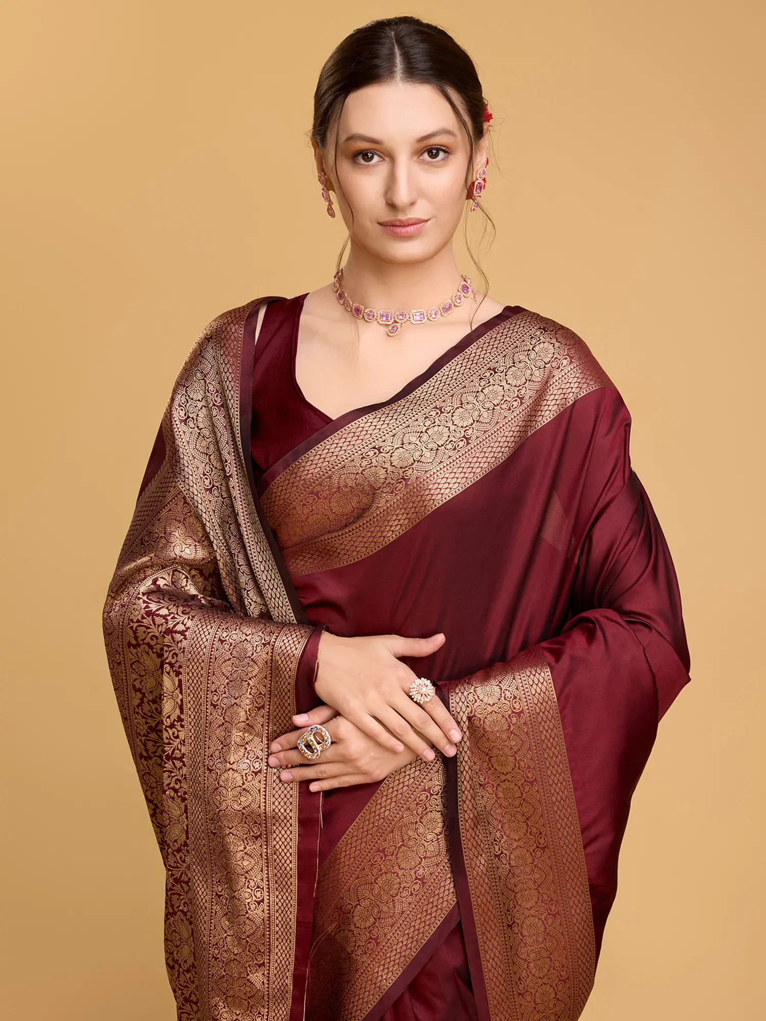 Features a broad, opulent border with intricate golden woven motifs.