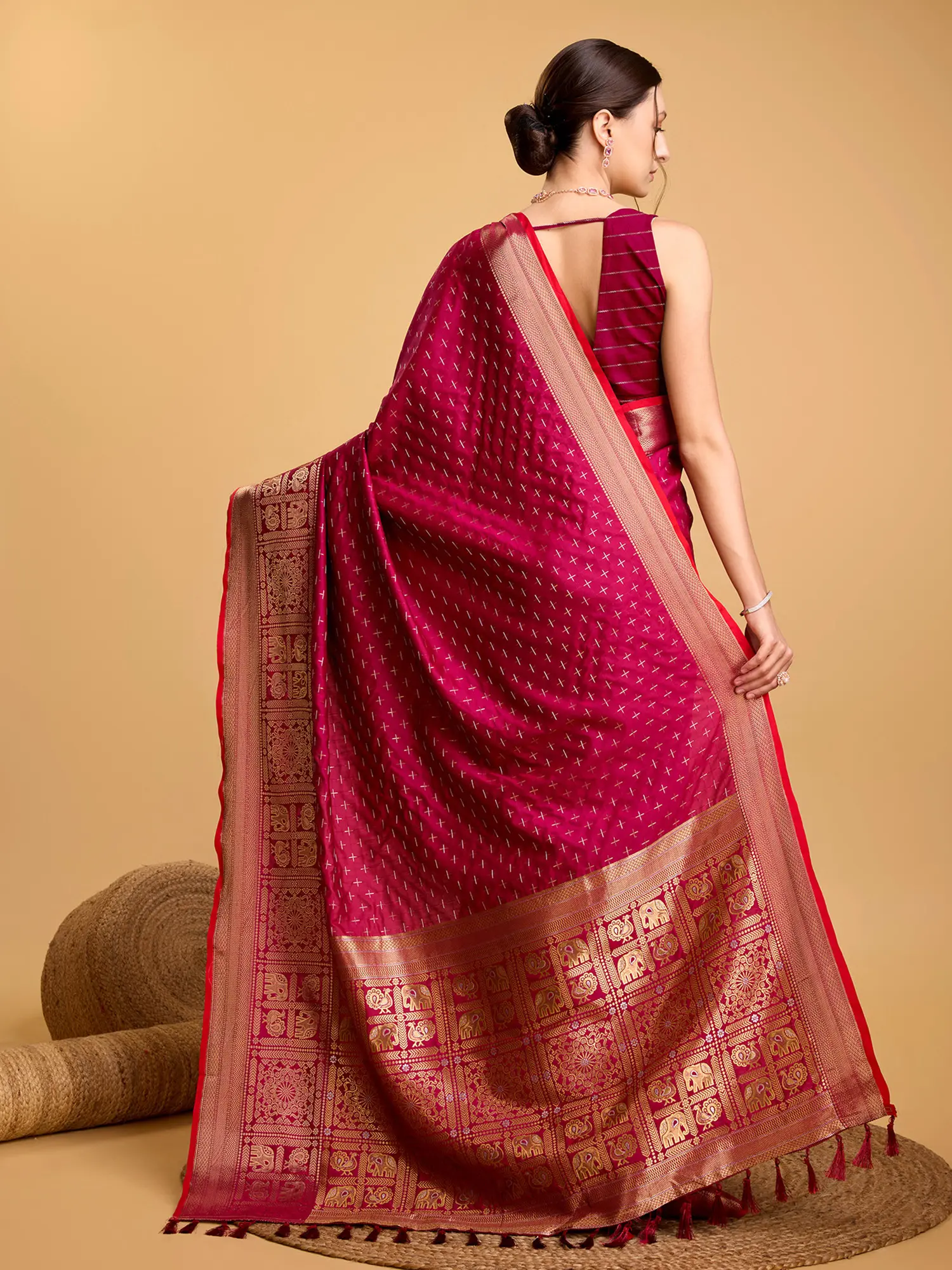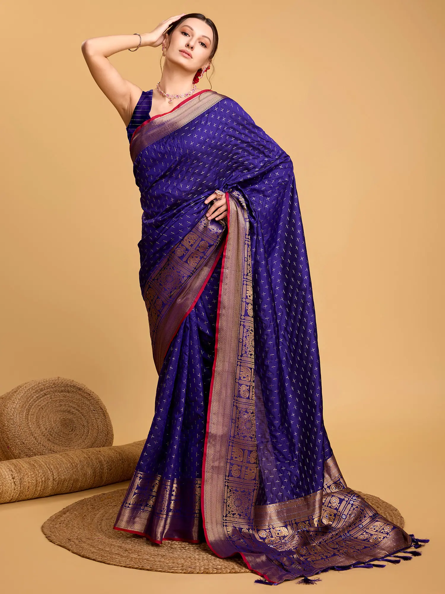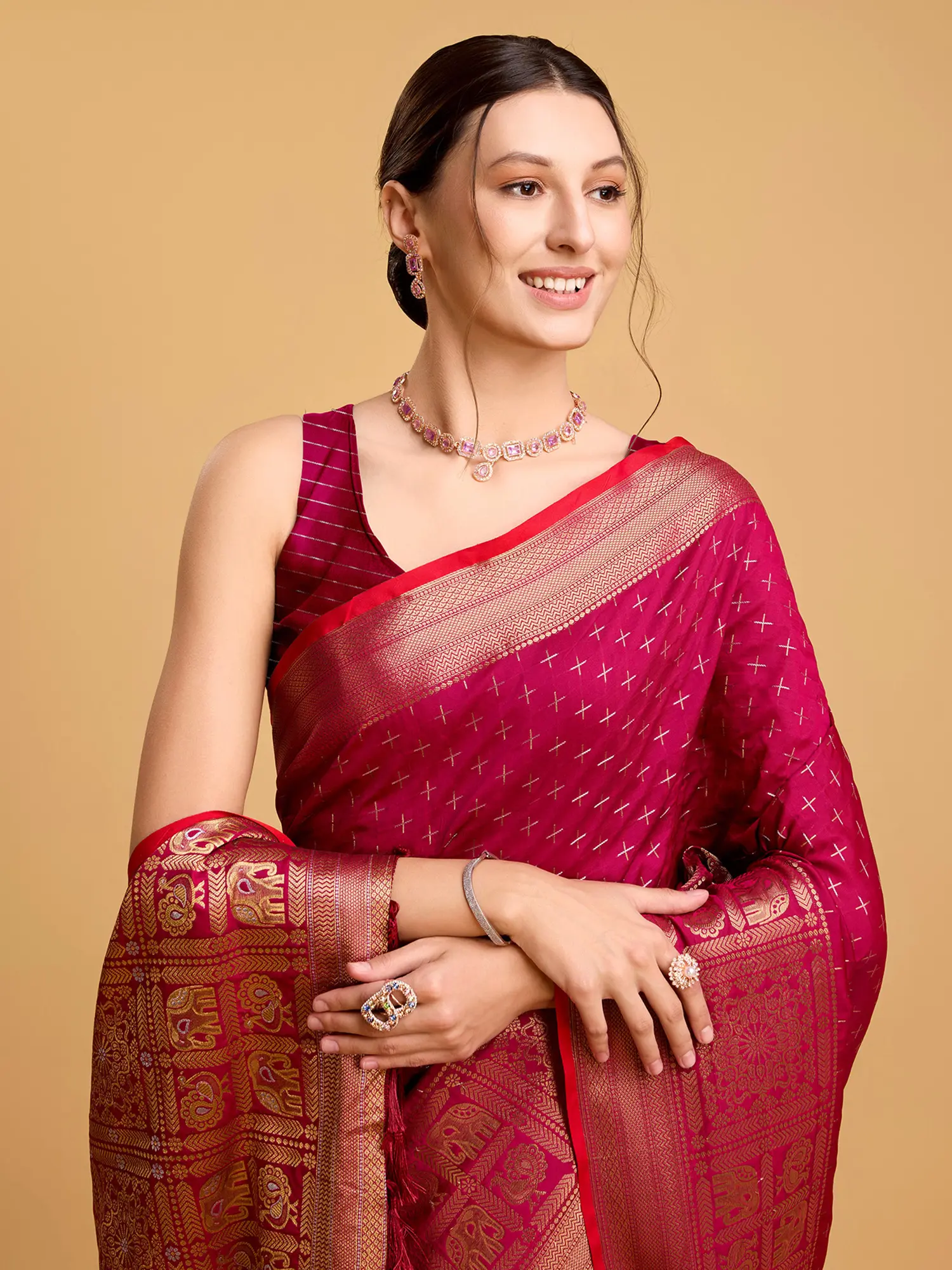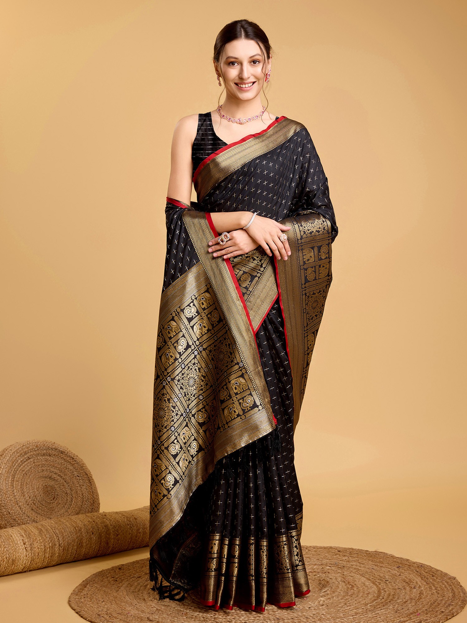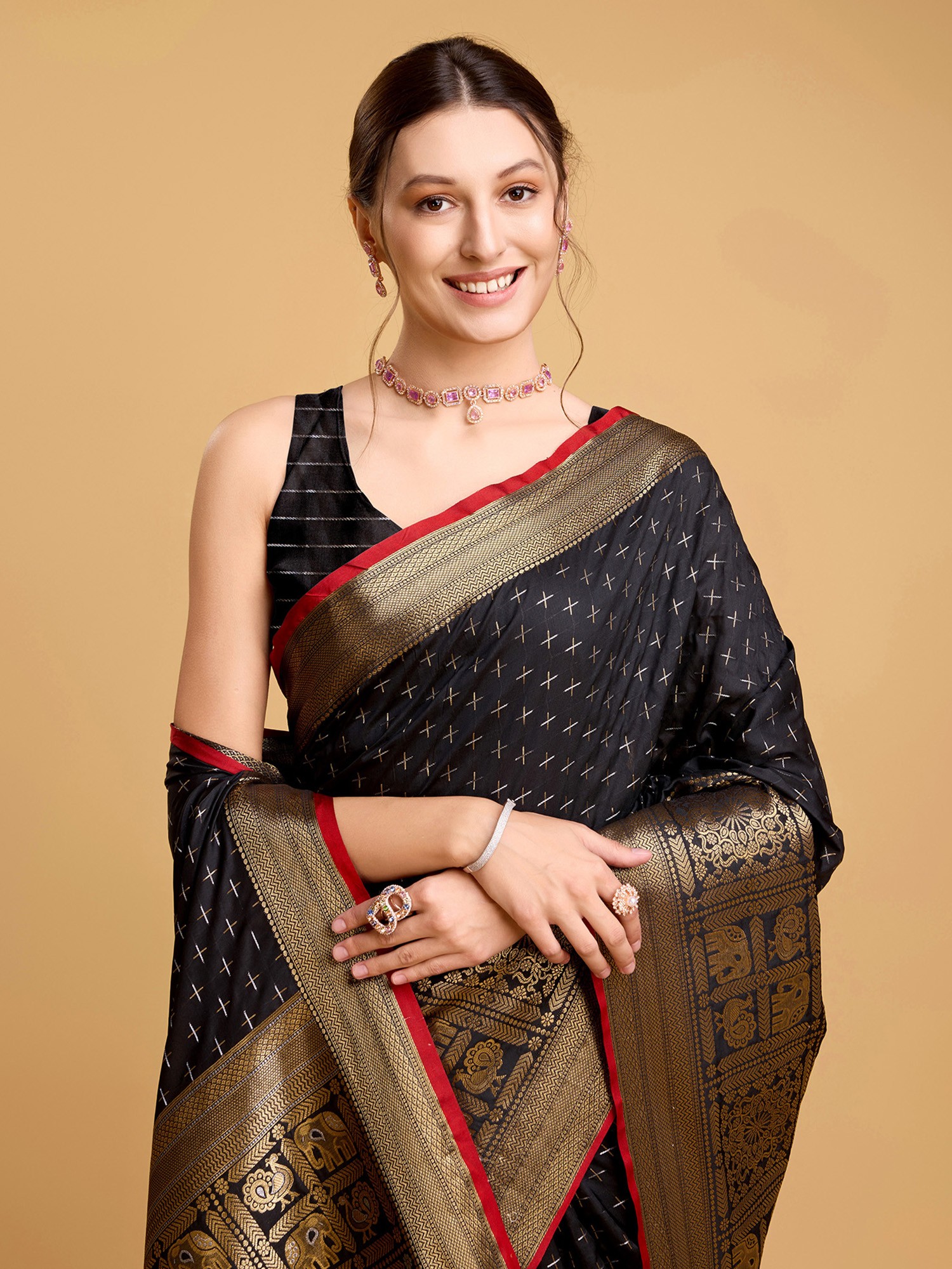 Silk Saree with Zari-Woven Border and Geometric Motifs All-Over