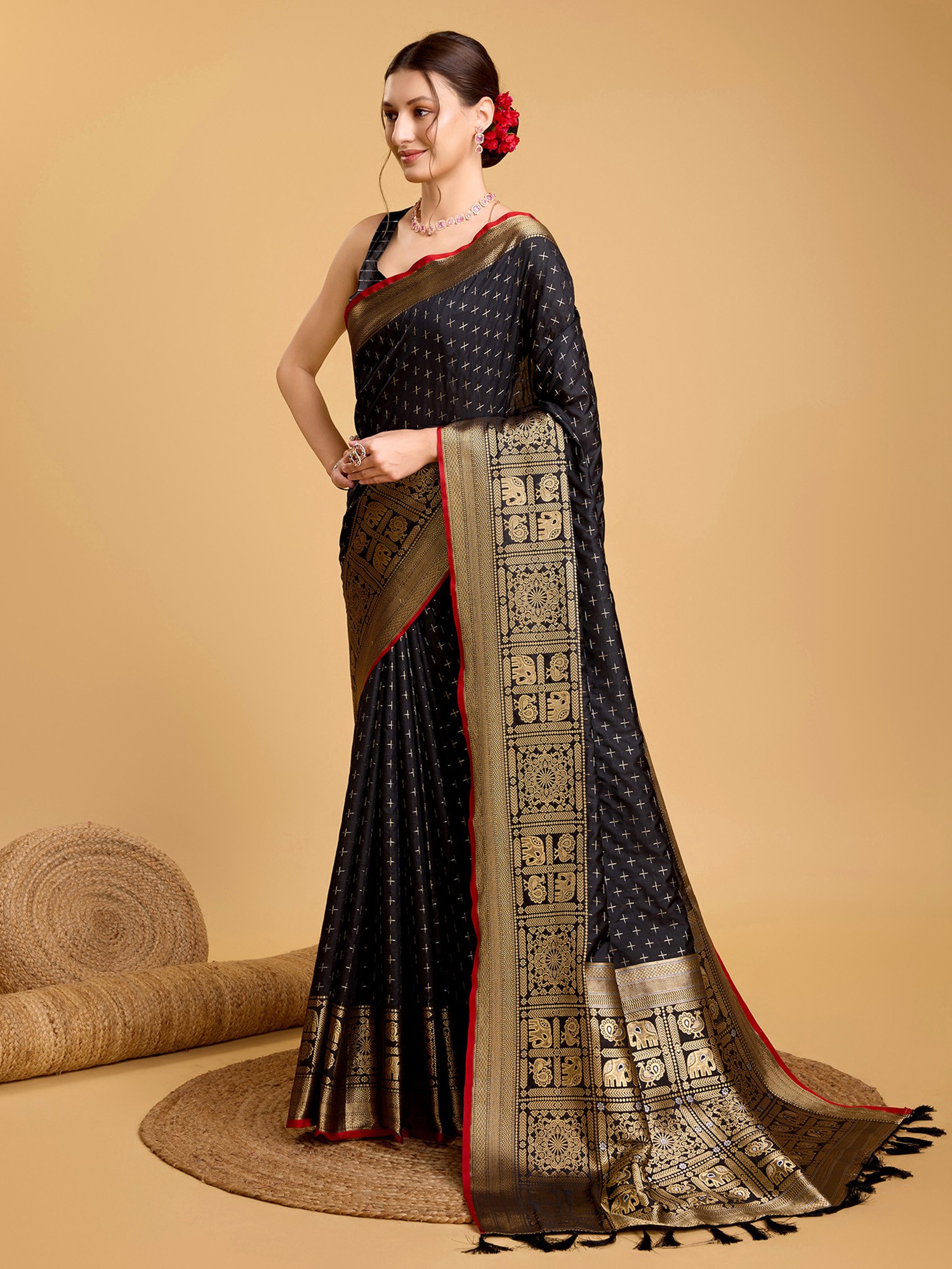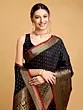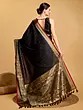 Bristol-Black Dola Silk Saree with Printed Leaves and Zari Brocaded Floral Border