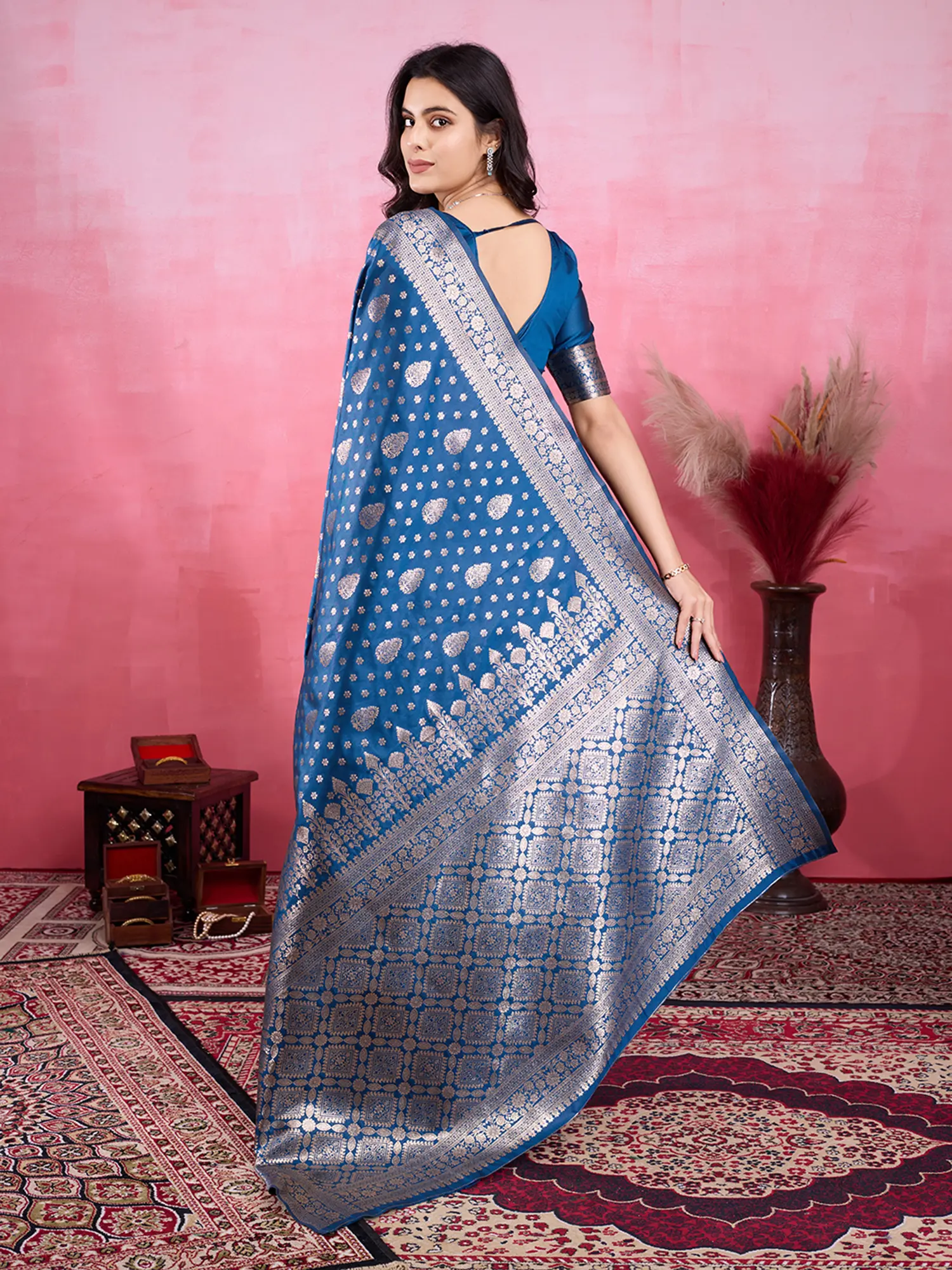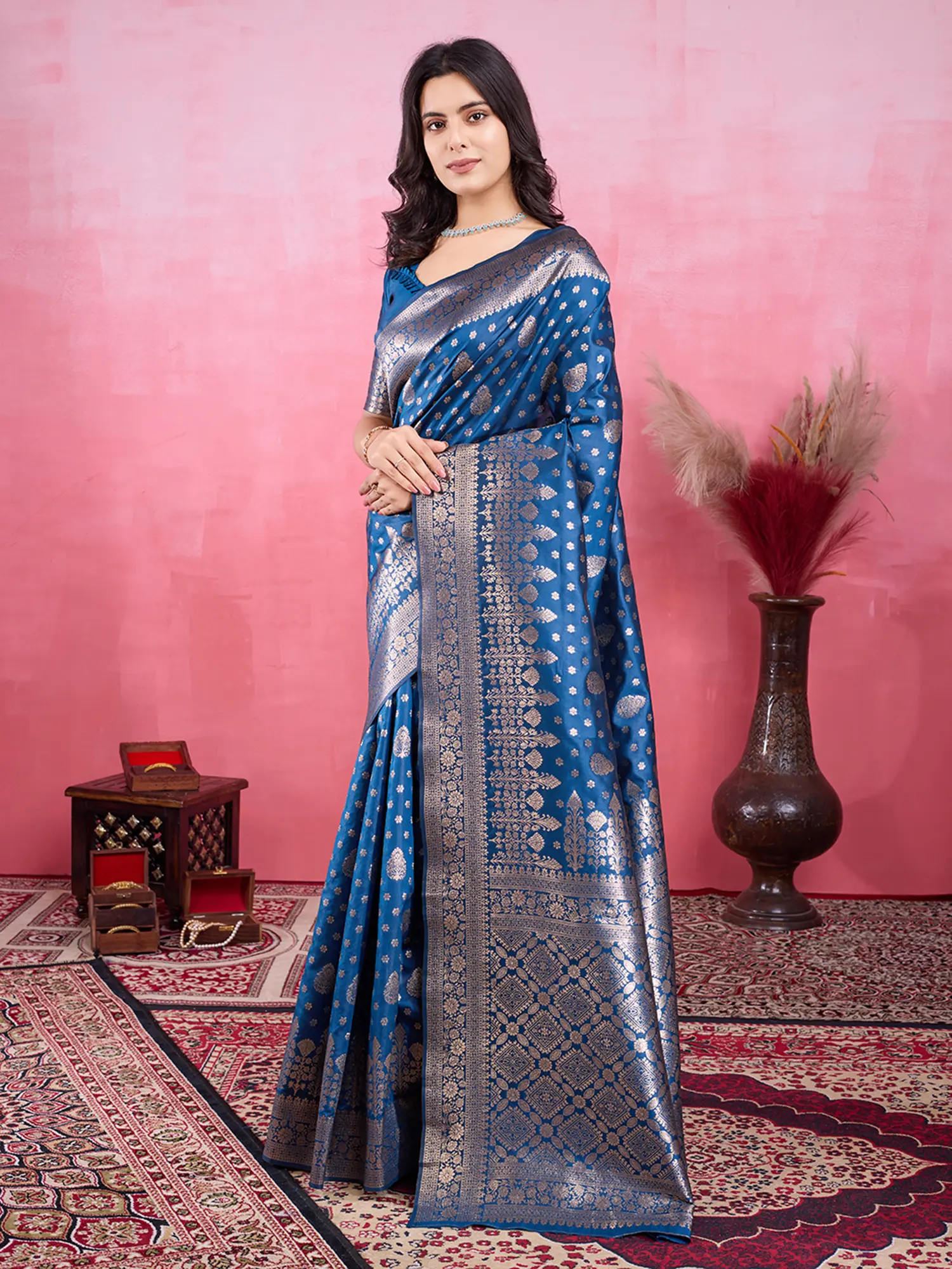 Ocean-Depths Bootis woven Pure Silk Saree from Bangalore with Golden Thread Weave on Border