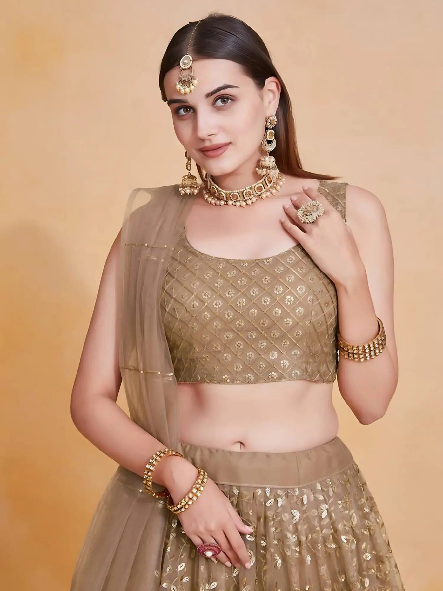 The lehenga is fashioned from a soft, flowing net fabric that drapes beautifully, creating a graceful silhouette. This delicate base is adorned with a rich tapestry of embroidery, featuring delicate motifs that are further enhanced by the opulent shimmer of heavy sequin work. Each sequin catches the light, creating a dazzling effect that is both sophisticated and glamorous. The embroidery extends throughout the lehenga, culminating in a resplendent border that is heavily embellished with sequins, adding a touch of dramatic flair and ensuring all eyes are on you. The accompanying choli is equally captivating. It features a sleeveless design, tailored to perfection for a flattering fit. The entire choli is covered in intricate embroidery and dazzling sequins, mirroring the grandeur of the lehenga and creating a cohesive, stunning look. The pattern on the choli is designed to complement the lehenga, creating a harmonious balance of design and embellishment.