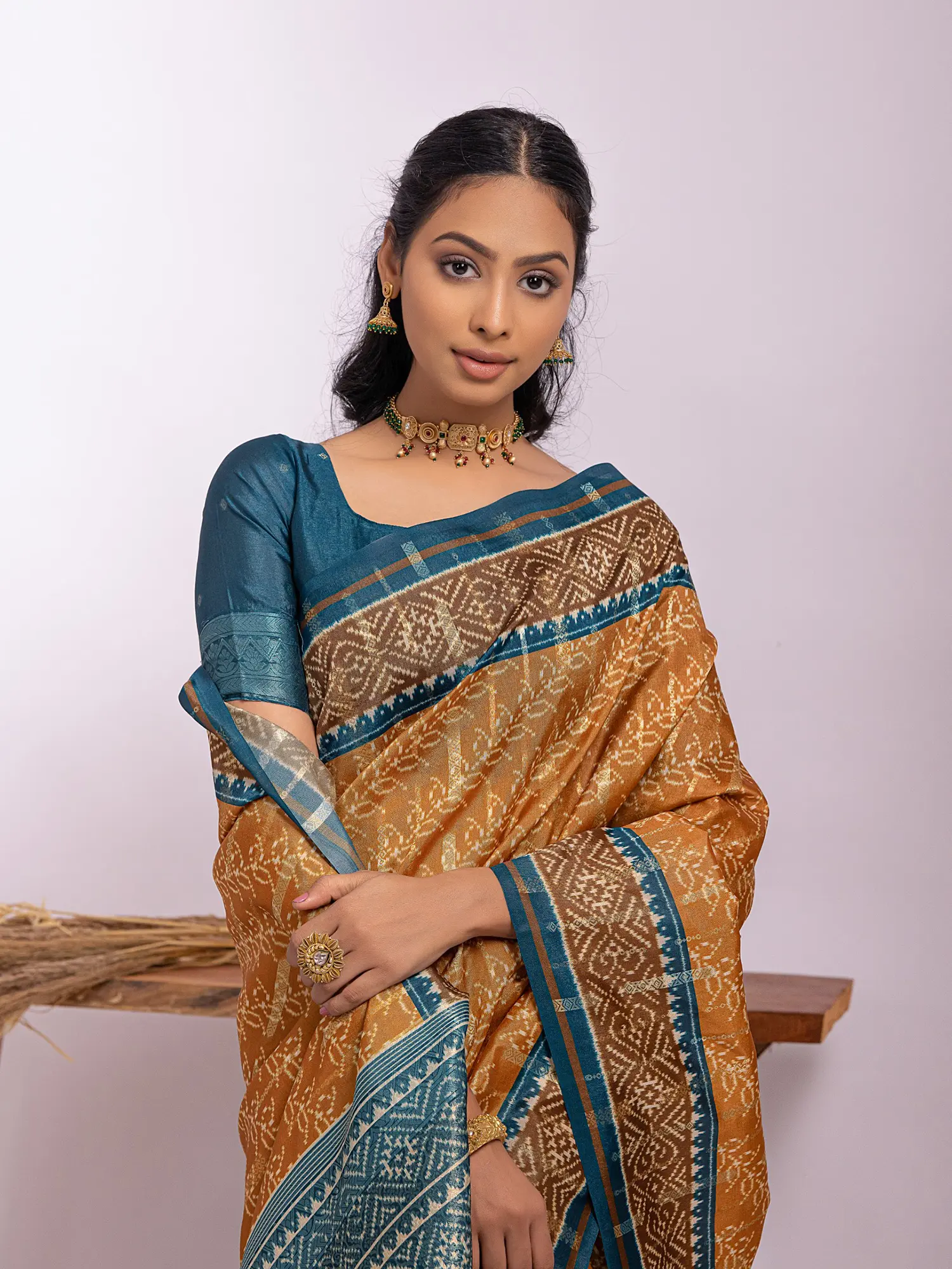 Kosa Tussar Silk Saree with Hand Block Printed Tribal Drummer Figures from Bengal