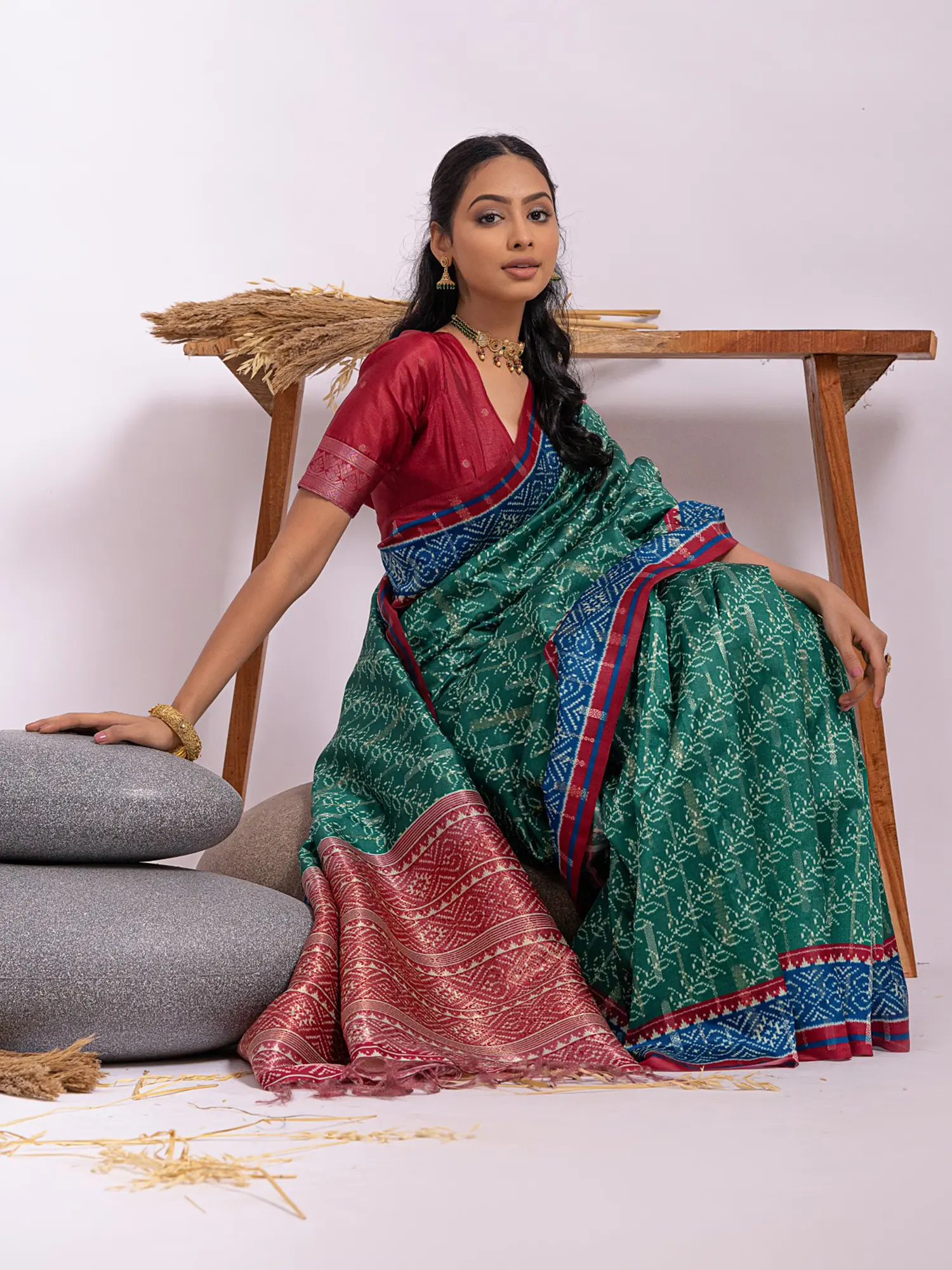 Turkish-Coffee Batik Dyed Abstract Pattern Hand-Embroidered Kantha Tussar Silk Saree