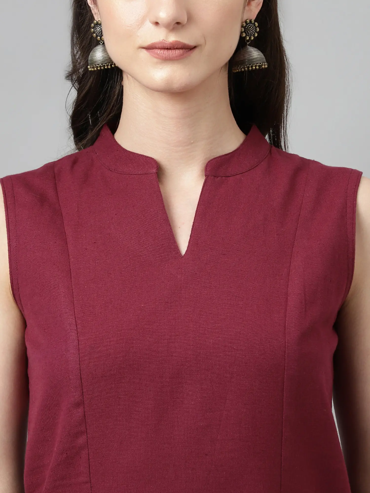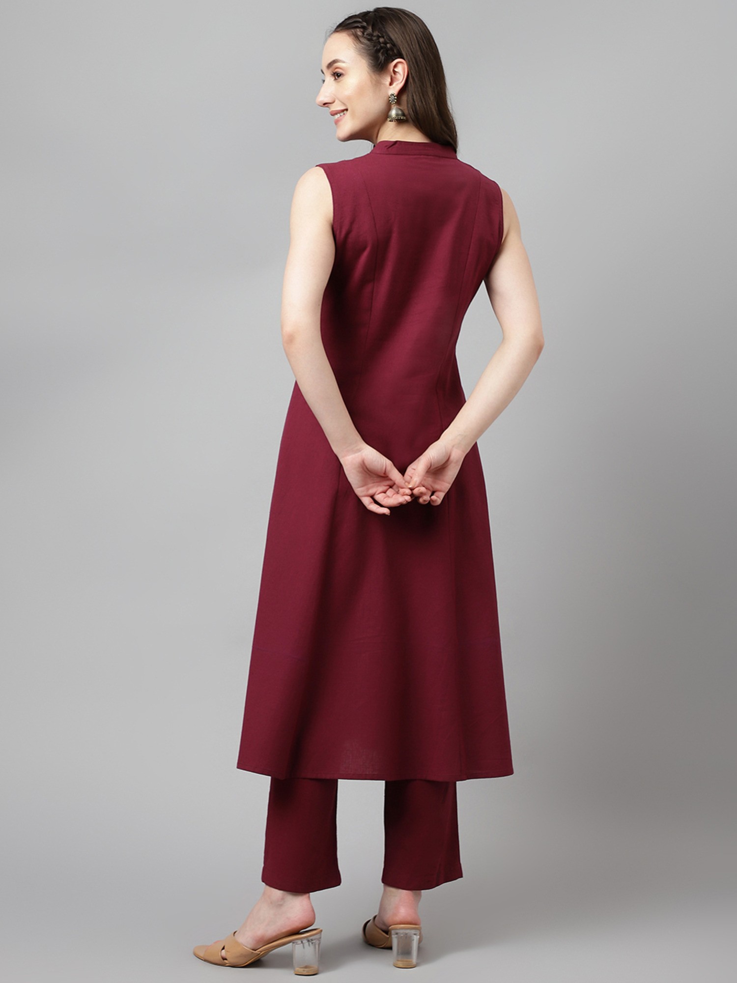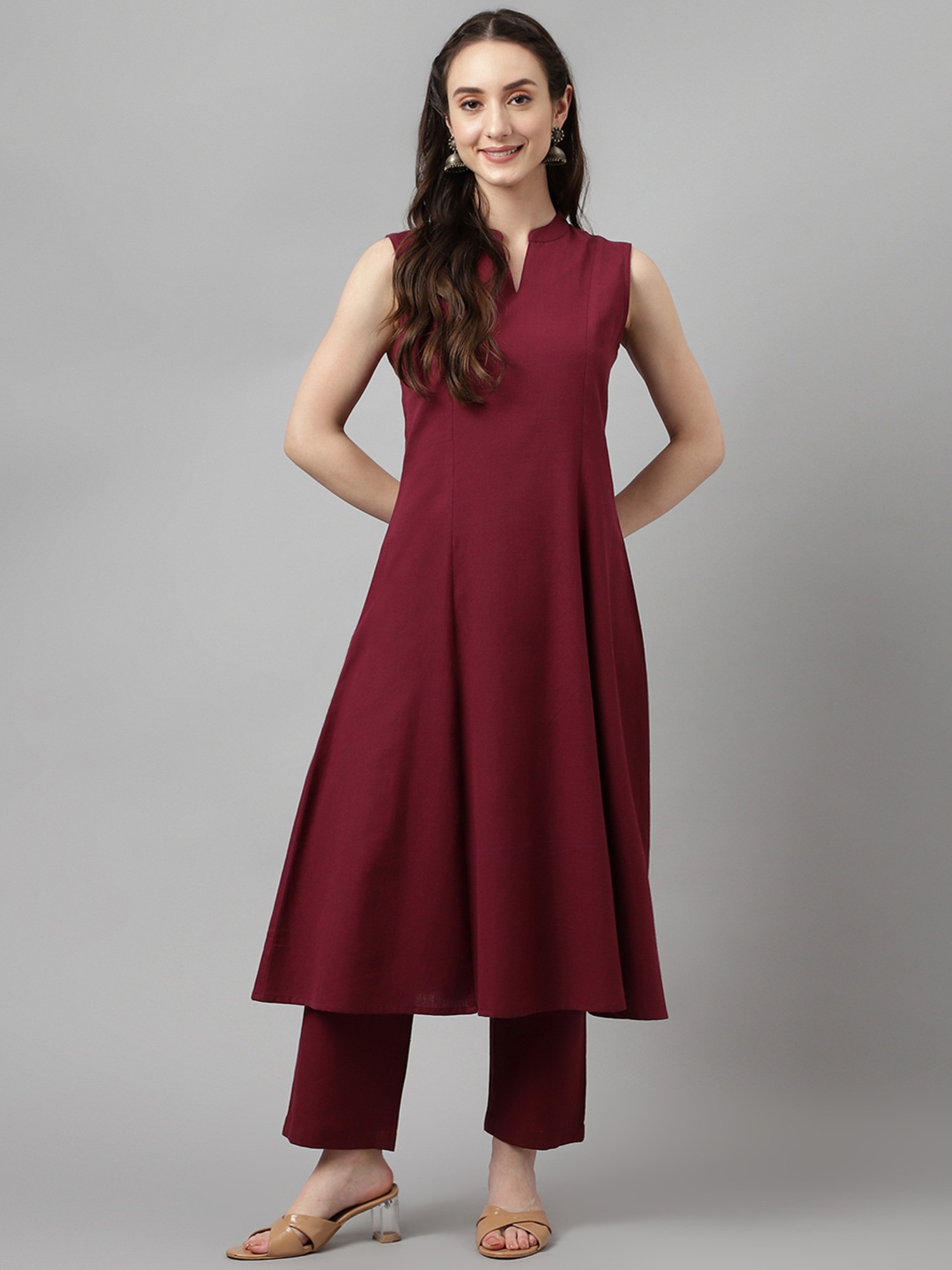 This graceful kurta set is more than just an outfit; it's a statement of refined taste and effortless style. Designed for comfort and imbued with a sense of occasion, this ensemble is perfect for those moments when you want to feel both elegant and at ease. The deep, rich color exudes sophistication, making it a standout choice for festive gatherings and special events. The sleeveless design offers a modern twist on traditional attire, allowing for ease of movement and a breathable feel. The neckline features a subtle V-notch, adding a touch of allure without compromising on modesty. The A-line silhouette flatters all body types, gracefully flowing from the shoulders to the hem, creating a visually appealing and figure-enhancing shape.