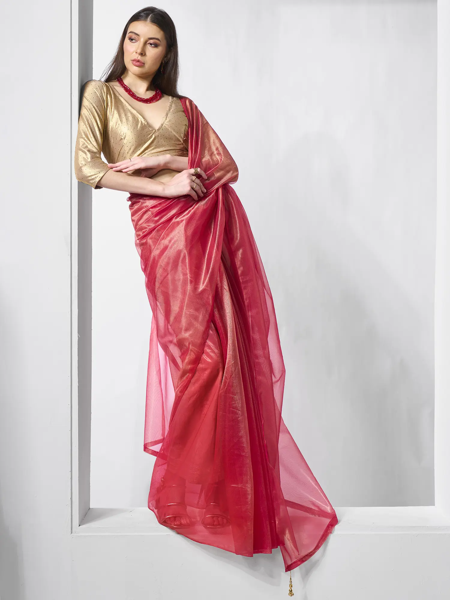 Venetian-Red Solid Lace Work Satin Jimmy Choo Party Wear Saree With Designer Matching Blouse