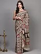 The base of the saree is a soft, neutral hue, allowing the vibrant floral patterns to take center stage. A striking border in deep red frames the entirety of the garment, adding a touch of regal contrast. This border is further enhanced with a band of intricate geometric and floral motifs, creating a visually arresting edge. The pallu, the decorative end of the saree, showcases a more concentrated and elaborate version of the floral jaal, designed to be a focal point when draped. The overall effect is one of sophisticated grace, blending traditional artistry with contemporary appeal.