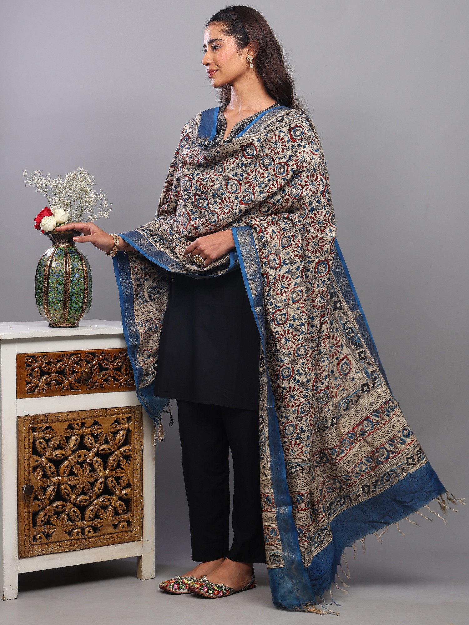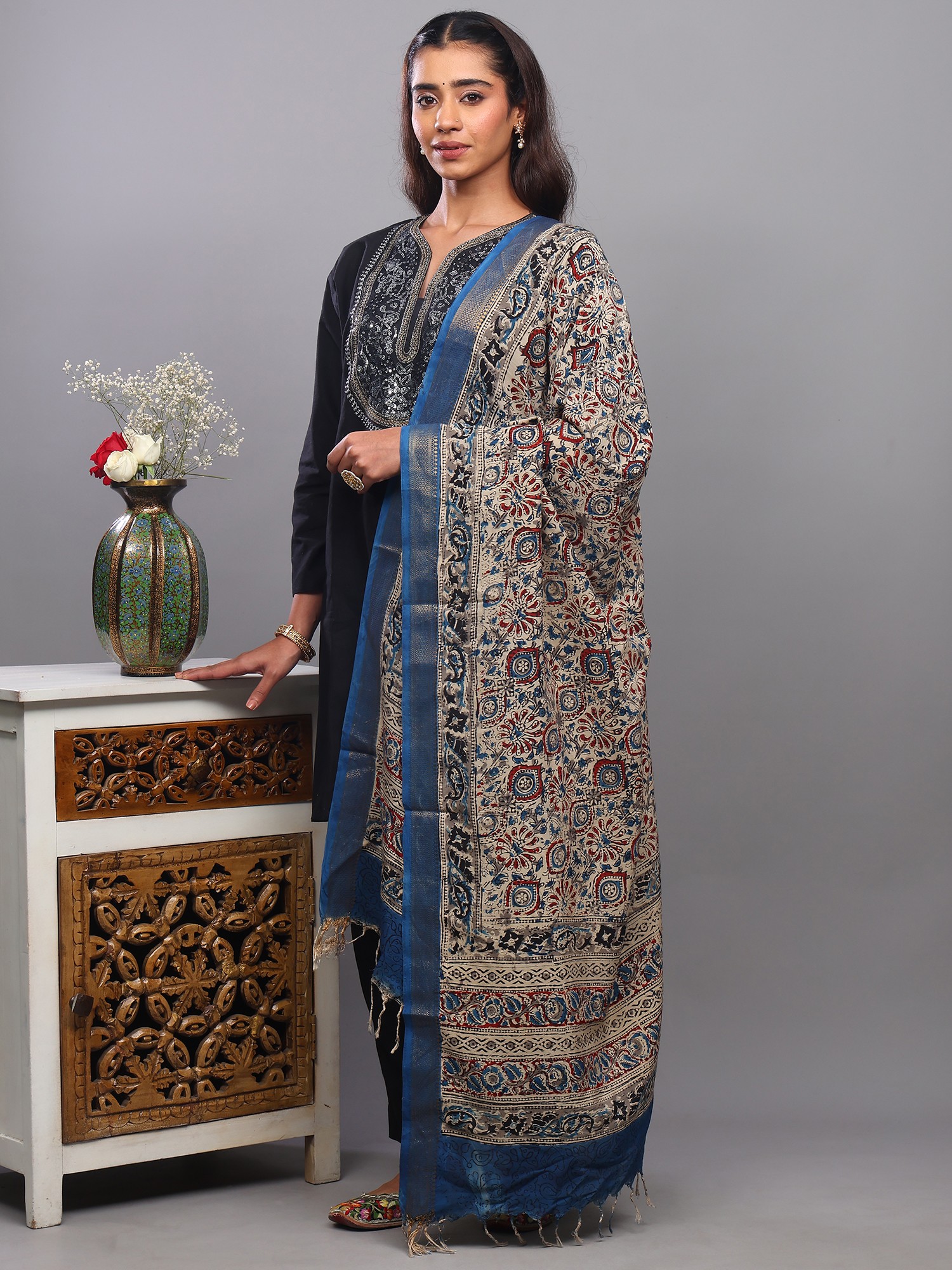 Kalamkari Dupatta with Zari Border and Hand-Painted Lotuses