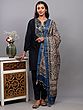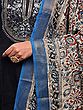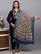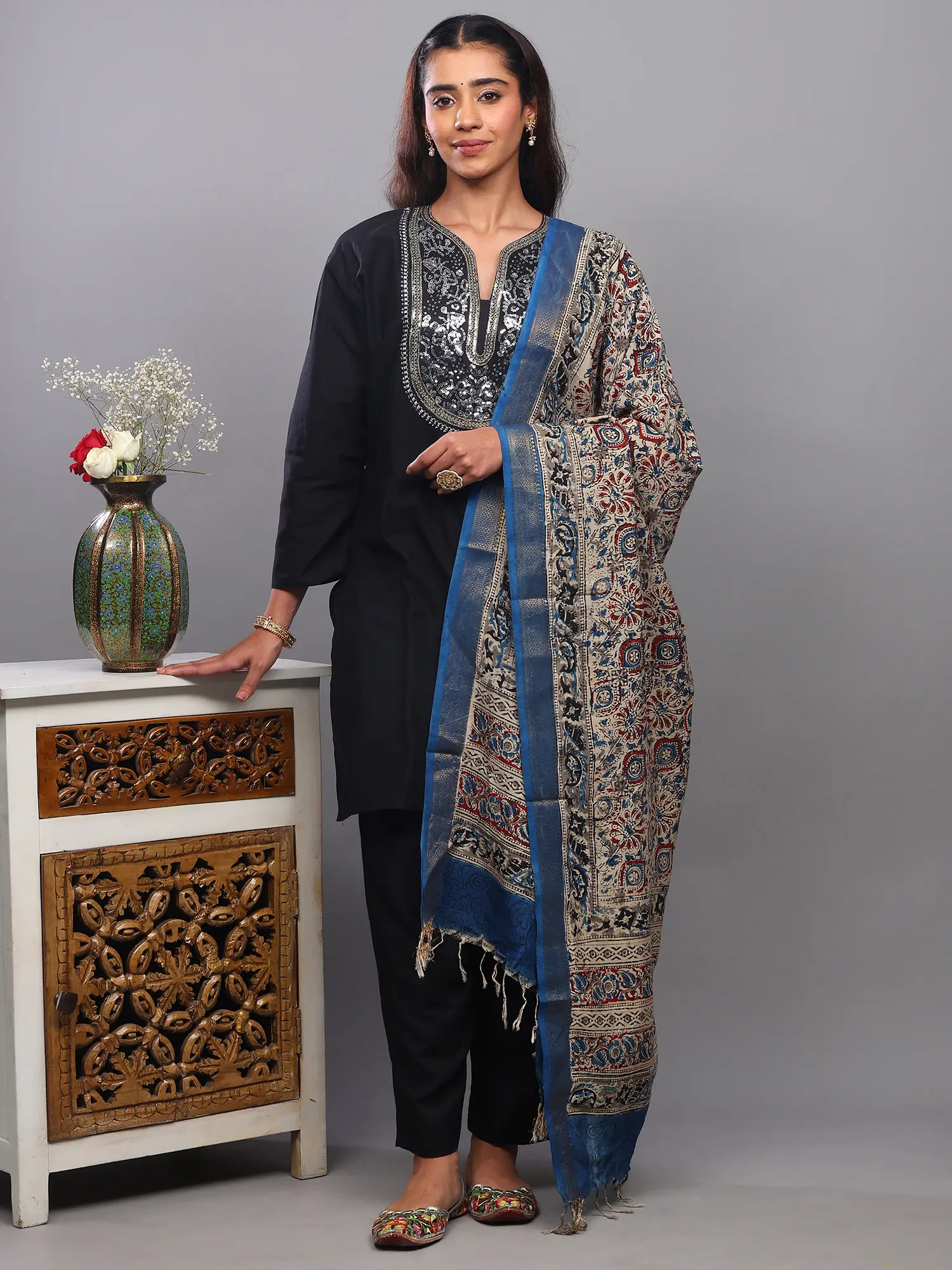 Black-Ink Floral Printed Kalamkari Dupatta from Telangana with Zari Woven Border and Dancing Apsaras