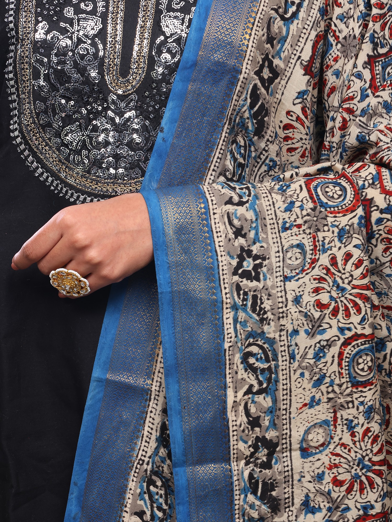 Solitary-Star Printed Kalamkari Dupatta with Zari woven Contrast Border from Telangana