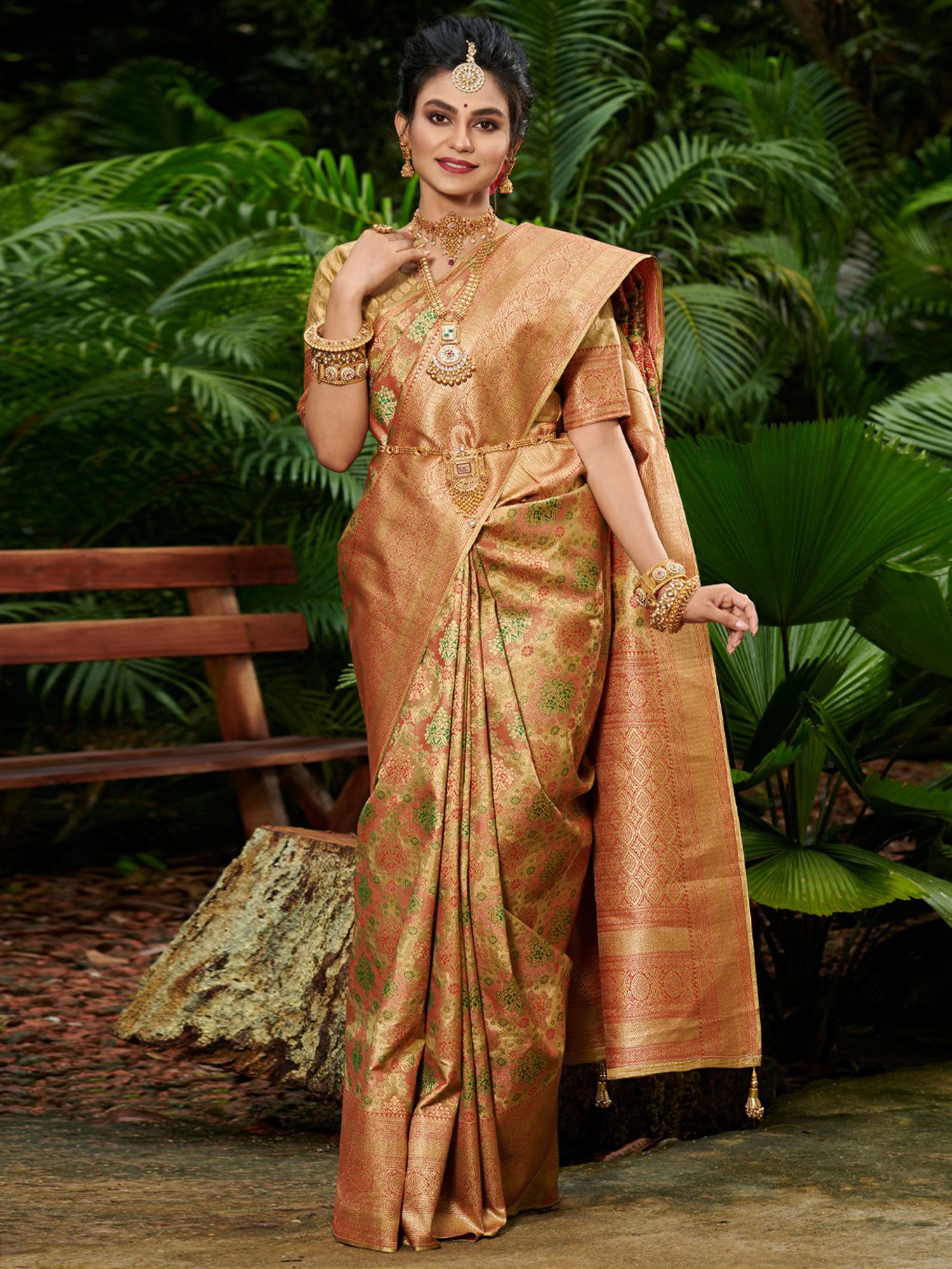 Zari Woven South Silk Saree With Temple Motifs Border And Tassels Pallu