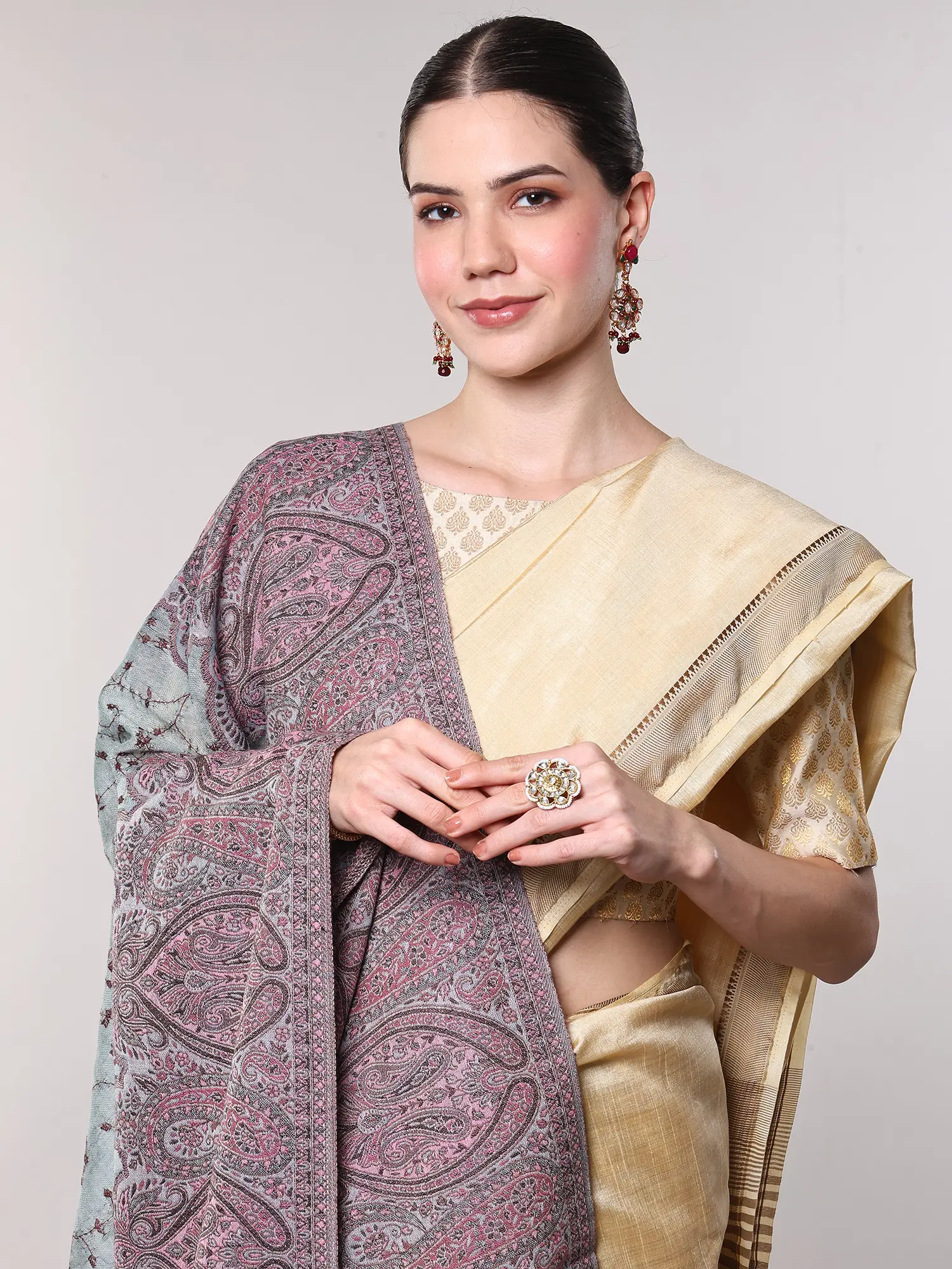 The design of this shawl is a celebration of nature's artistry and symbolic meaning. Delicate flowers bloom across the fabric, interspersed with the classic paisley motif, also known as "ambi" or "kairi." These motifs, rich with symbolism representing fertility, prosperity, and eternal life, are rendered in a harmonious palette of soft purples, pinks, and subtle greys. The woven border further enhances the shawl's grandeur, framing the embroidery with its own intricate detailing, creating a cohesive and luxurious aesthetic. The interplay of colors and patterns evokes a sense of timeless elegance, making this shawl a perfect complement to both traditional and contemporary ensembles.
