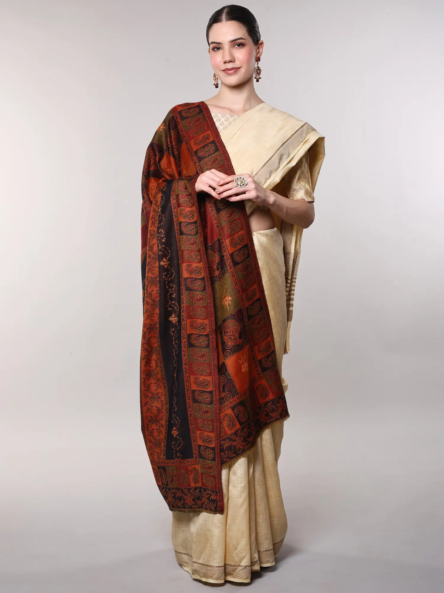 French-Oak Diamond Weaved Woolen Shawl with Sozni Embroidered Border