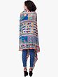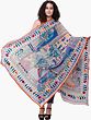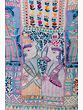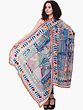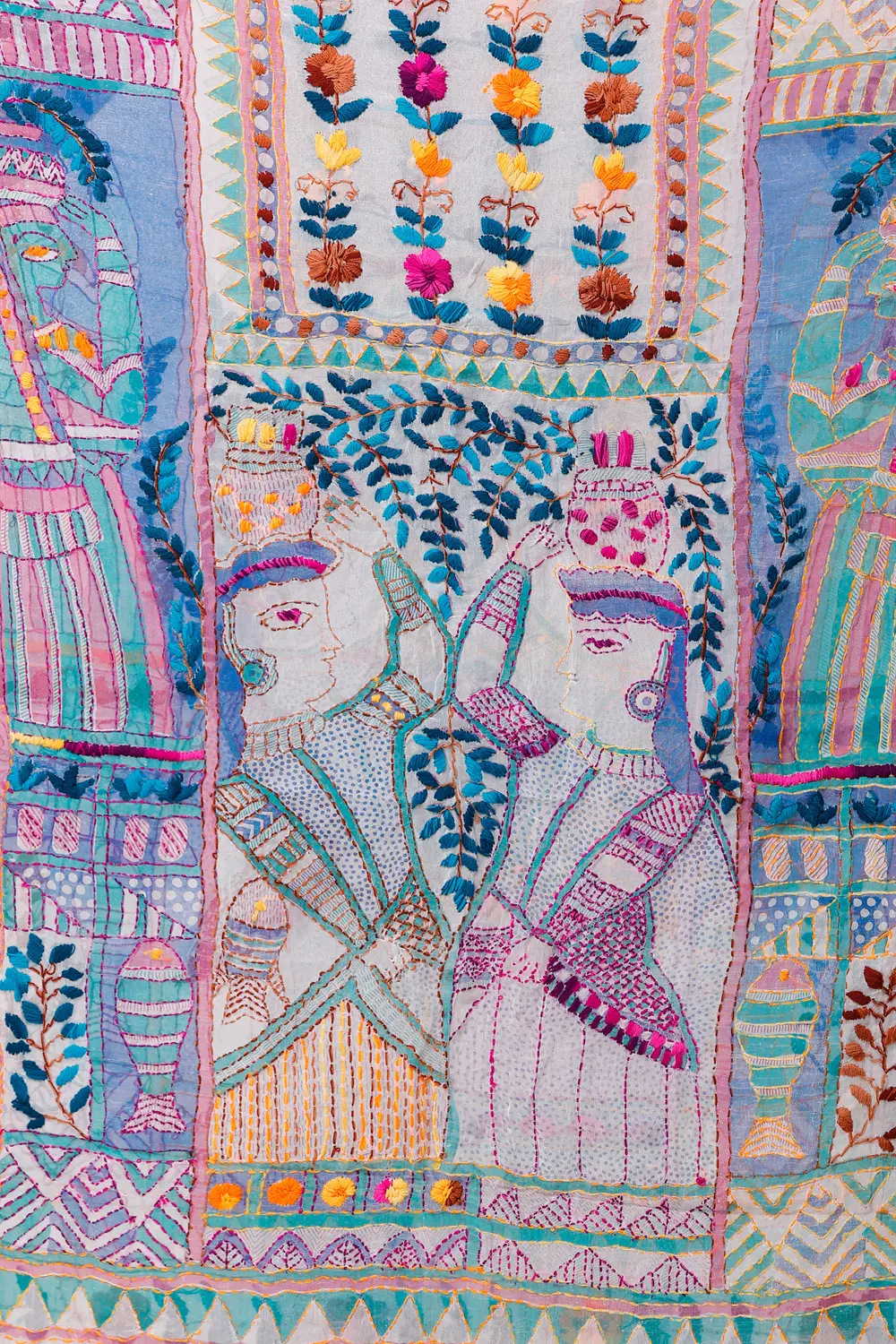 Spa-Blue Phulkari Dupatta from Punjab with Embroidered Flowers and Printed Village Folks in Multicolor Thread
