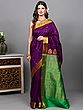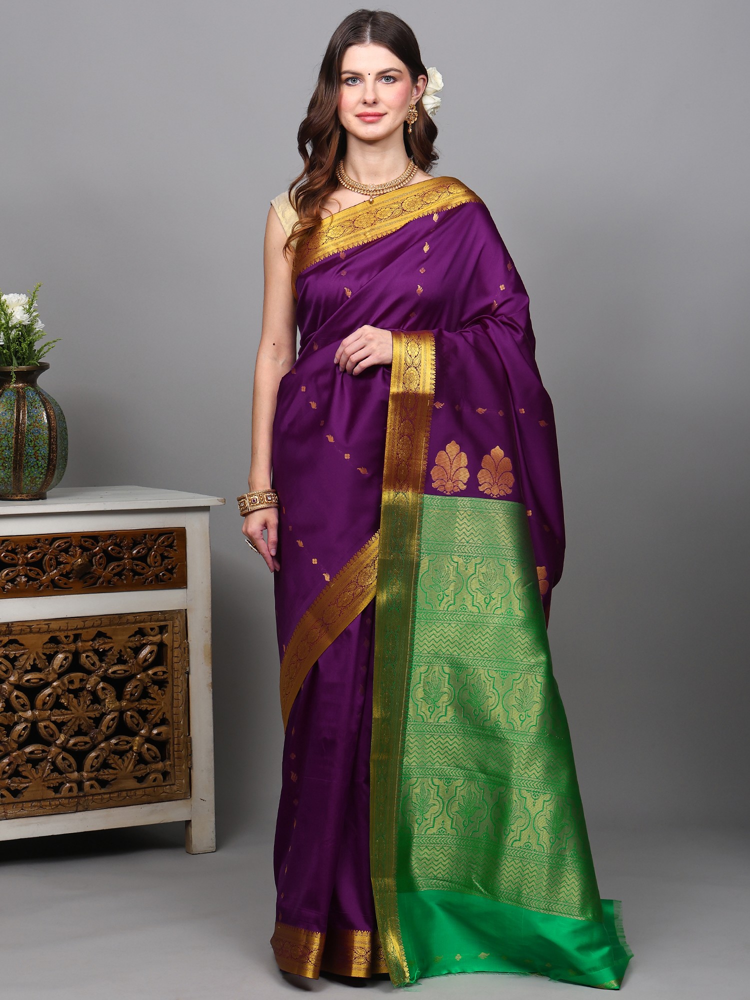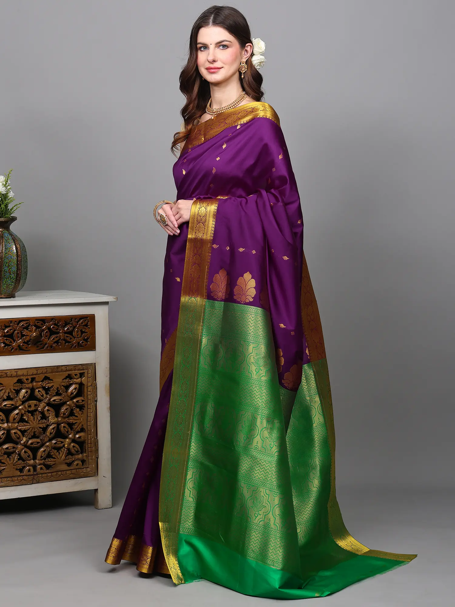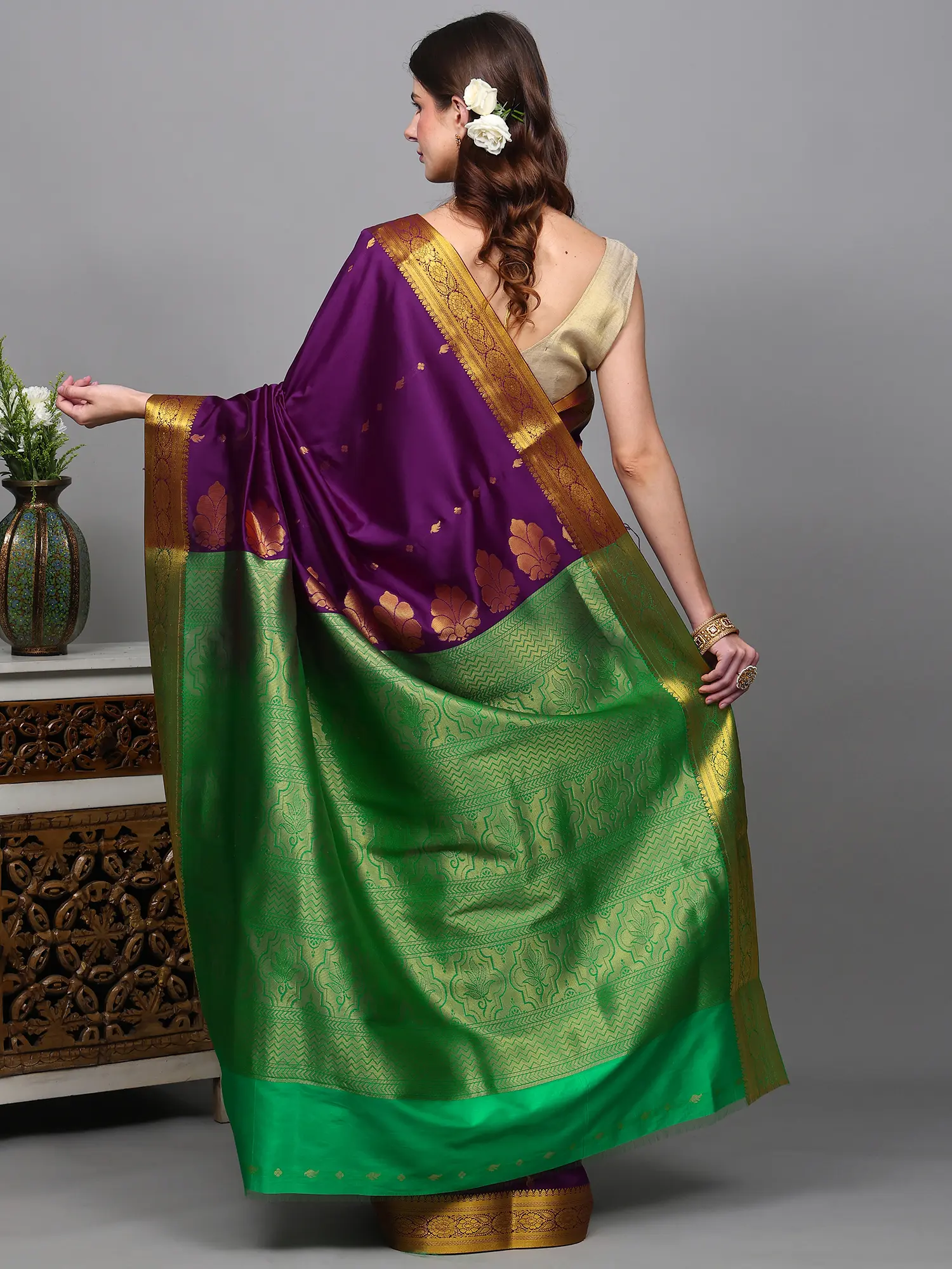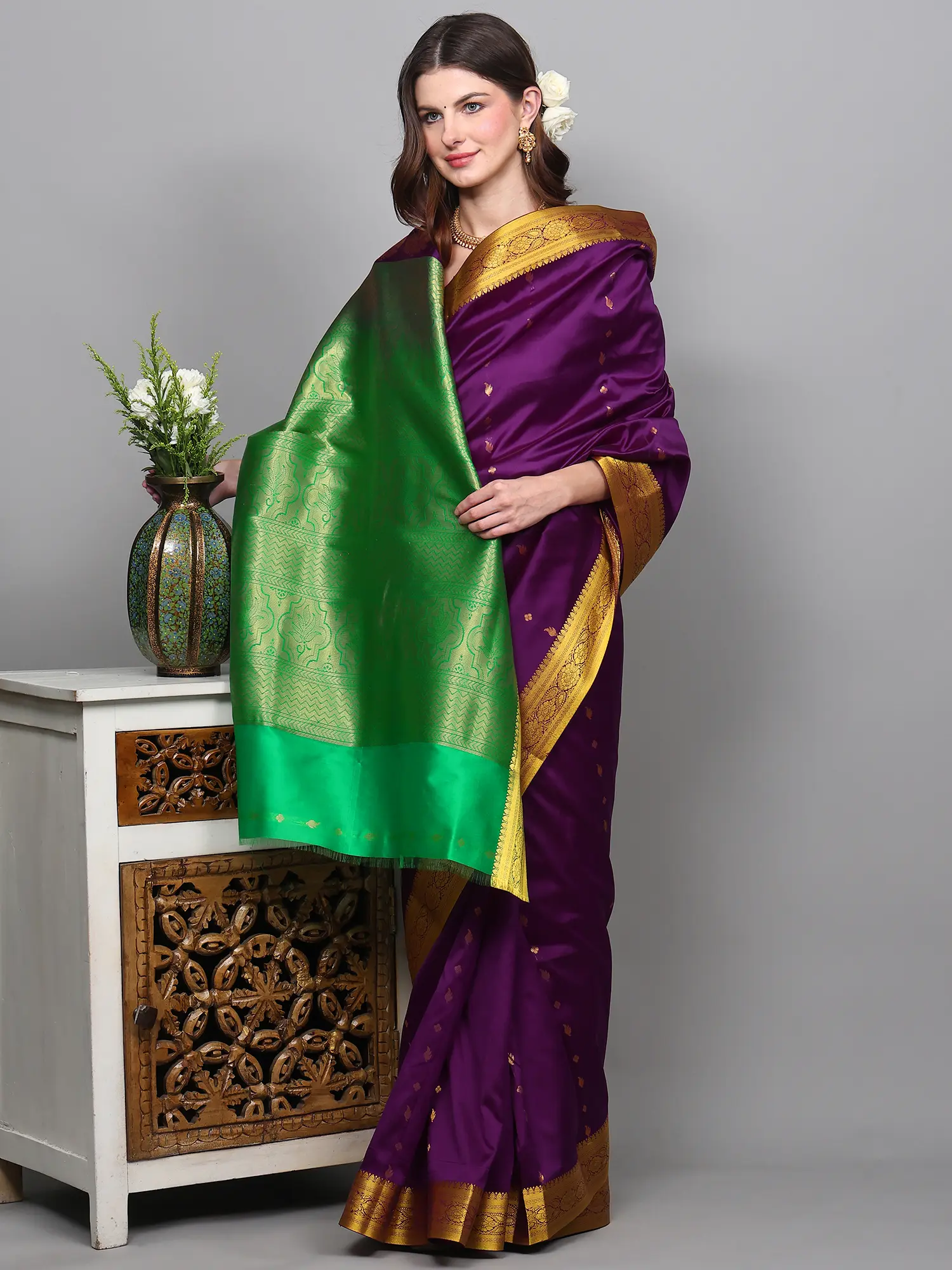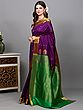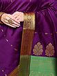 The grandeur of the saree is further enhanced by its breathtaking pallu. A vibrant, lush green hue dominates this section, offering a stunning and harmonious contrast to the grape-colored body. This contrast is not just visually appealing; it also adds a dynamic dimension to the overall design. The pallu is richly embellished with intricate zari work, mirroring the floral motifs found in the border and creating a cohesive and elegant look. The generous width and length of the pallu allow for graceful draping, showcasing the elaborate weaving in all its glory.