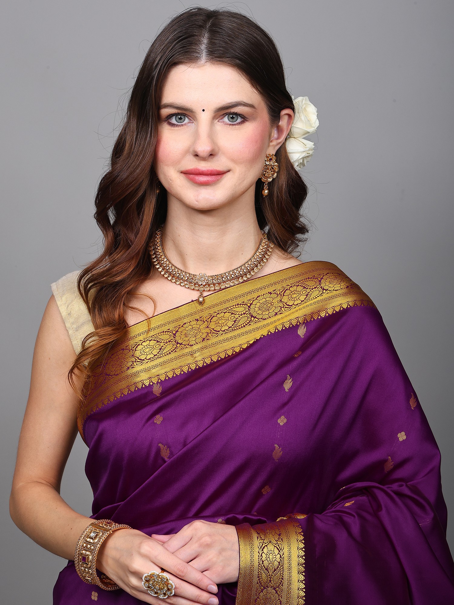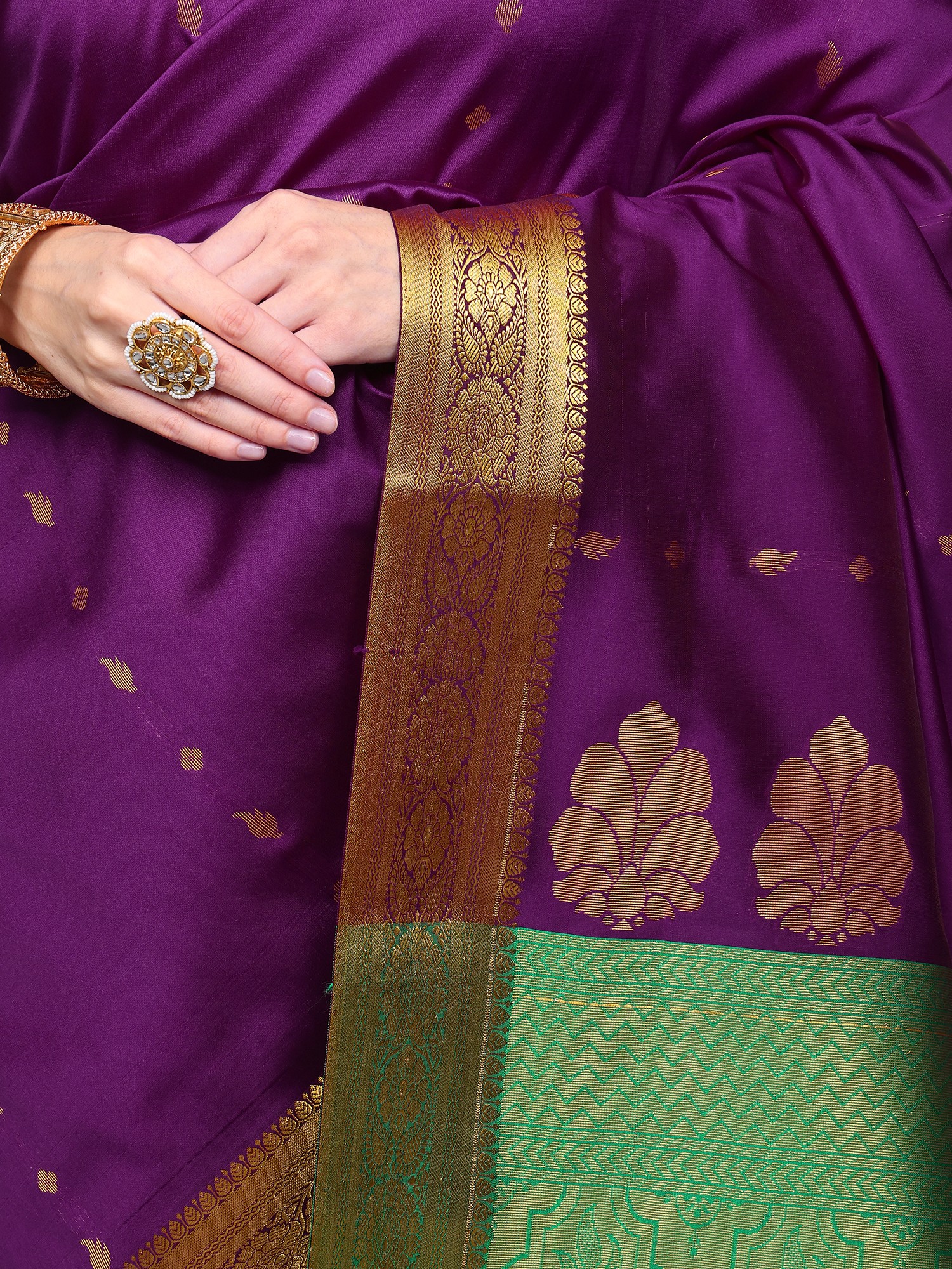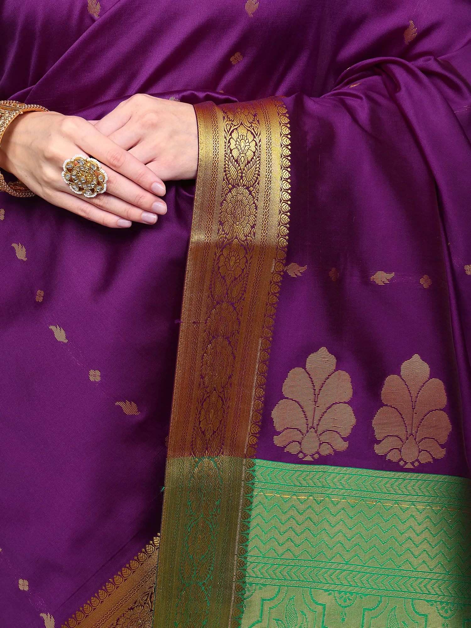 The true magic of this saree lies in its meticulously woven details. Adorned with delicate zari bootis scattered across its expanse, the fabric shimmers with a subtle opulence. These tiny, radiant motifs are expertly woven, catching the light and adding a touch of sparkle to the rich purple base. Complementing these charming bootis is a broad, striking border that commands attention. This border features a captivating floral vine pattern, intricately rendered in shimmering zari. The intricate craftsmanship involved in creating this border speaks volumes about the skill of the Banarasi weavers, transforming the saree into a wearable piece of art.