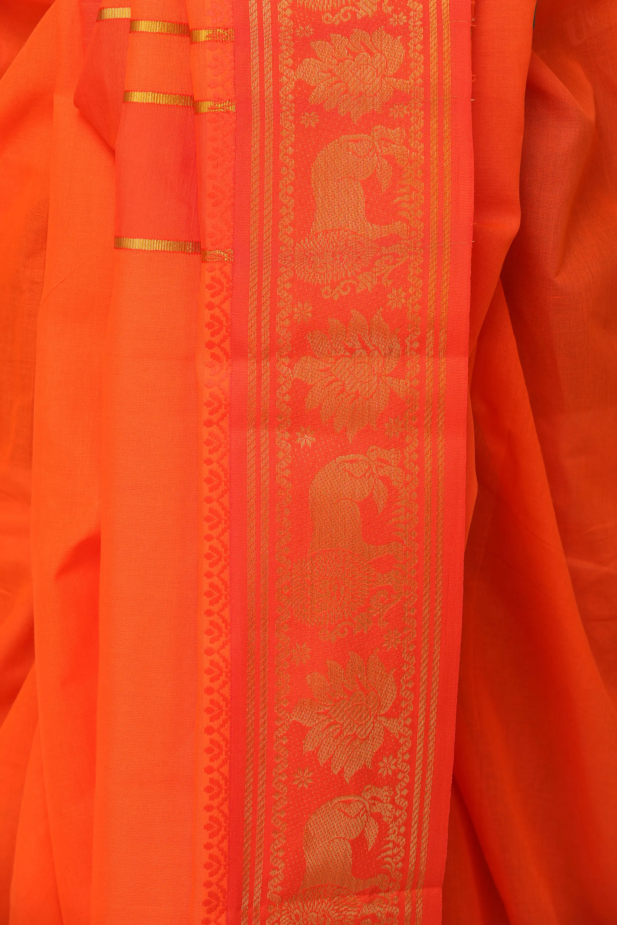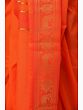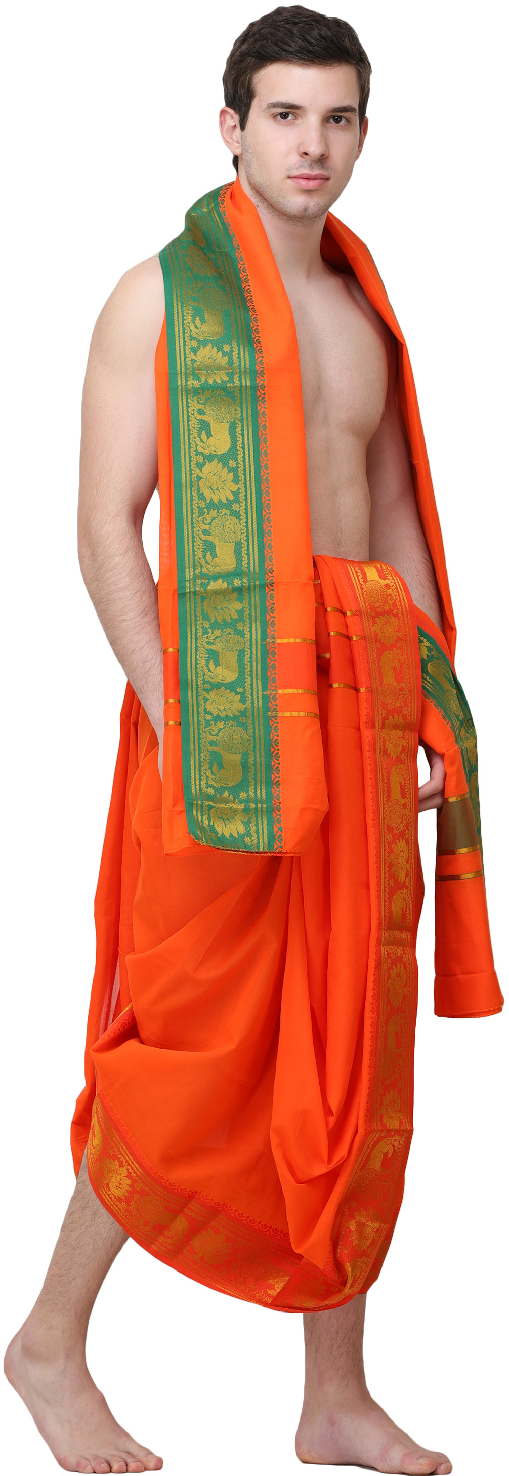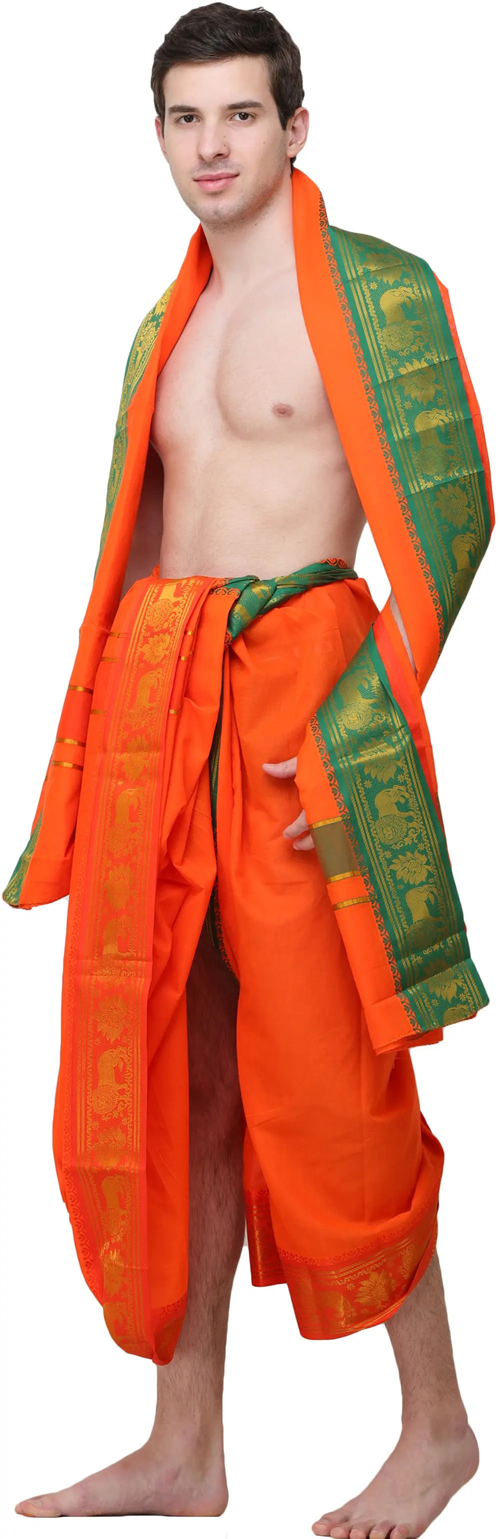 The true artistry of this set lies in its intricate embellishments. The dhoti and the accompanying angavastram are adorned with a rich border, designed to elevate your traditional attire. This border features a captivating interplay of colors and motifs. A deep, emerald green forms the base, providing a beautiful contrast to the vibrant orange fabric. Woven into this green expanse are ornate golden zari patterns, showcasing majestic lions and intricate floral designs. These motifs are not just decorative; they symbolize strength, courage, and prosperity, adding a layer of symbolic depth to the garment. The lustrous zari work catches the light, creating a subtle shimmer that speaks of refined luxury.