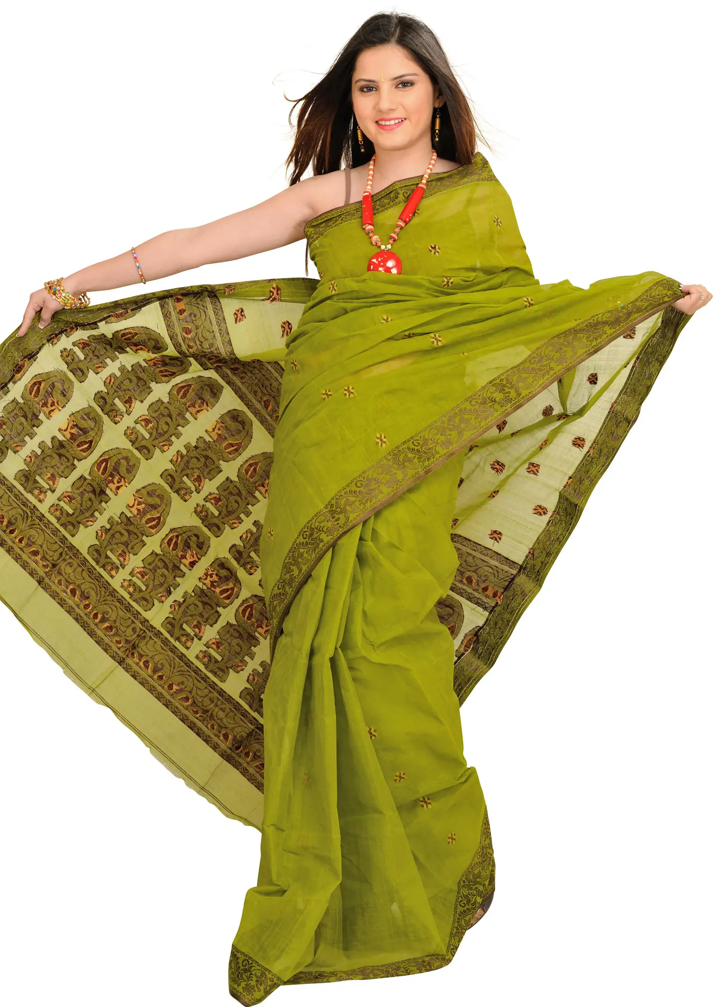 Sudan-Brown Sari from Bengal with Woven Flowers on Aanchal
