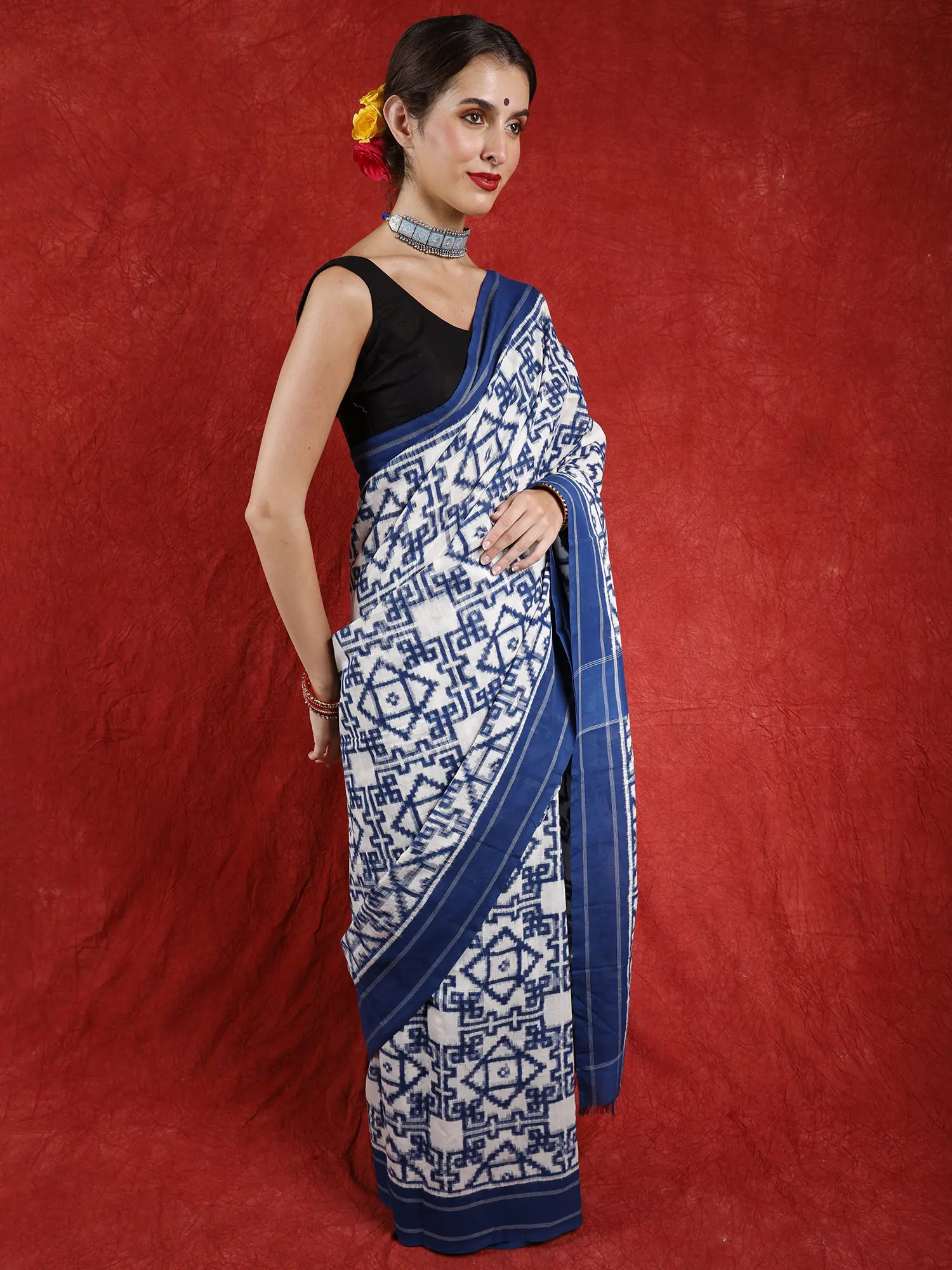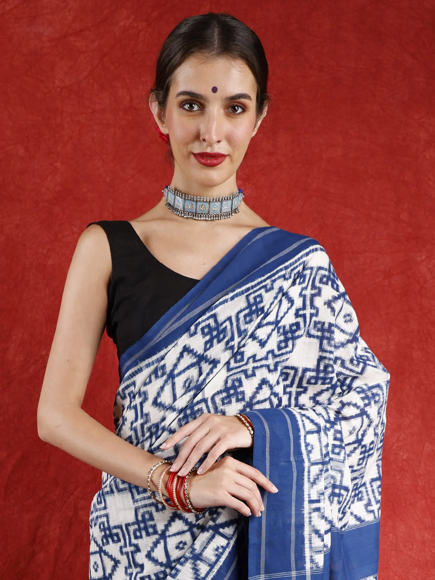 Star-White Pure Cotton Handloom Saree from Pochampally with All-over Ikat Weave and Contrast Border
