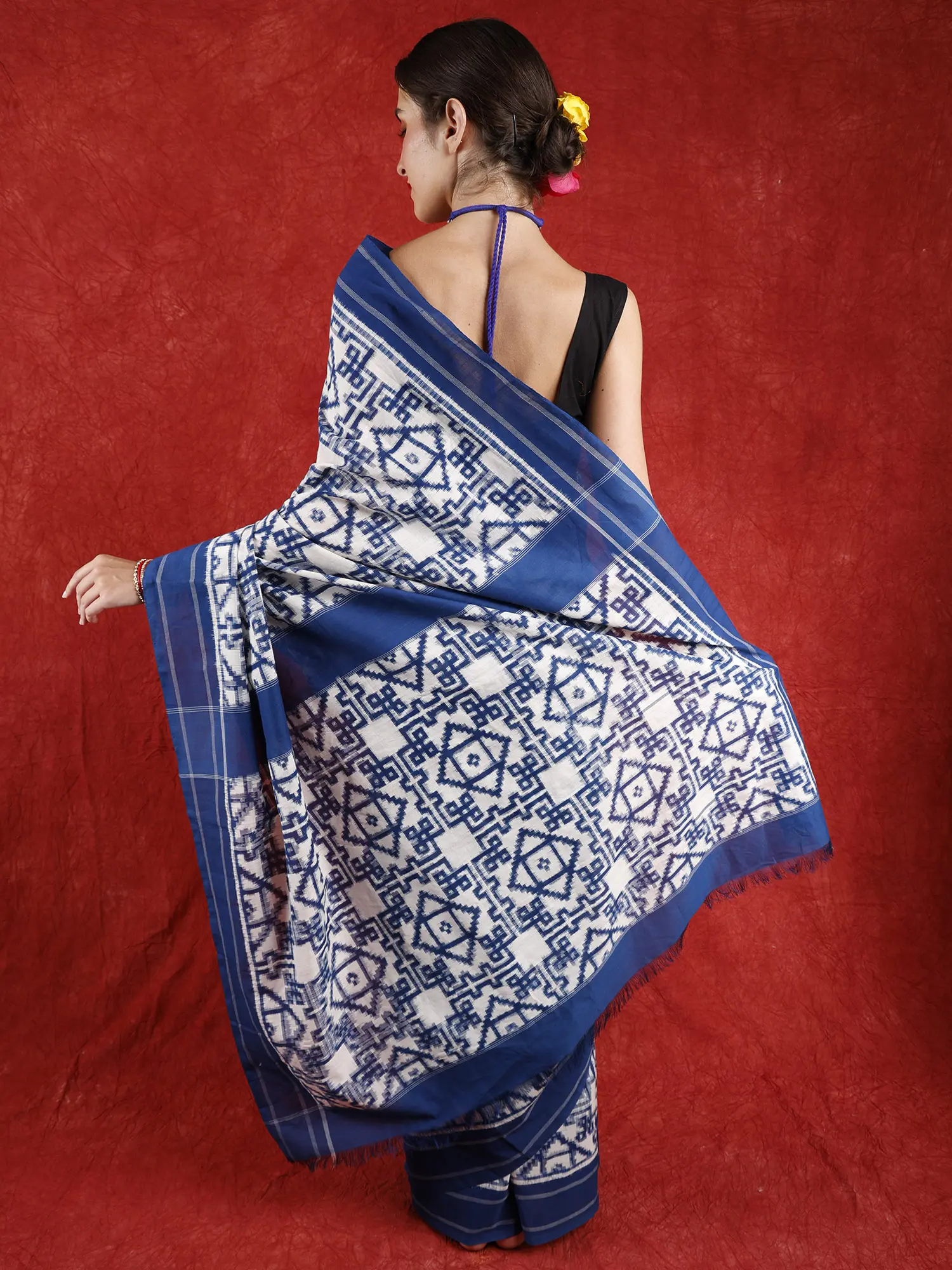 The allure of this saree lies in its mesmerizing all-over Ikat weave. Ikat, a dyeing technique where patterns are resist-dyed onto yarn before weaving, creates a unique, almost tie-dye effect with blurred edges that are characteristic of its artistry. The intricate geometric patterns, rendered in a striking contrast of star-white and deep indigo blue, evoke a sense of timeless elegance. Each motif is meticulously woven by skilled artisans, showcasing hours of dedication and a deep understanding of their craft. The repetitive yet varied patterns create a captivating visual rhythm across the expanse of the saree, making it a true work of wearable art. ––––––––––––––––––––