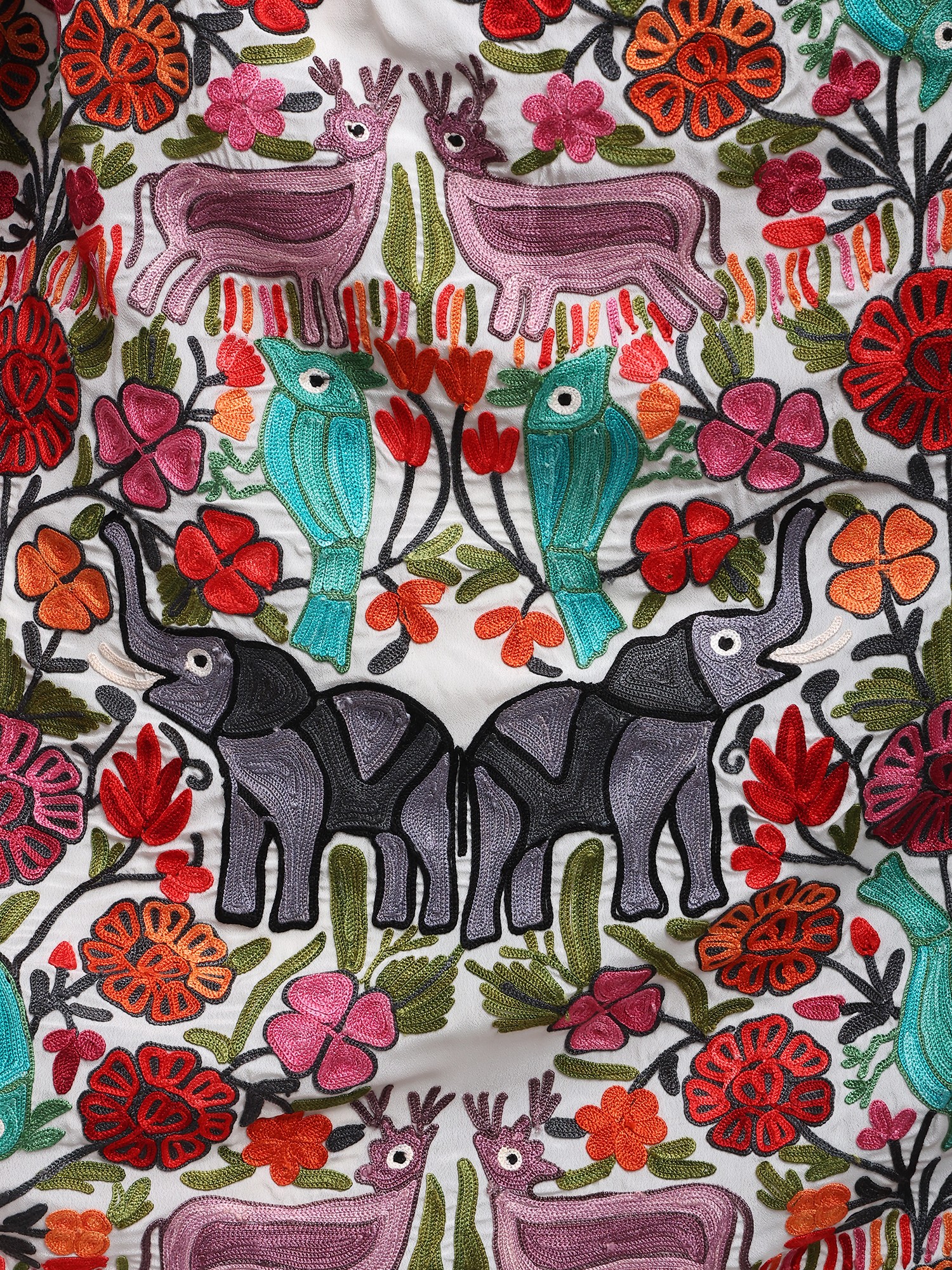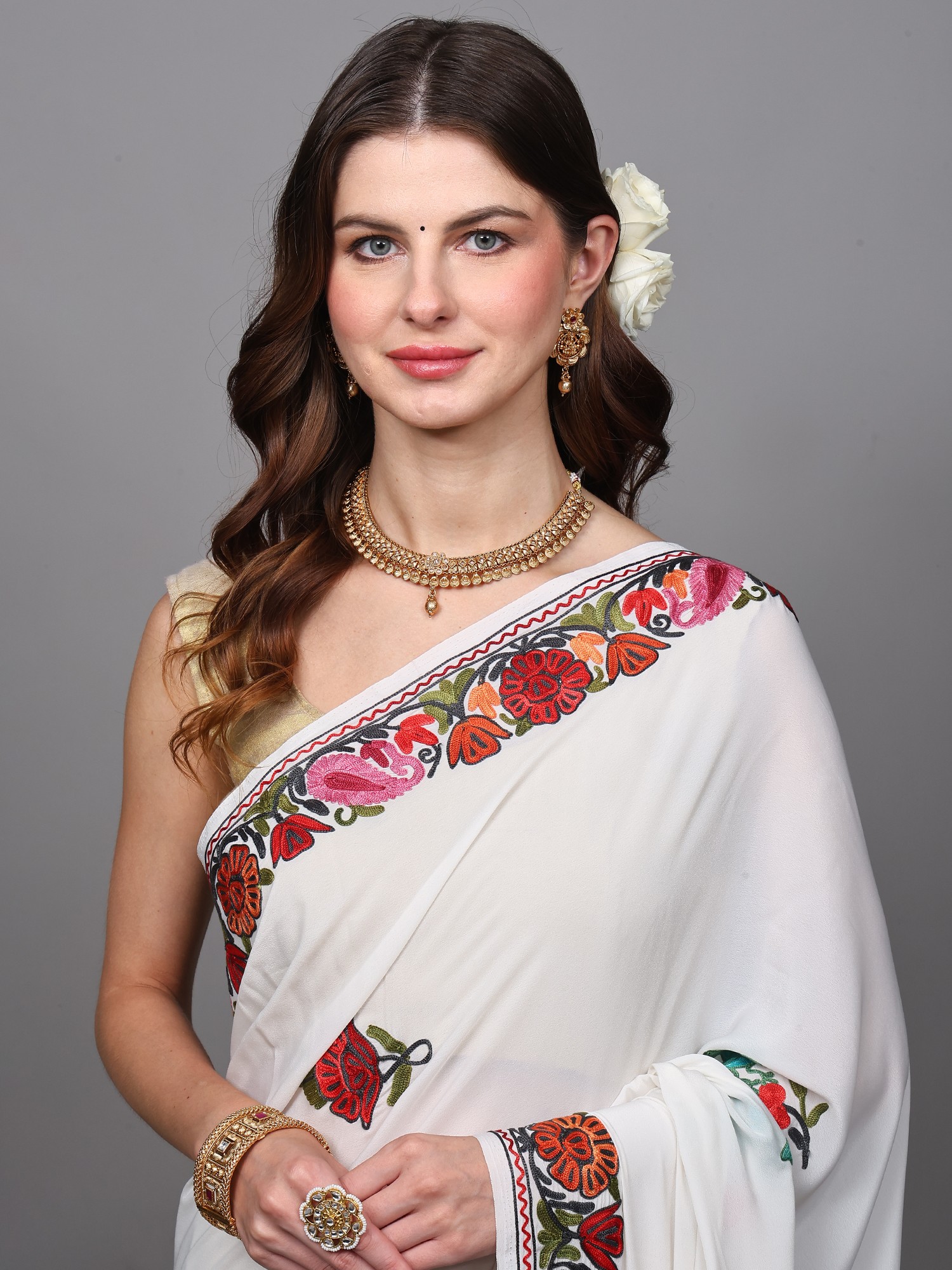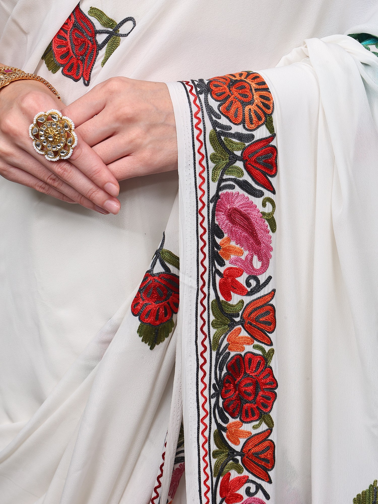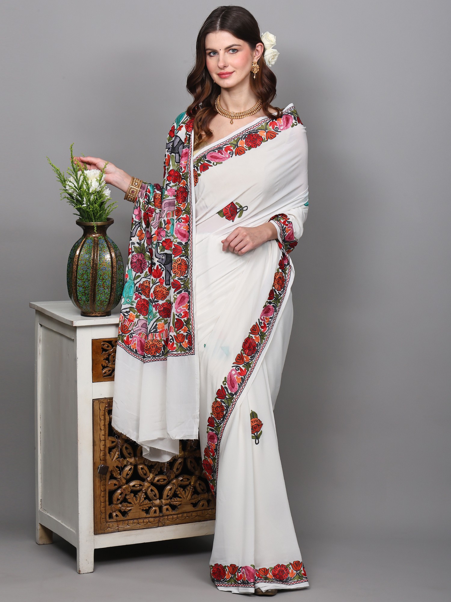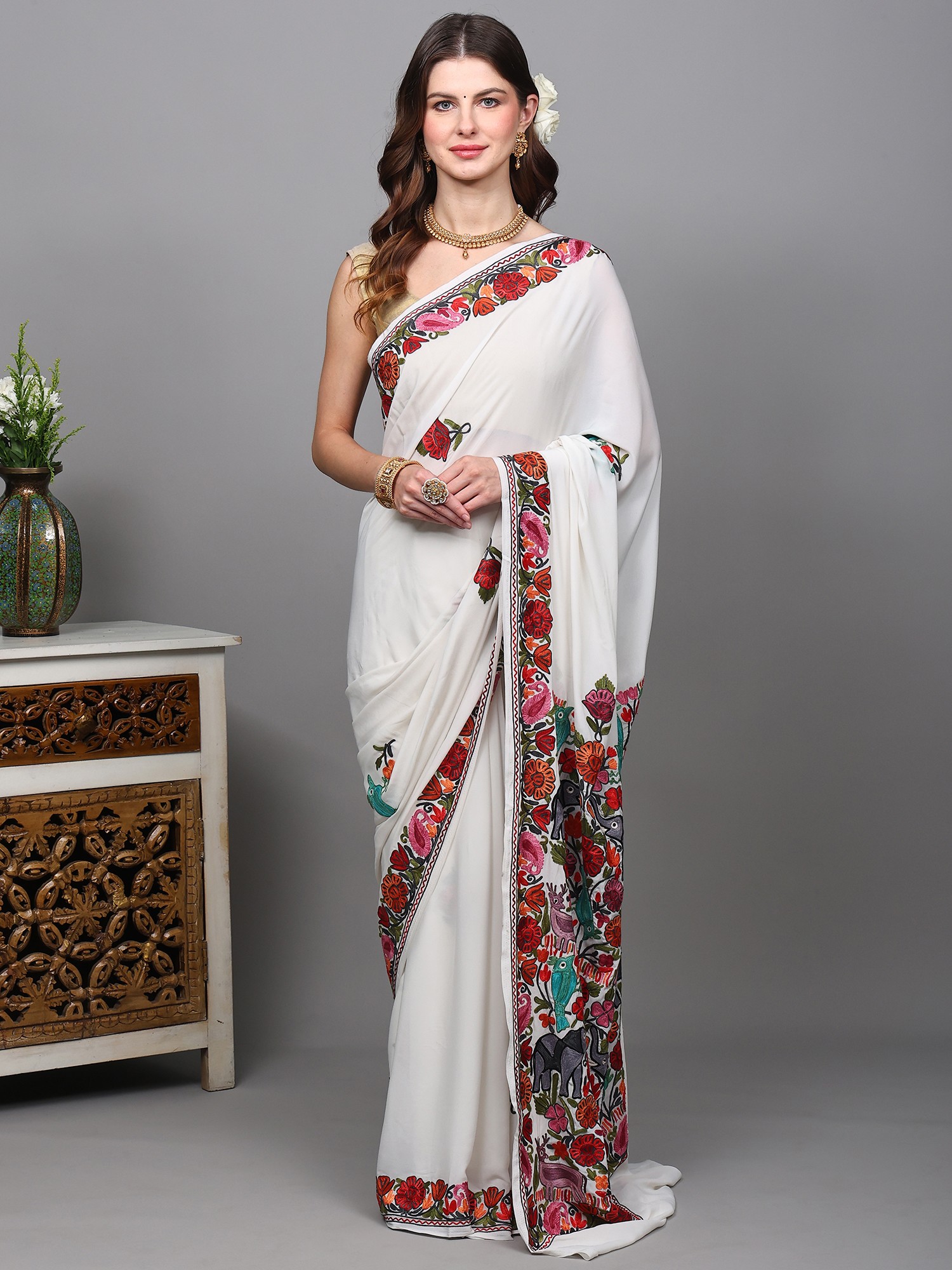 Ochre Red Kashmiri Saree with Aari-Embroidered