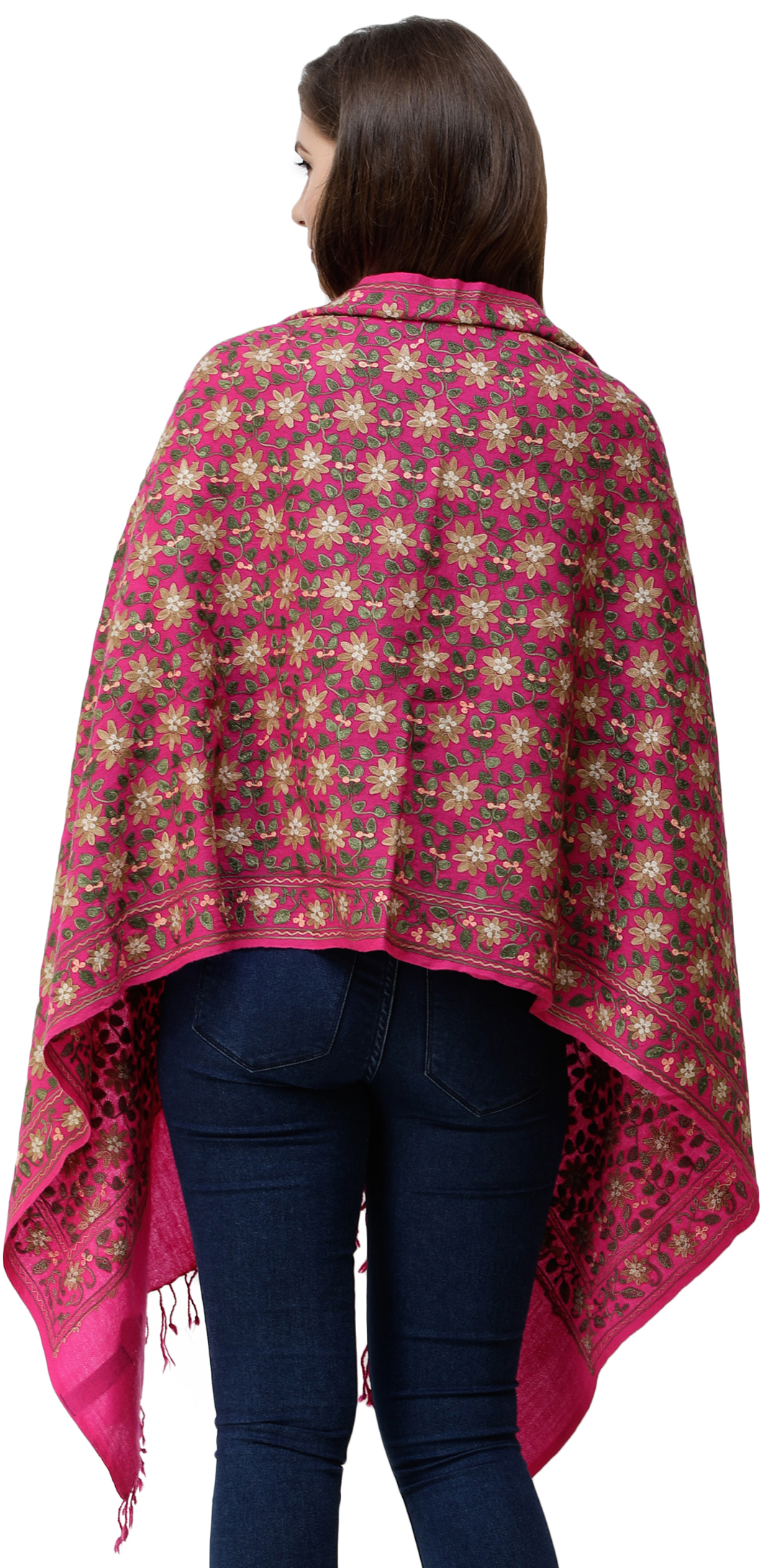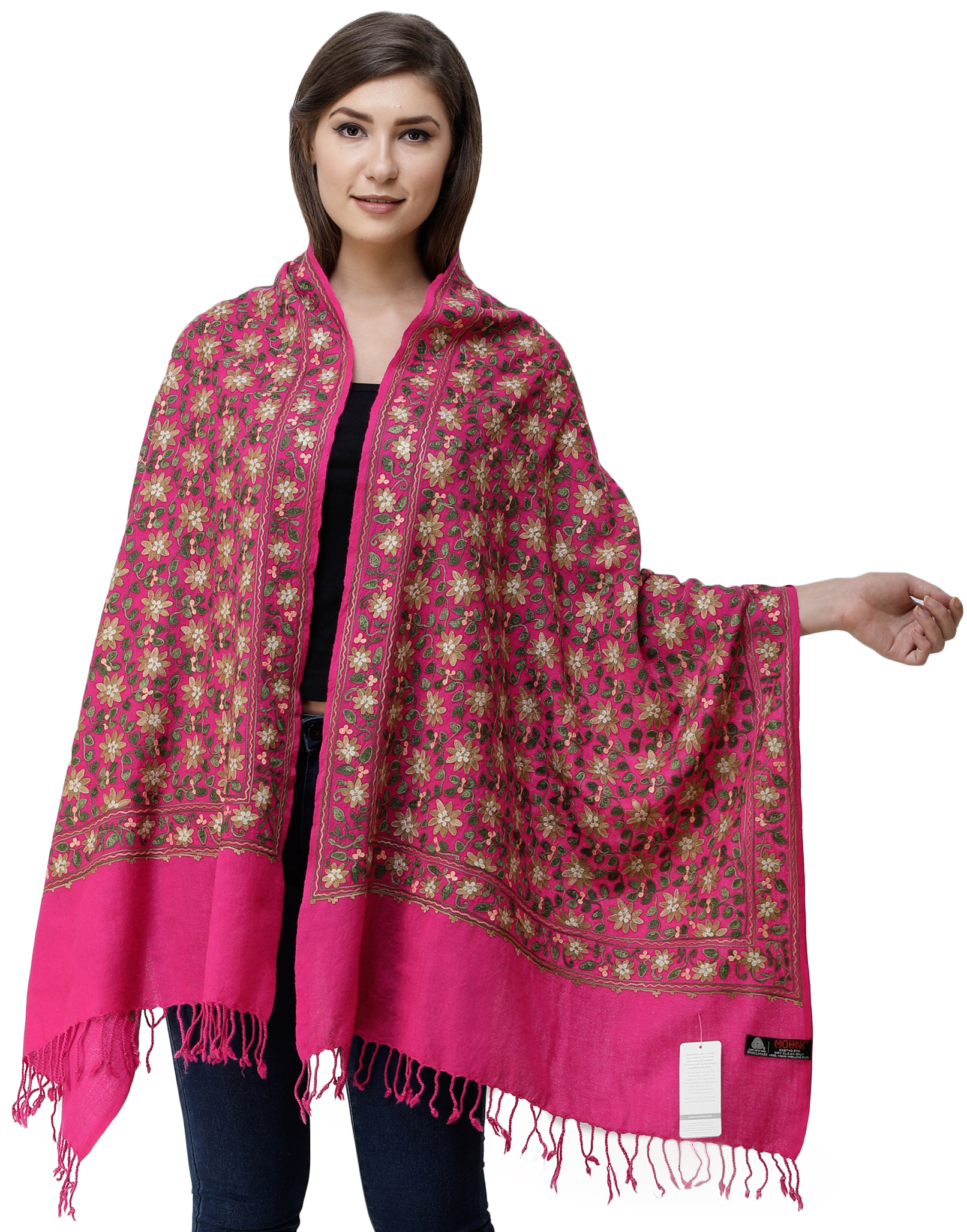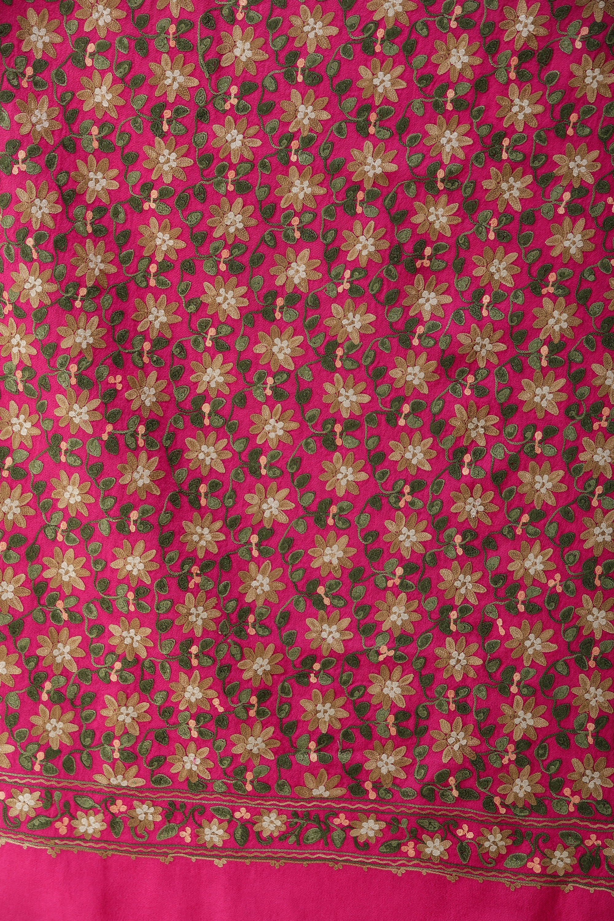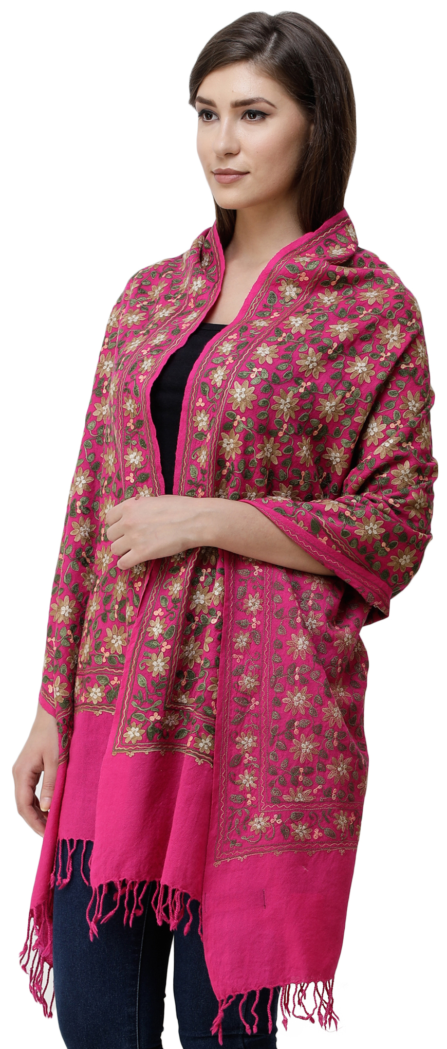 The design is a celebration of nature's bounty, with delicate flowers and lush foliage meticulously embroidered to create a rich, textured effect. The contrast between the deep, classic black of the wool and the lively reds and greens of the embroidery creates a striking and elegant statement. The Aari embroidery technique, characterized by its fine chain stitch, lends a dimensional quality to the patterns, making each flower and leaf appear to almost bloom from the fabric. This detailed artistry ensures that no two stoles are ever exactly alike, offering you a truly individual expression of style.