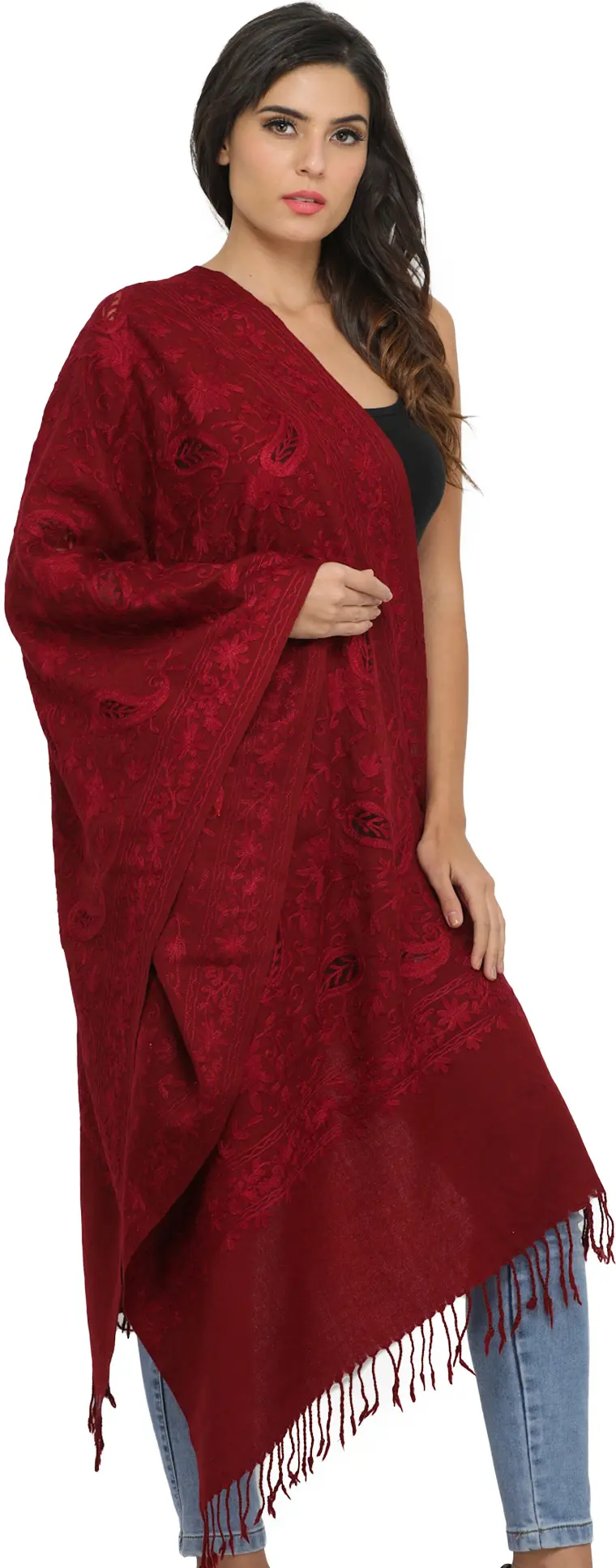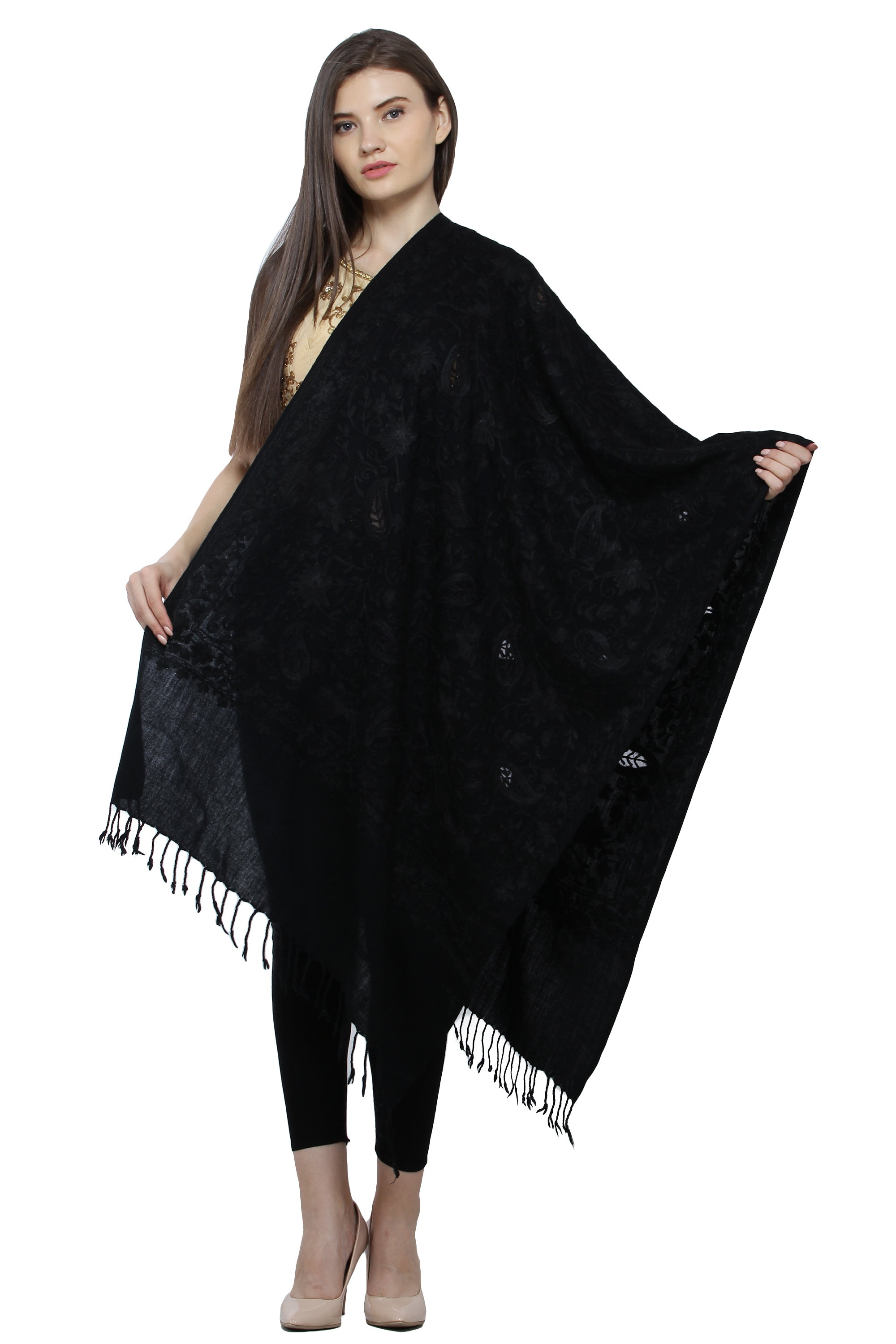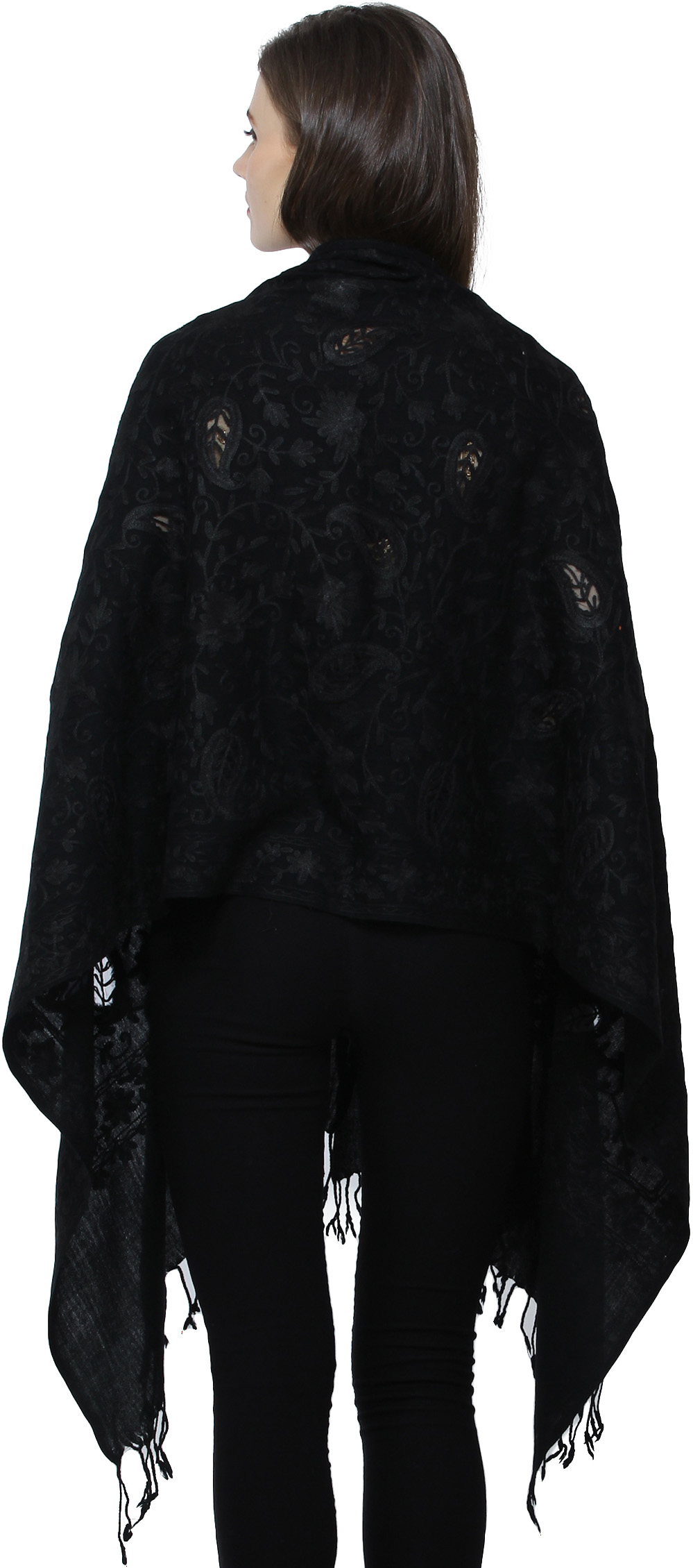 The Aari embroidery is a standout feature of this stole. Characterized by its distinctive chain-stitch, this technique allows for the creation of dense, elaborate patterns. On this particular stole, the embroidery is rendered in a self-colored thread, which creates a subtle yet captivating textural contrast against the pure wool. The motifs are a harmonious blend of classic paisley shapes, each elegantly outlined and filled, interspersed with delicate floral elements. The borders are particularly striking, featuring a more concentrated band of intricate patterns, framing the central field of paisleys and blossoms. This monochromatic approach lends a sophisticated and timeless appeal, allowing the quality of the embroidery to truly shine.