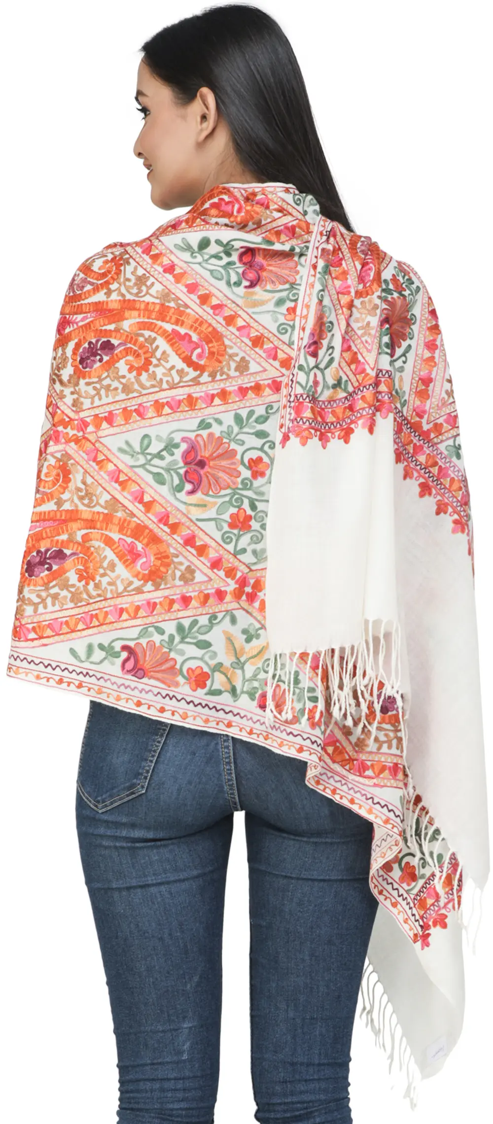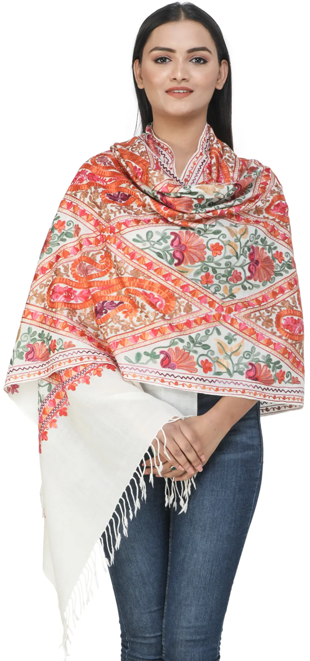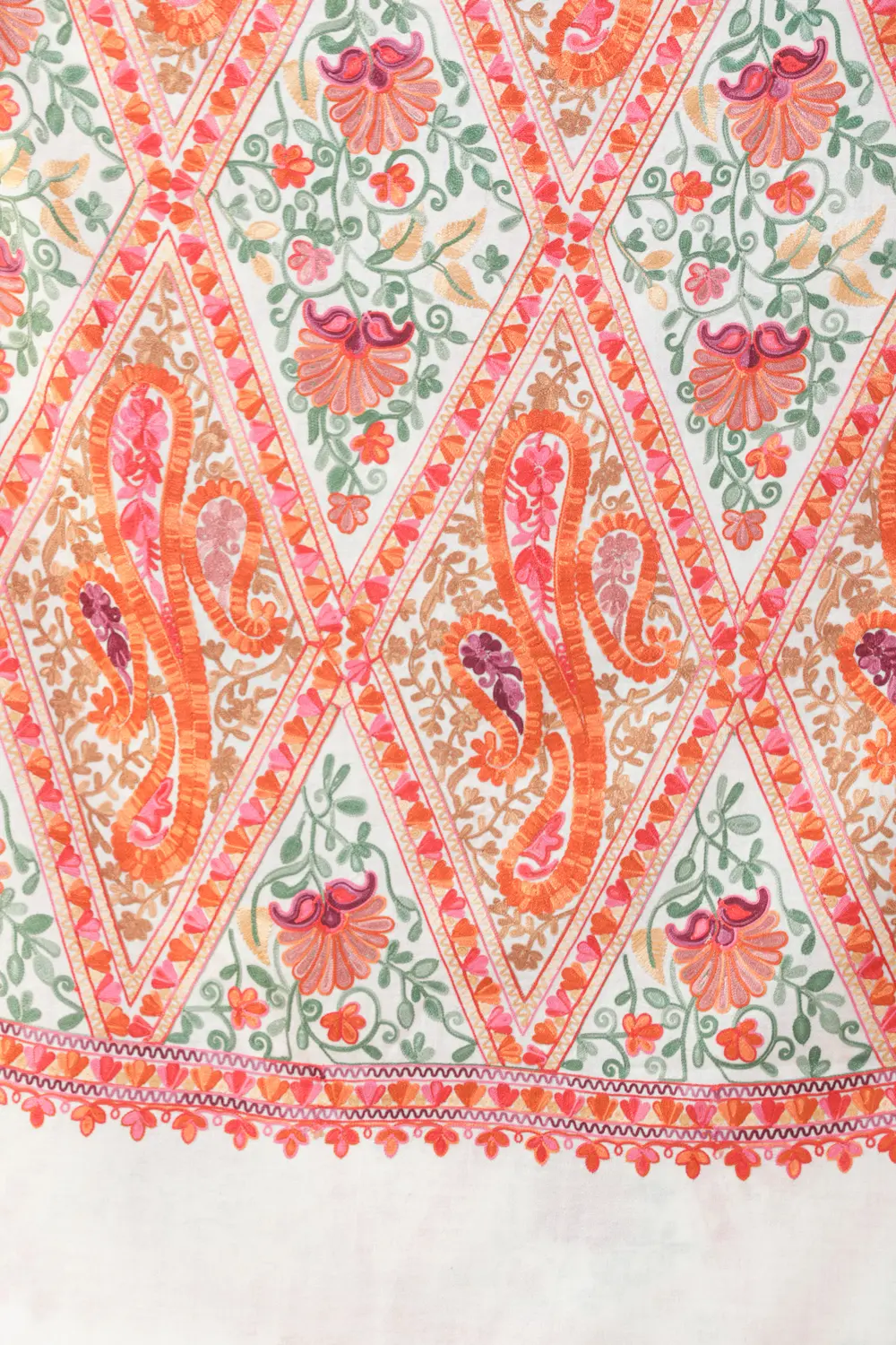 Kashmiri artisans have lent their expertise to this exquisite stole. The intricate Aari-embroidered paisleys and flowers sprawl across the fabric in vivid, multicolored threads. This design has been passed down through generations. Its timeless elegance and unparalleled artistry have been adapted to fit today's fashion landscape. This stole encapsulates the rich cultural tapestry of Kashmir, making it a valuable piece that combines heritage with contemporary style.