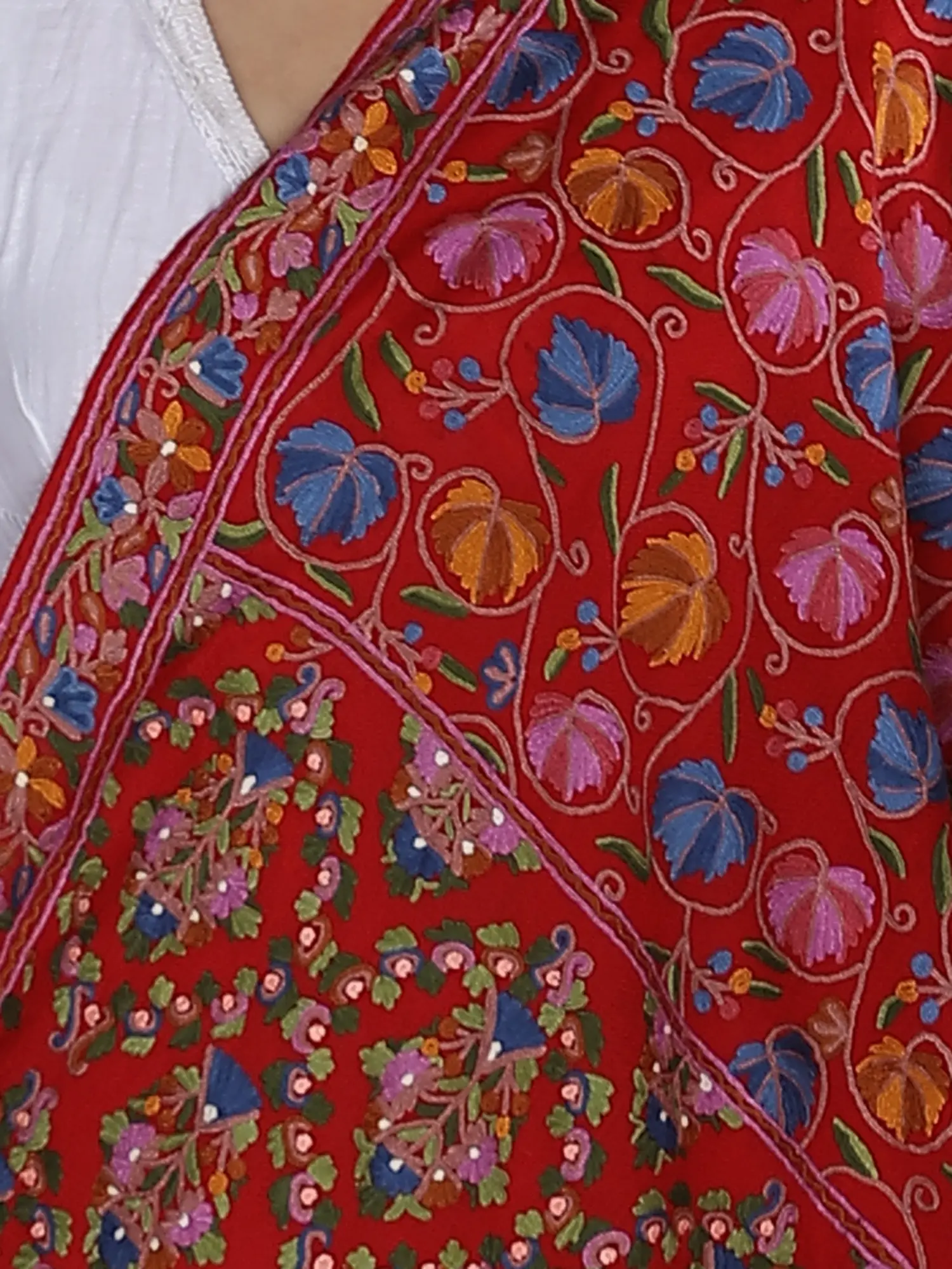 Experience the exquisite craftsmanship of Kashmir with this stunning pure wool stole, a true masterpiece of traditional Aari embroidery. The rich, vibrant red hue serves as a captivating canvas for an intricate tapestry of Chinar leaves and delicate floral motifs. Each stitch is a testament to the skill and dedication of artisans who have honed their craft over generations, transforming simple wool into a wearable work of art.